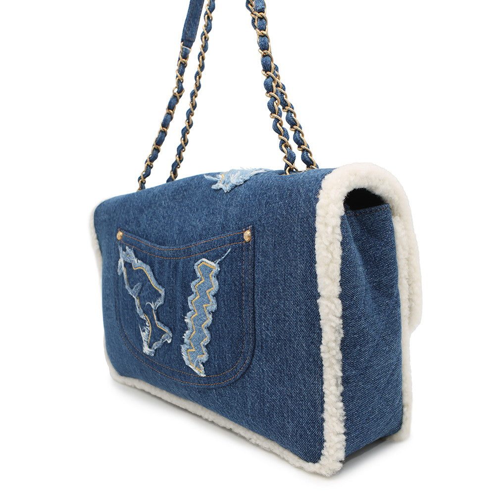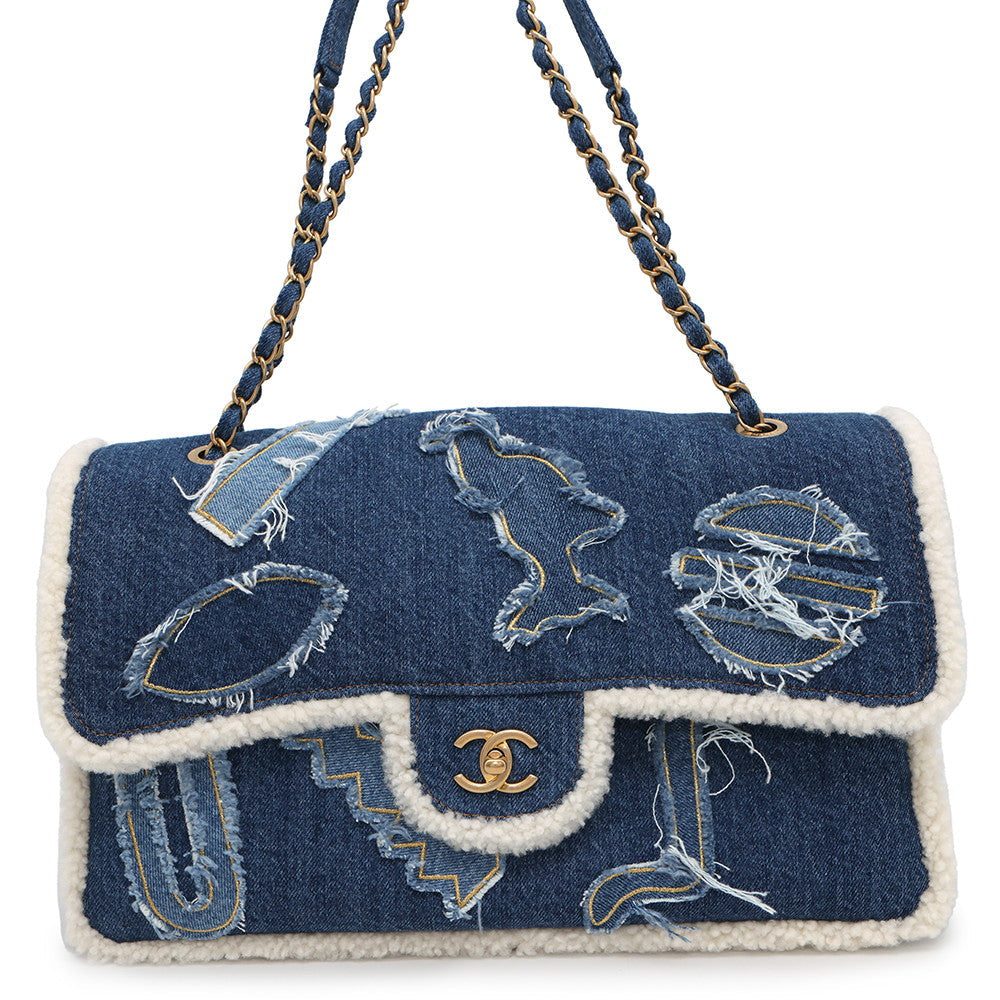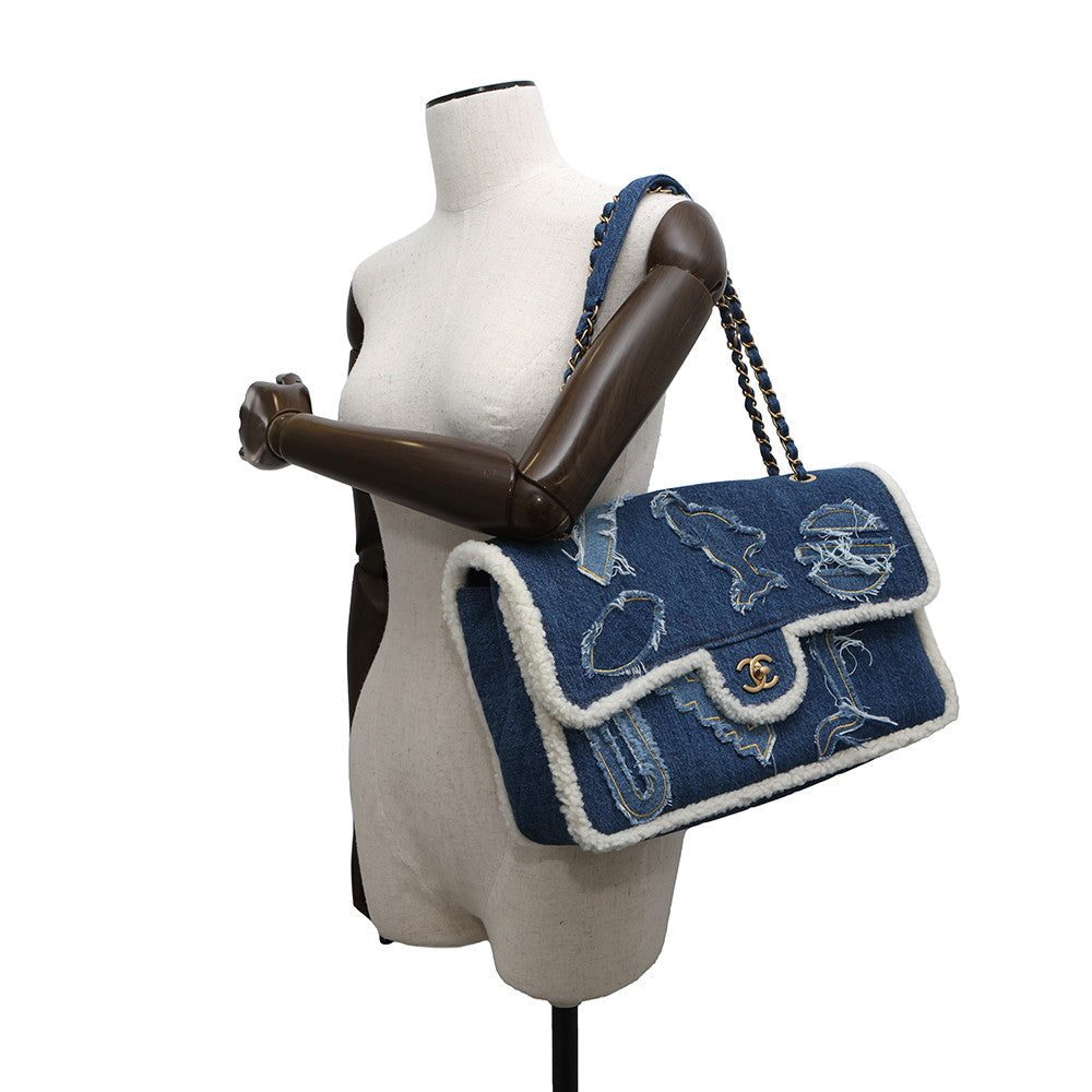 CHANEL Egyptian Line Single Flap Double Chain Shoulder Bag Blue Denim MoutonCHANEL Egyptian Line Single Flap Double Chain Shoulder Bag Blue Denim Mouton