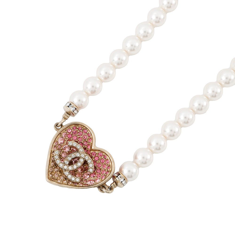 CHANEL Heart Rhinestone Pearl Long Necklace Pink Gold Plated Rhinestone Faux Pearl