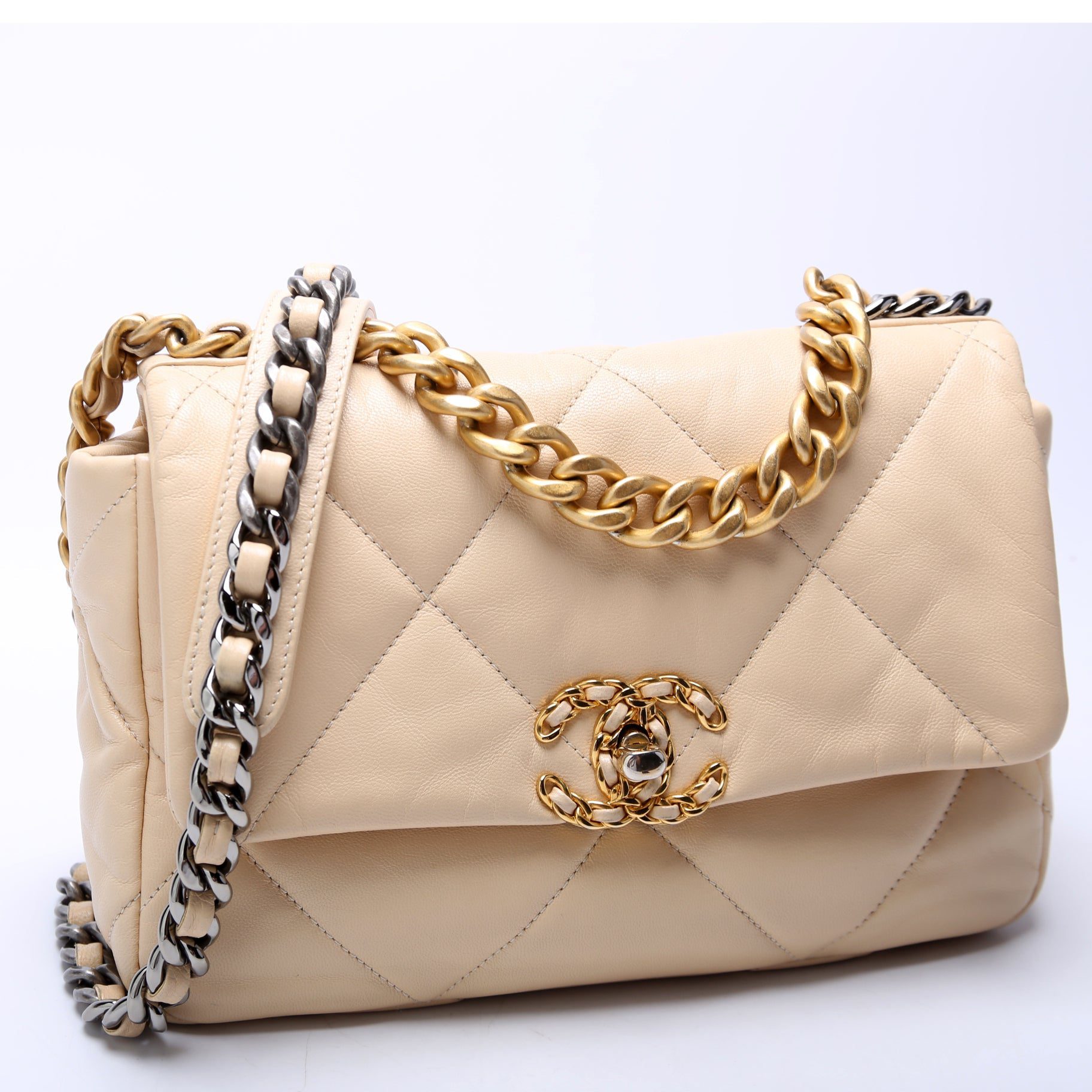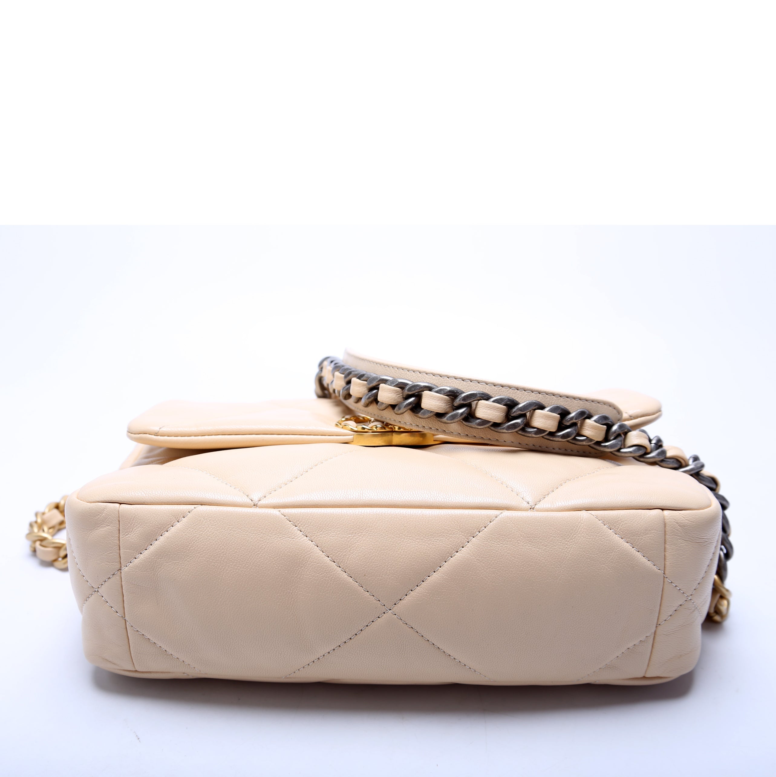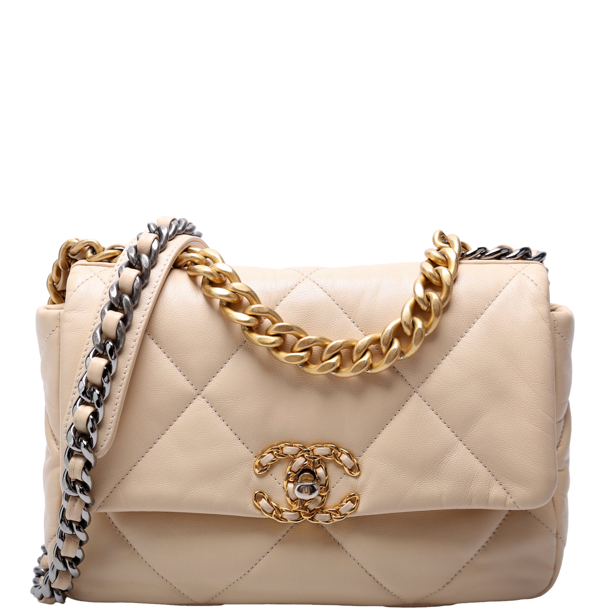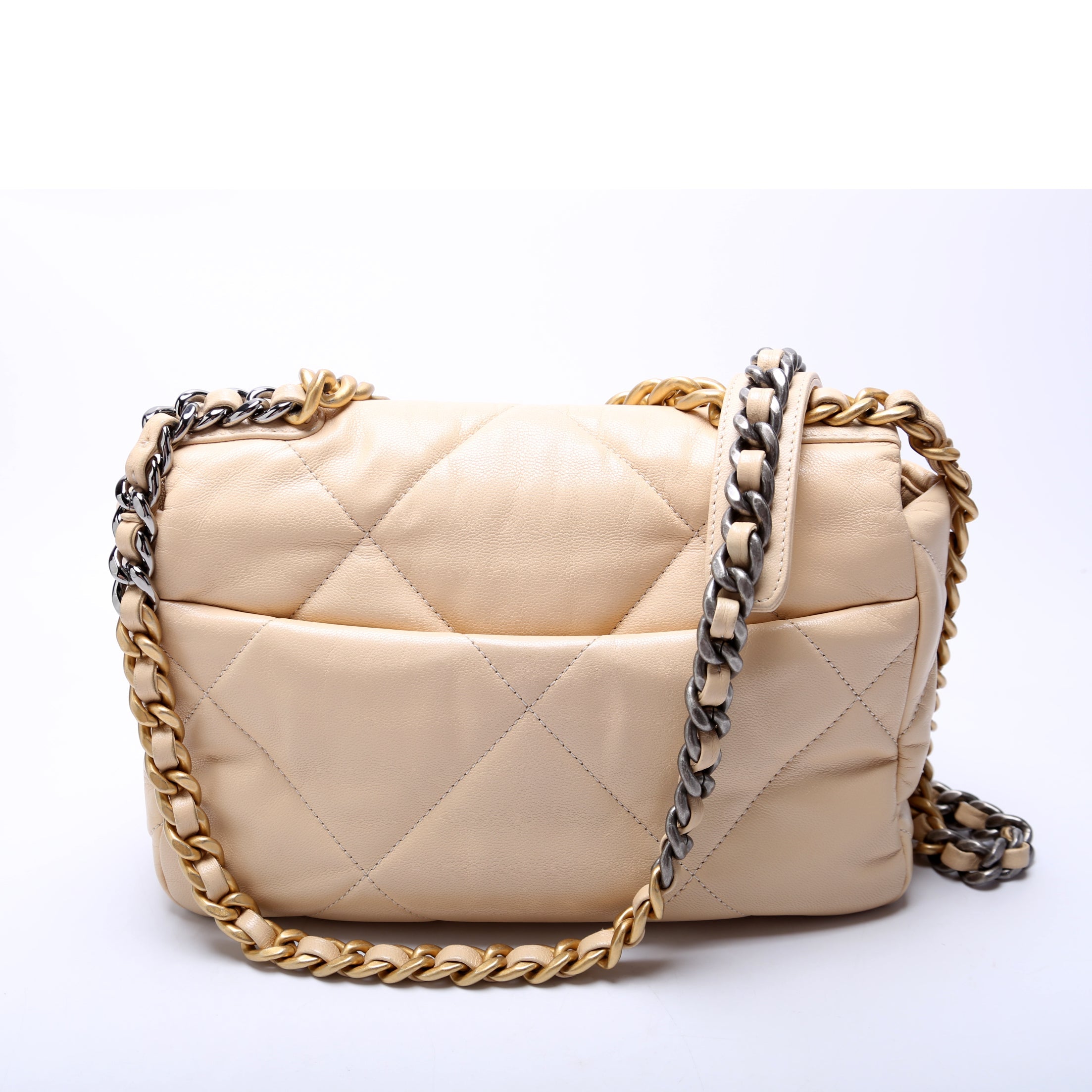 Chanel 19 Medium Flap. The exterior is in the classic Chanel Goatskin leather.Â