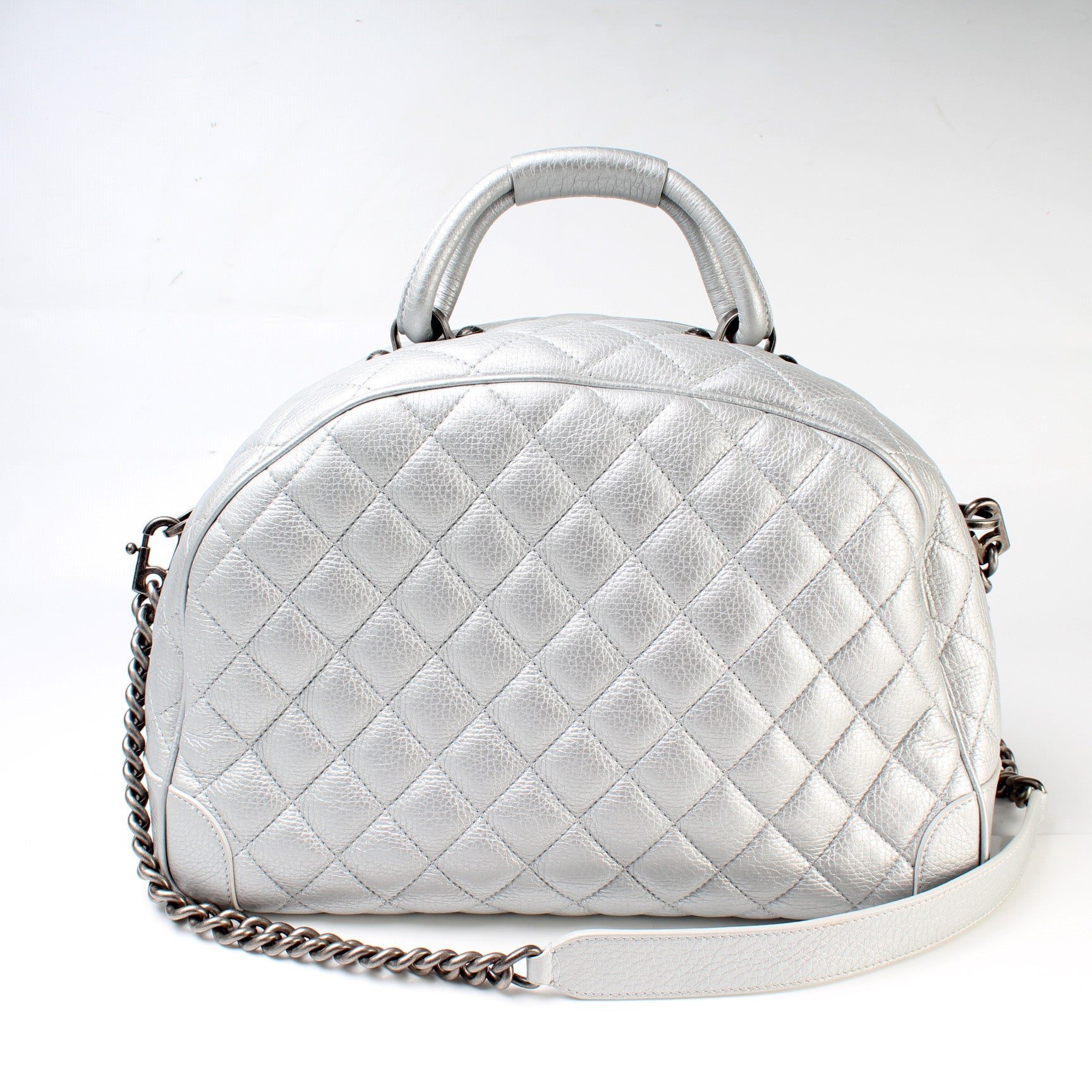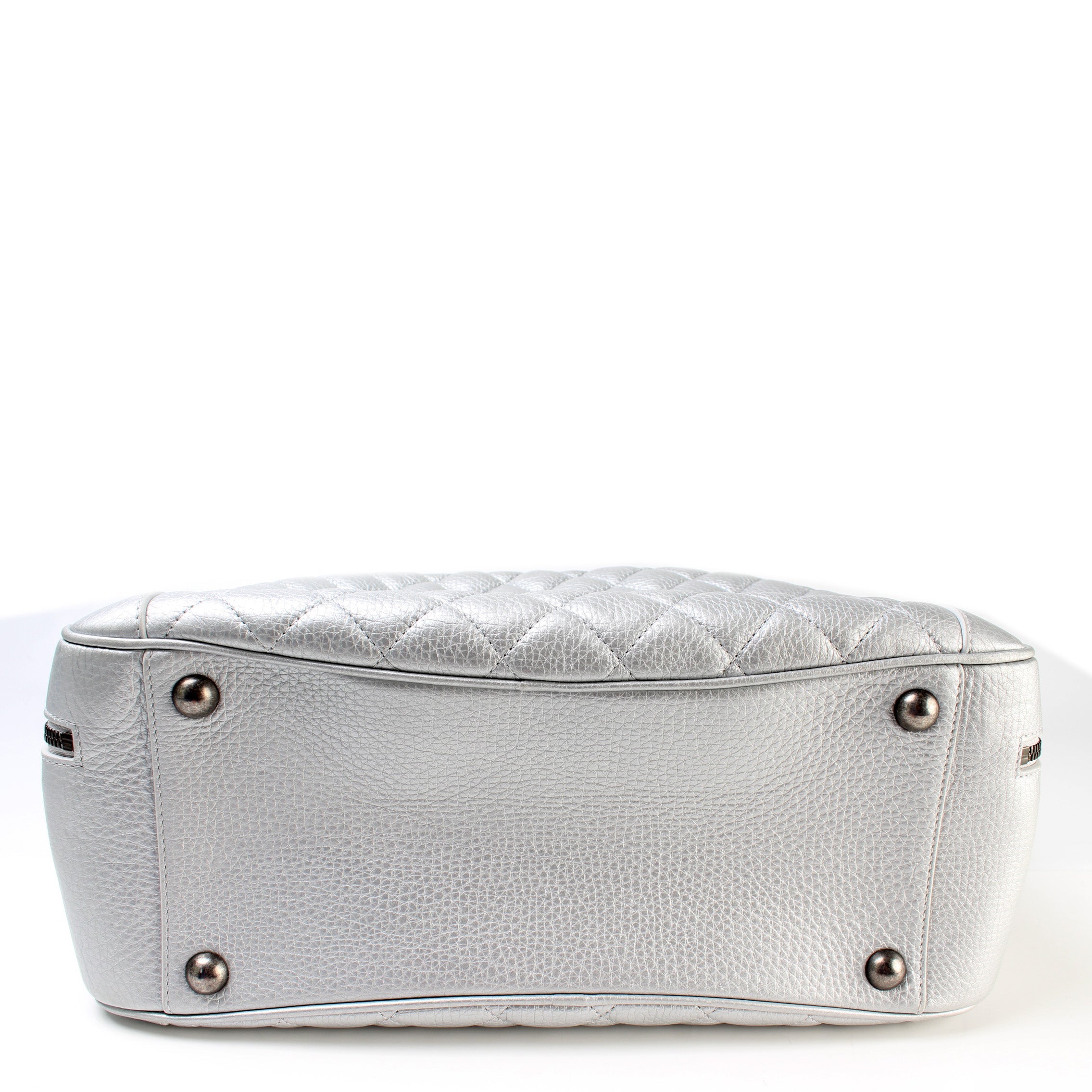 Interior: The interior is clean and free of rips or tears. The interior features two open pockets and one zip closure pocket. There is a red line through the Chanel logo.Â