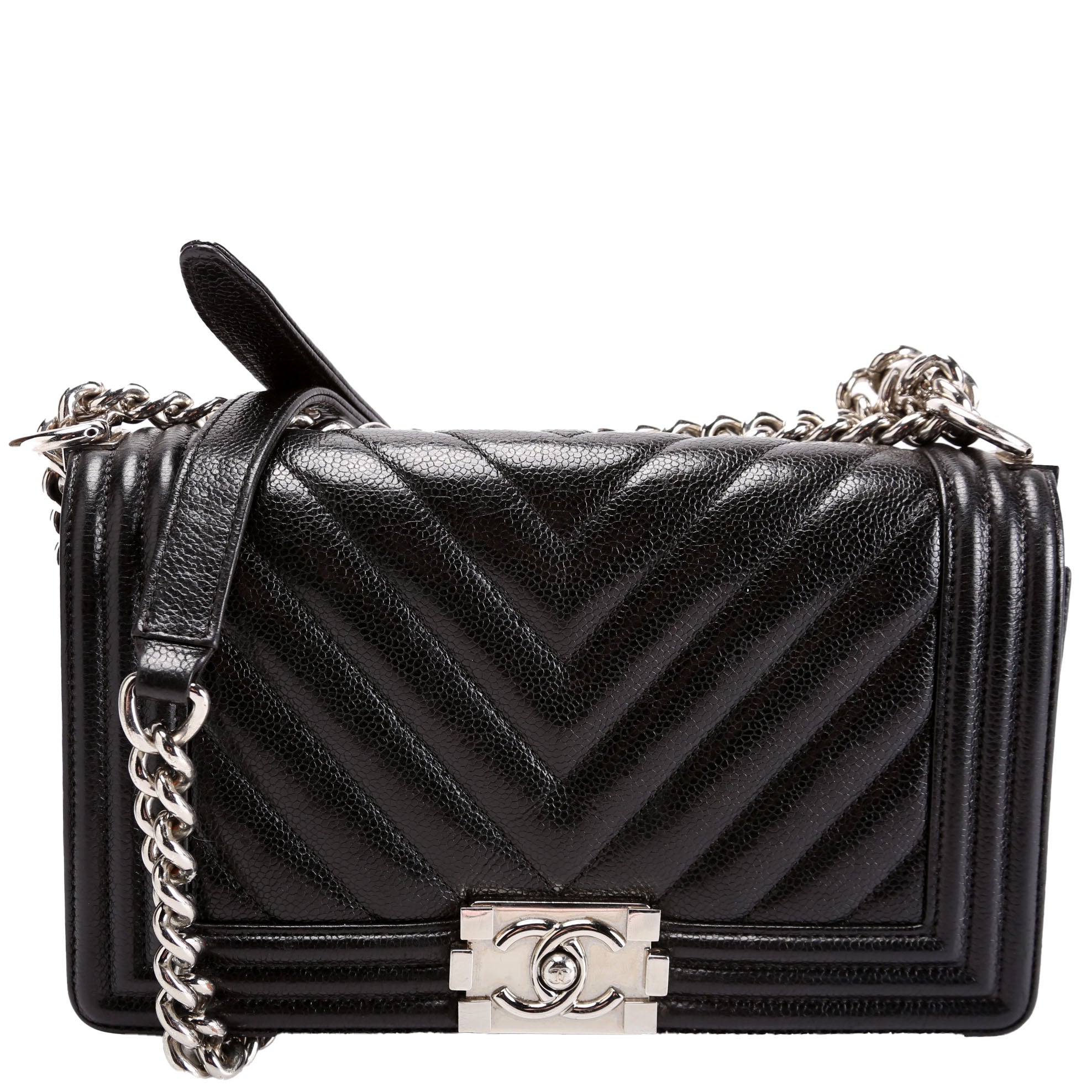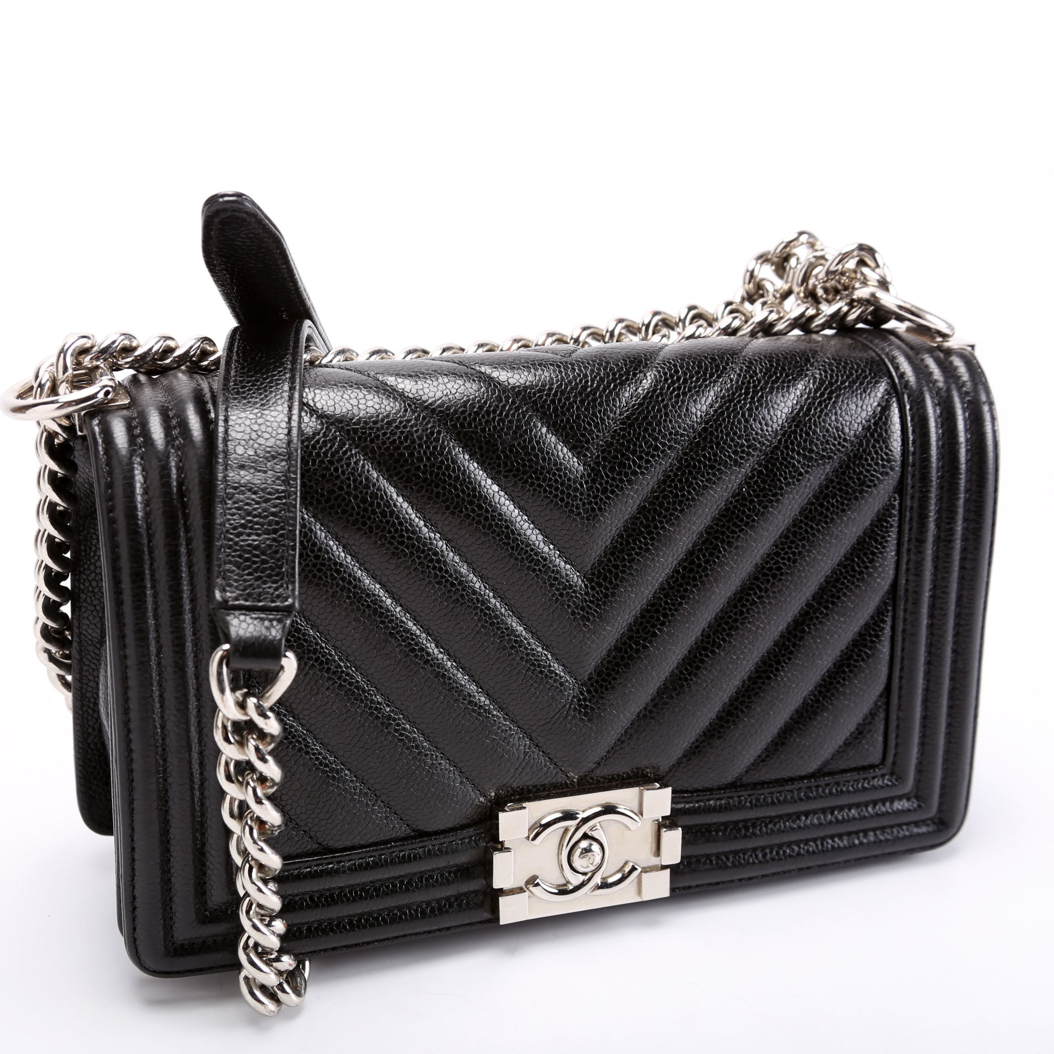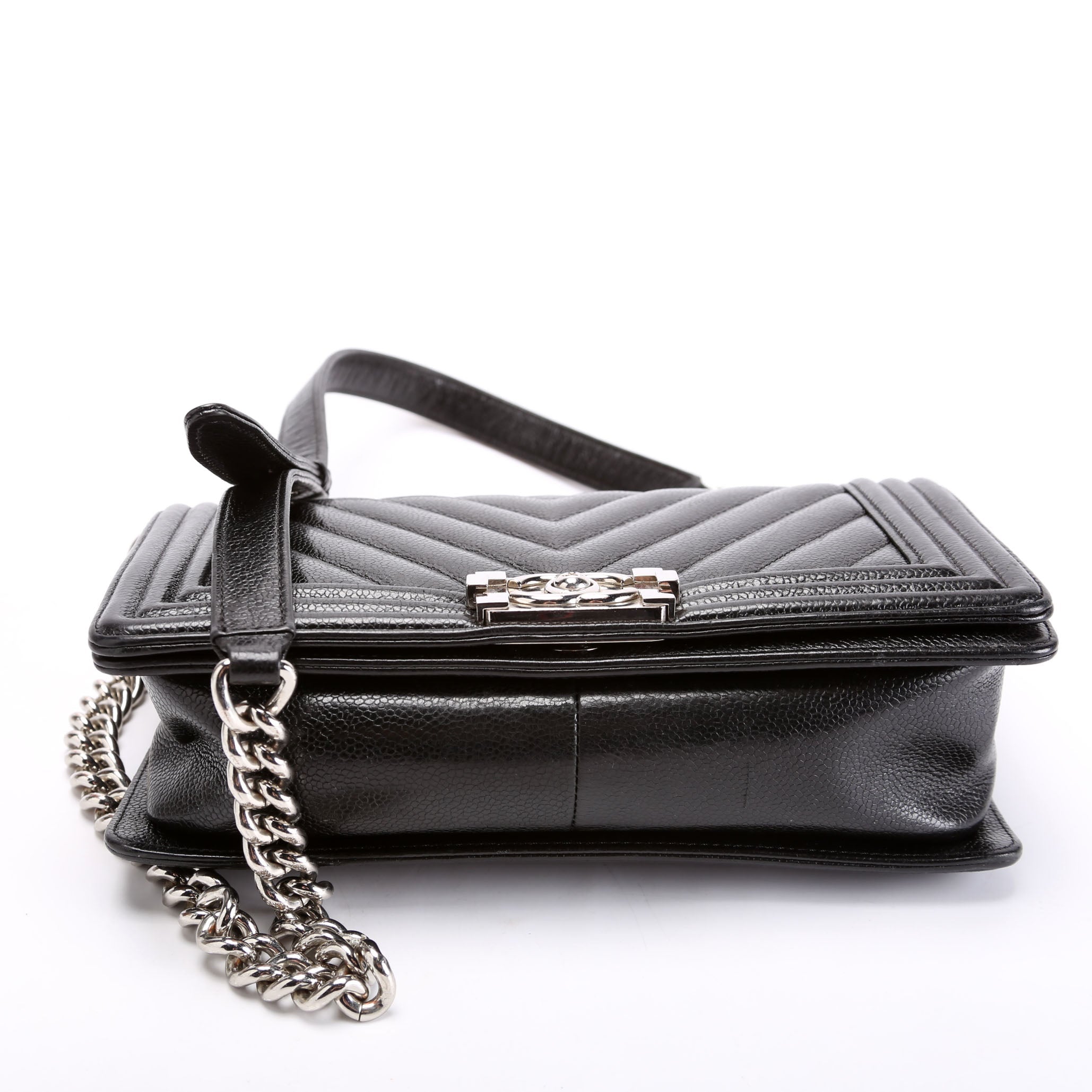 Chanel Boy Flap Medium Chevron Caviar 29M. The exterior is in the classic Chanel Caviar leather.Â