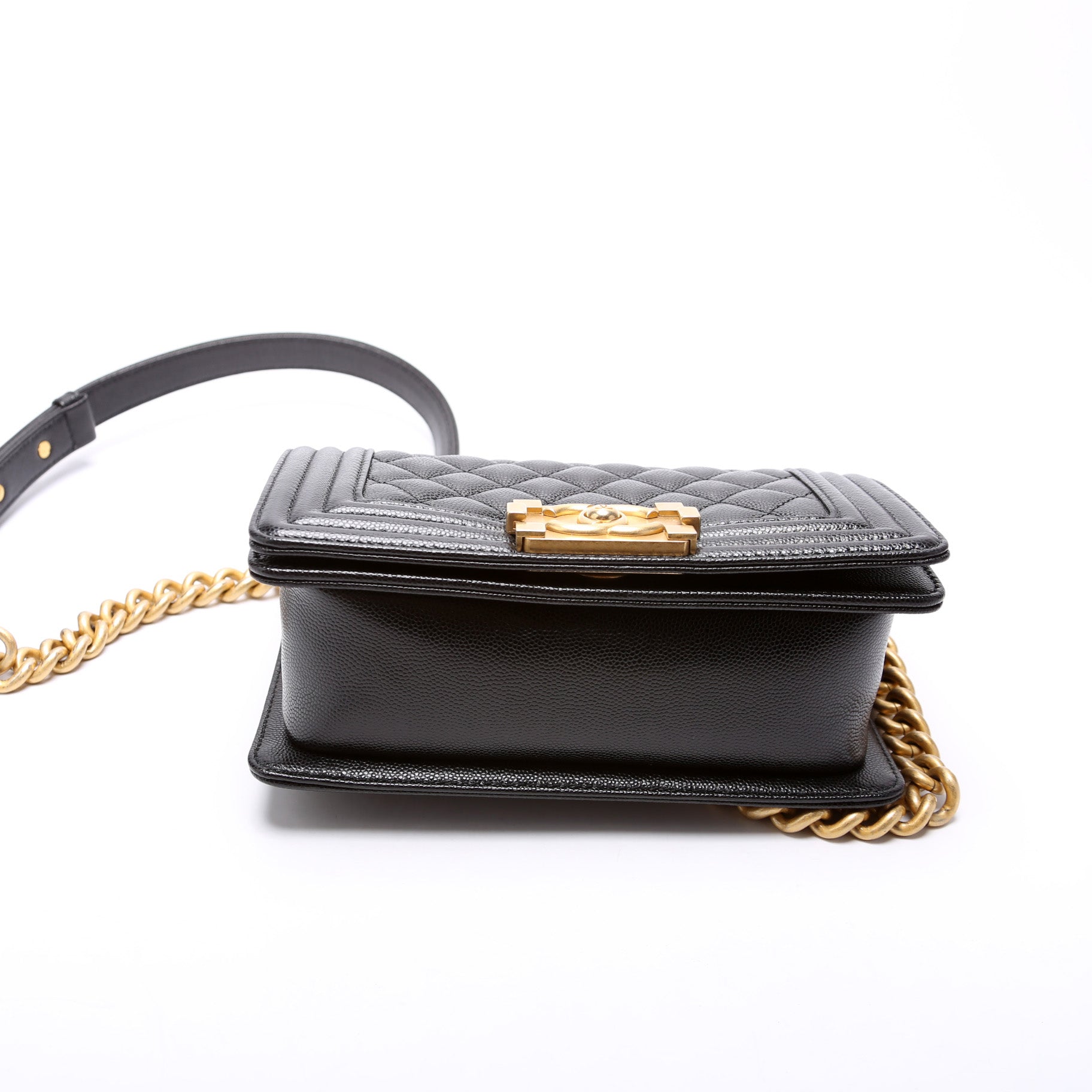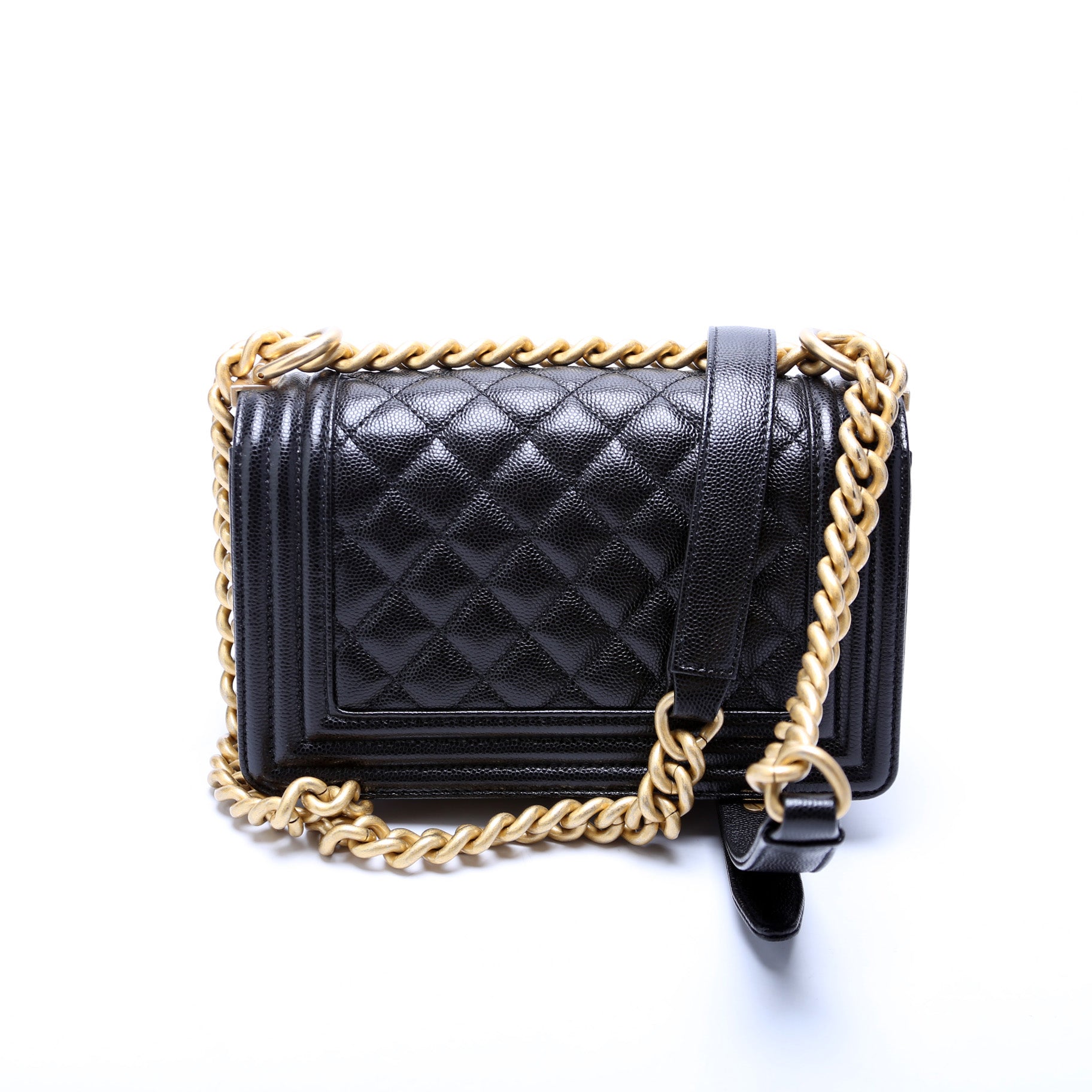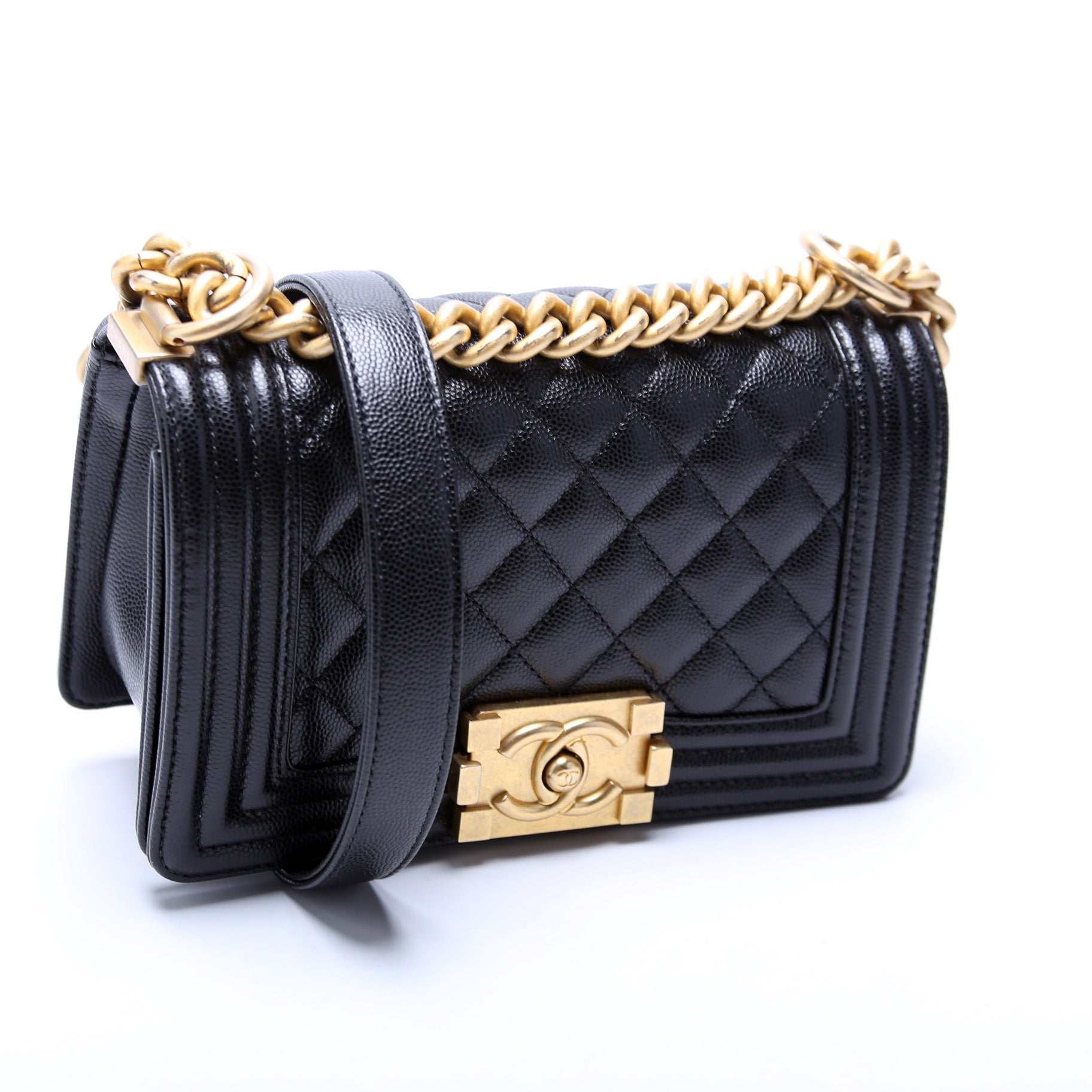 Chanel Boy Flap Small. The exterior is in the classic Chanel Caviar leather.Â
