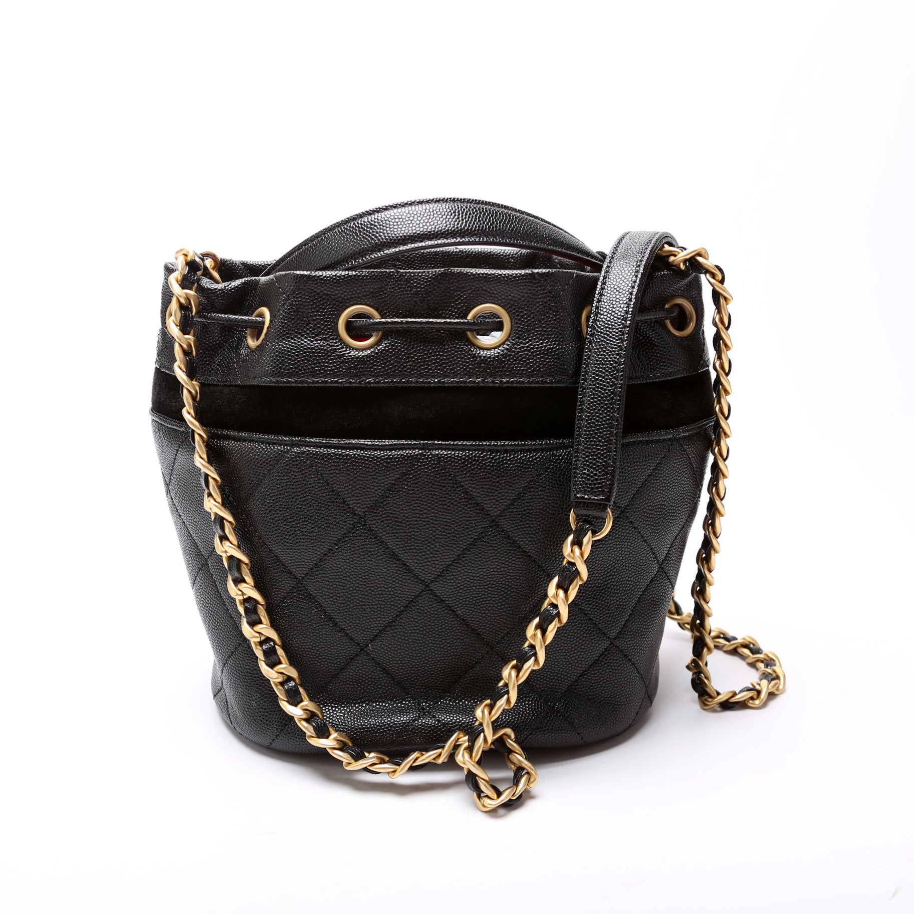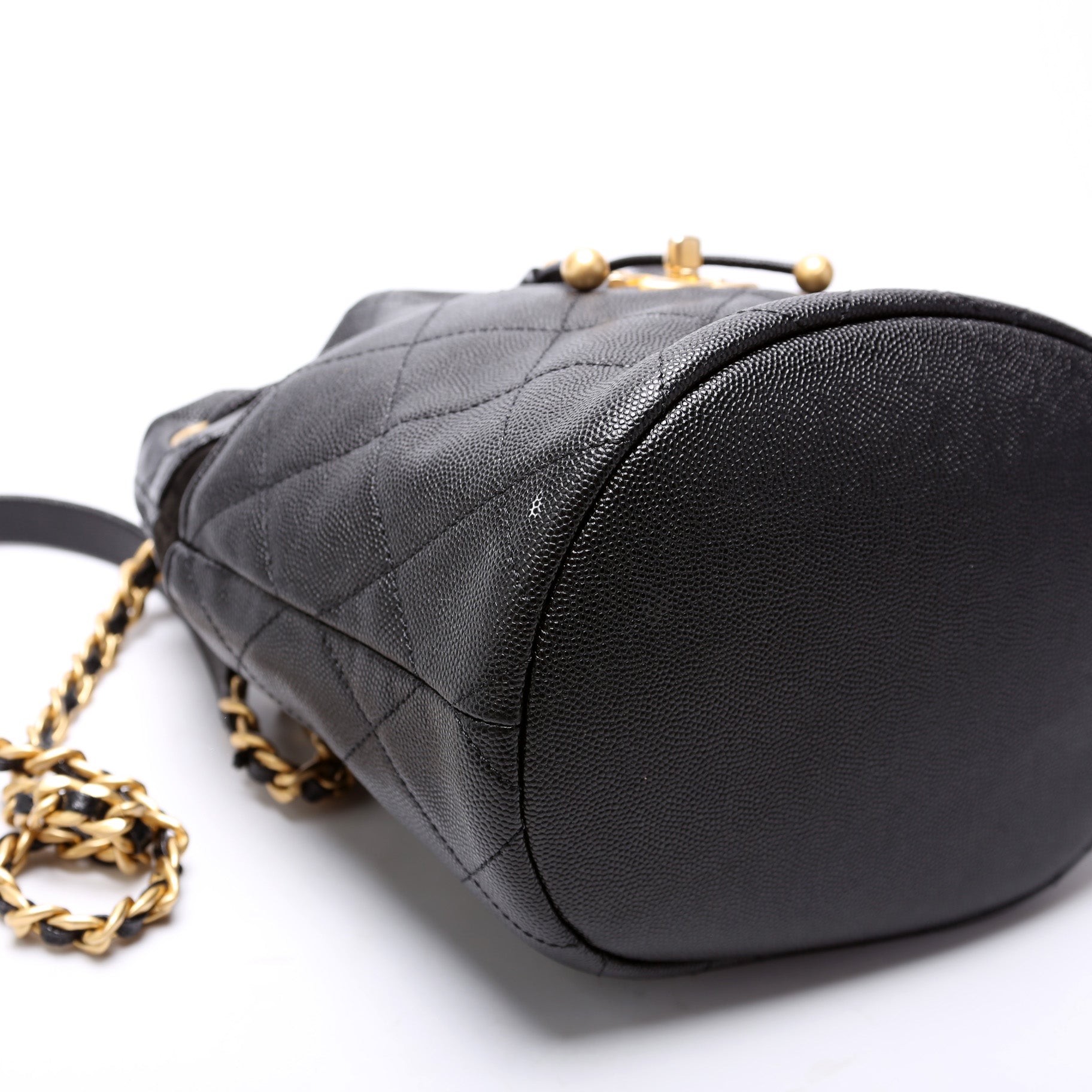 Chanel CC Drawstring Bucket Bag. The exterior is in the classic Caviar leather.Â