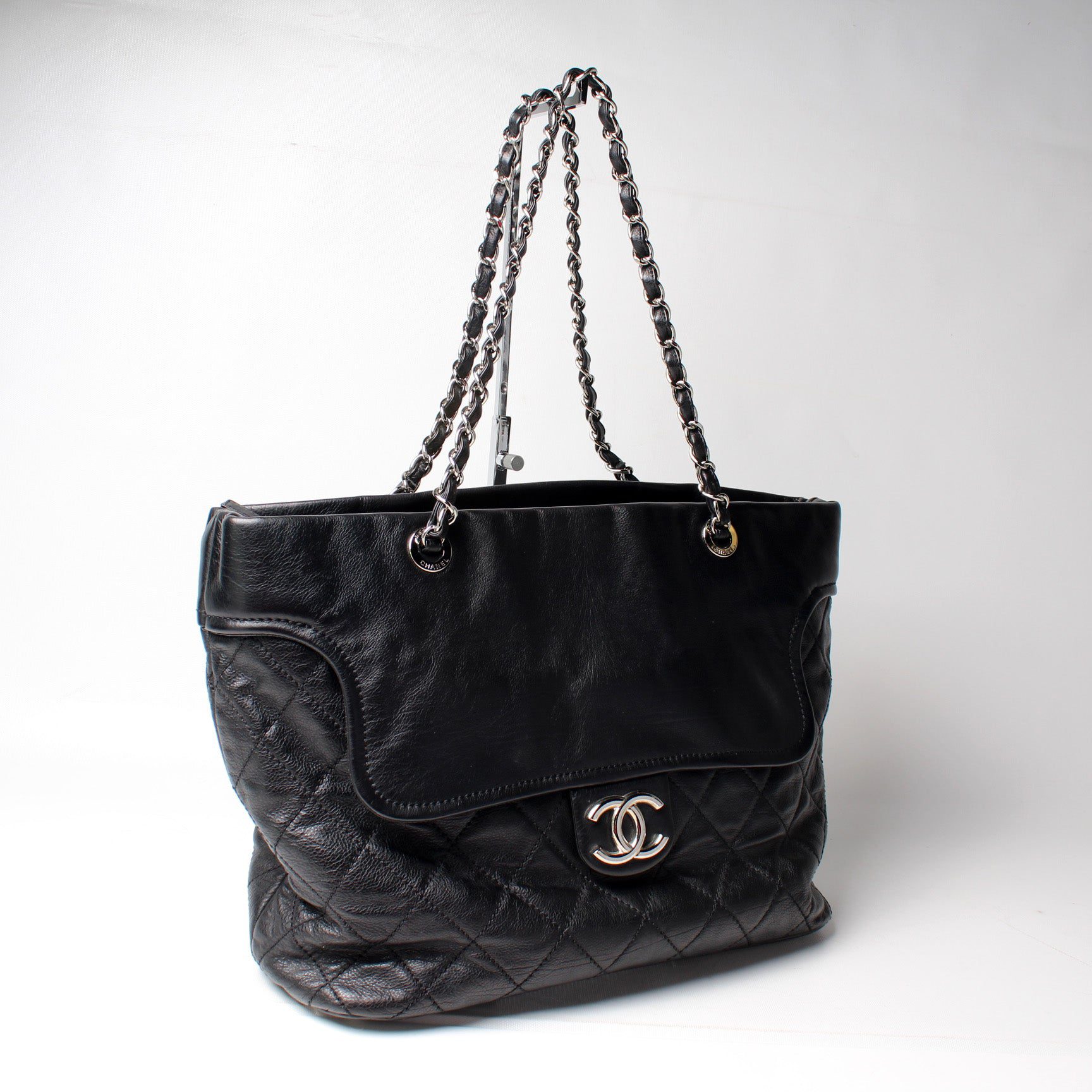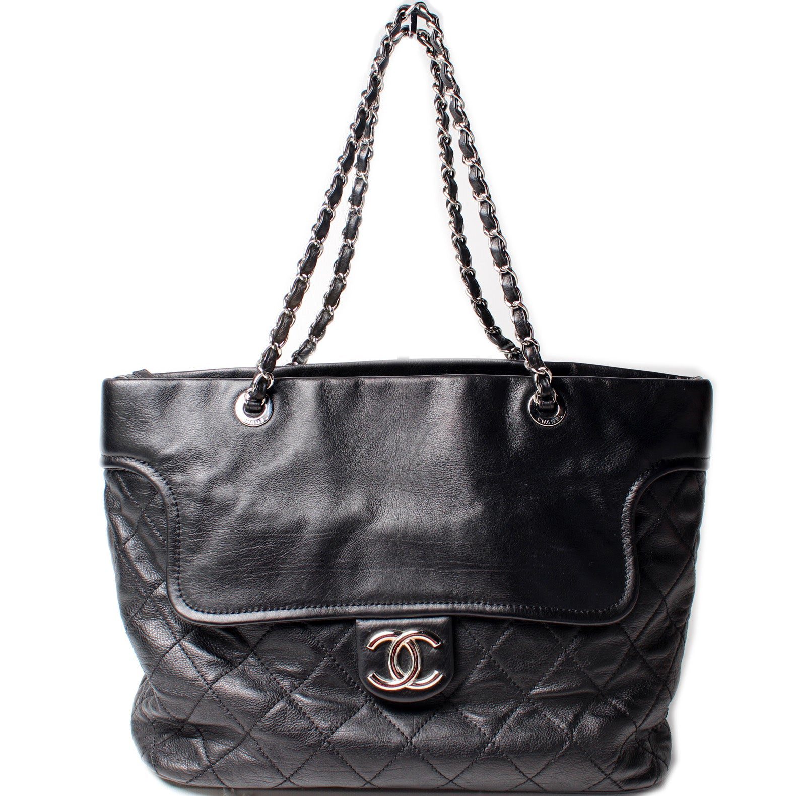 Chanel CC Flap Pocket Shopper. The exterior is in the classic Caviar leather.Â