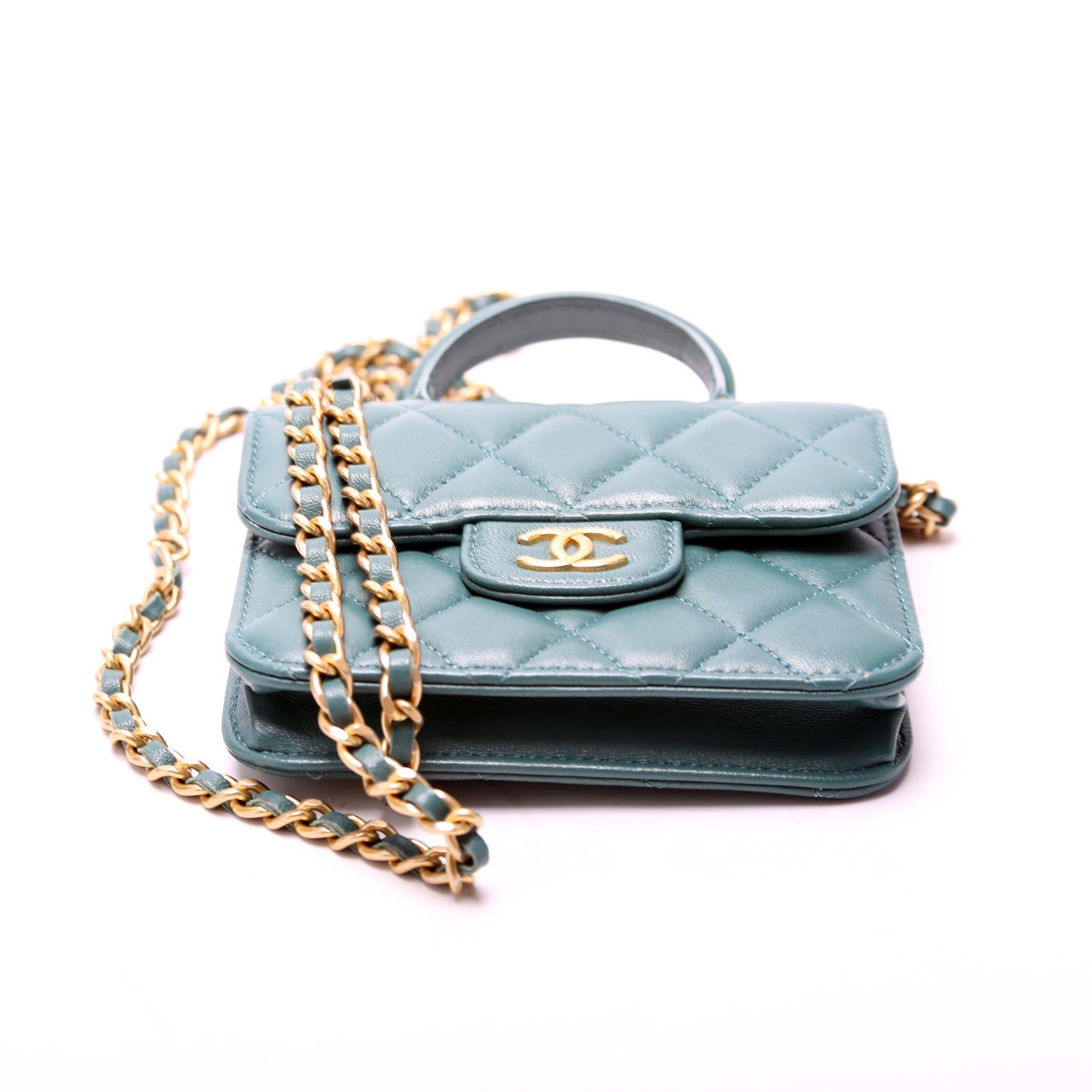Chanel CC Top Handle Flap Coin Purse W/Chain 31. The exterior is in the classic Chanel Lambskin leather.