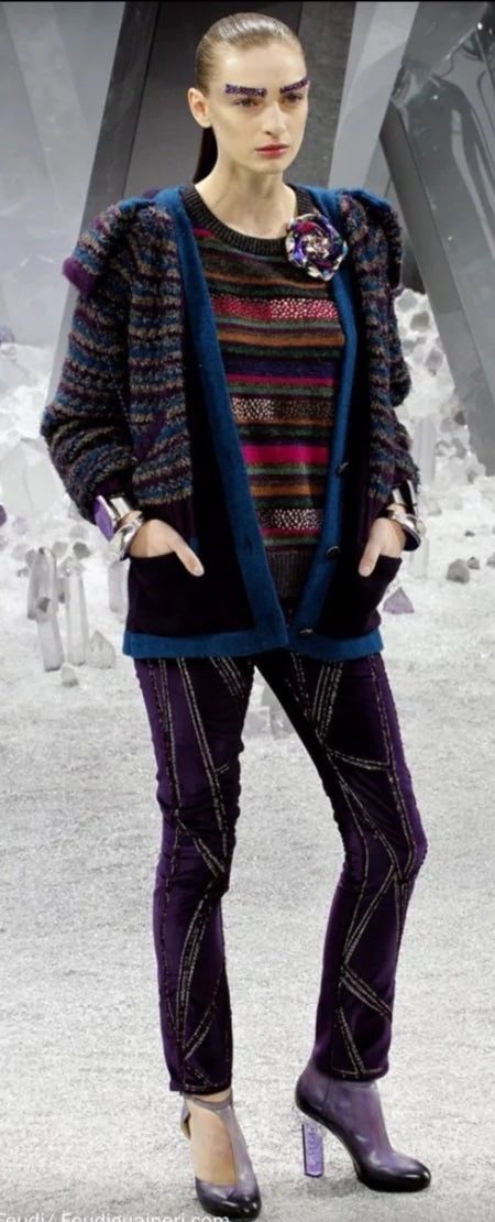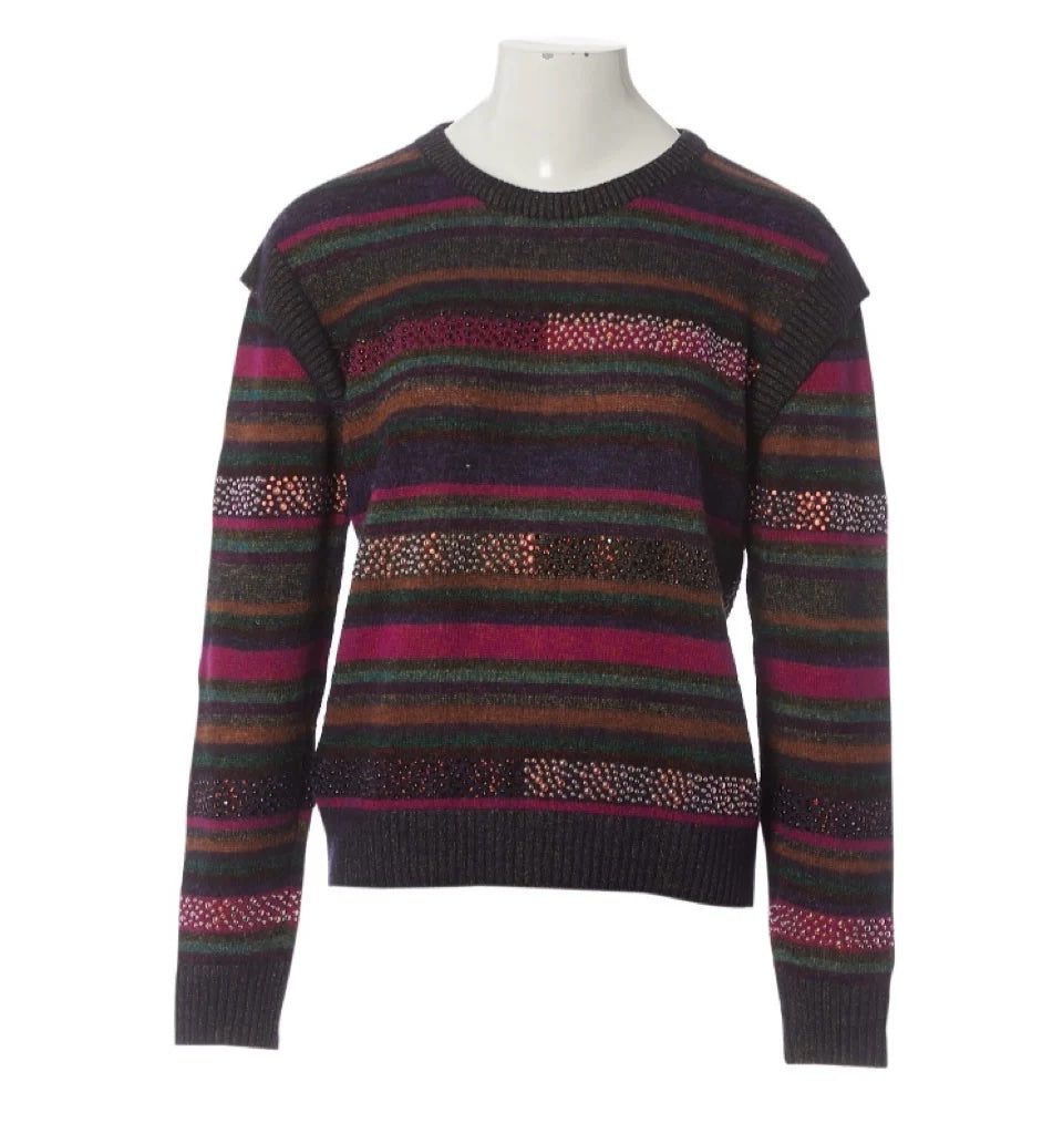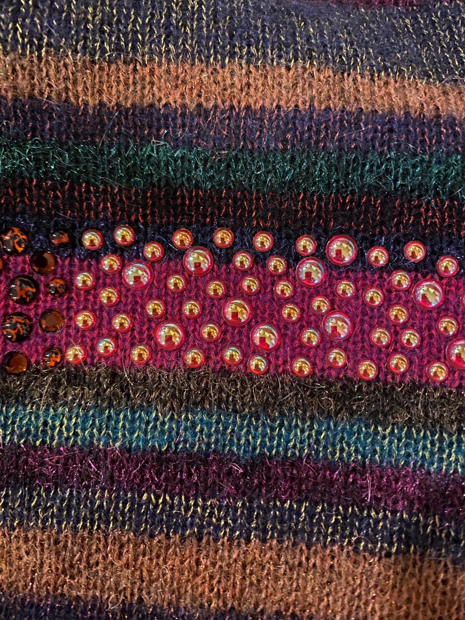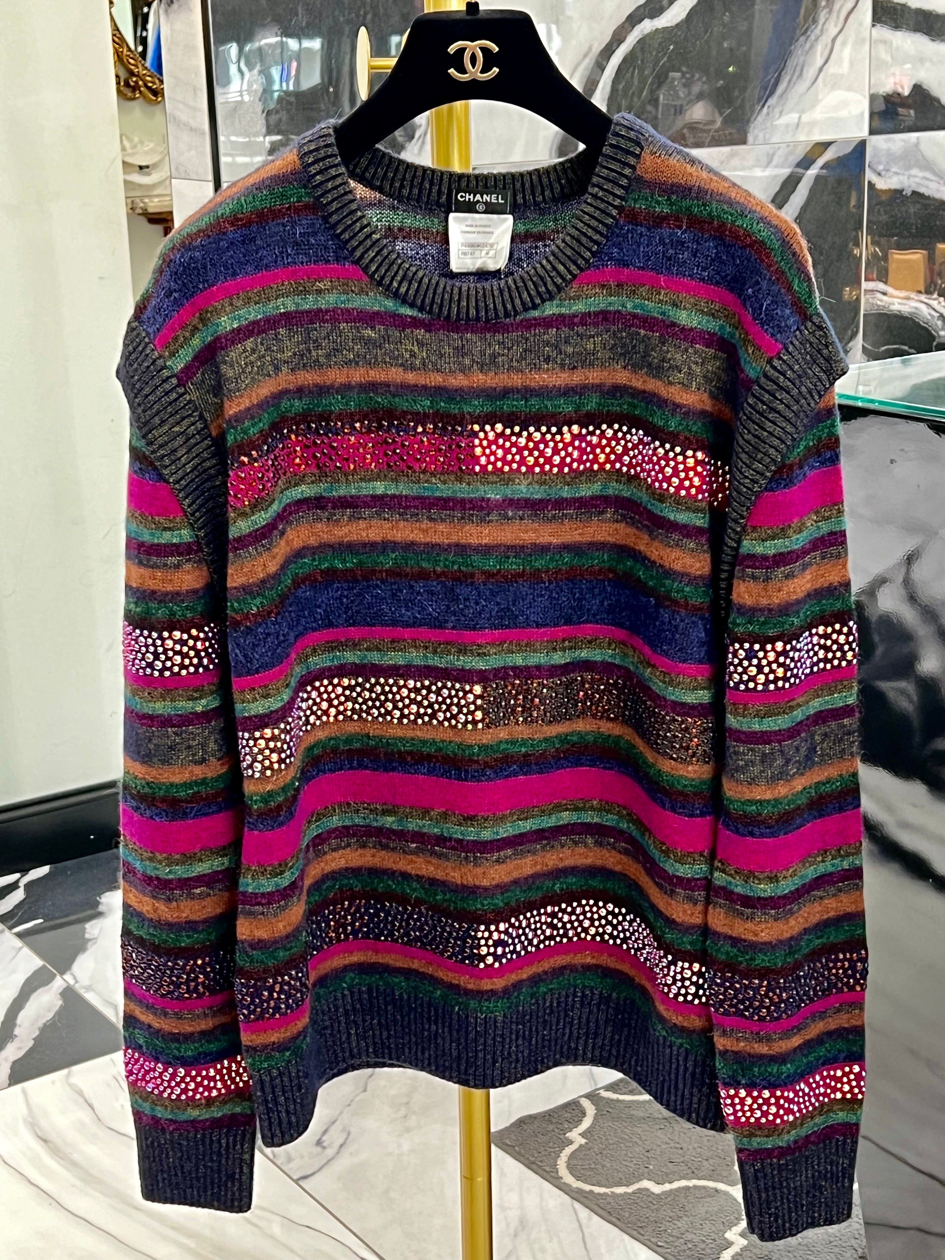 Chanel 12A, Runway striped strass beaded crew neck multicolor sweater. The red stripes are actually small glass half stones. There are 3 rows on the body of the sweater, 3 rows on each sleeve. Ribbed around the bottom, the collar, and where each sleeve joins the shoulder. Features CC at back neck.