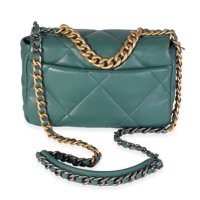This bag is crafted of quilted lambskin in the color teal/green with gold-tone hardware. The bag features a chain detail CC turn lock on the flap, a magnetic snap pocket at the rear, and a leather threaded aged gold, ruthenium, and dark silver chain link shoulder strap with a leather shoulder pad. The front flap opens to a matching fabric interior with a zipper pocket.