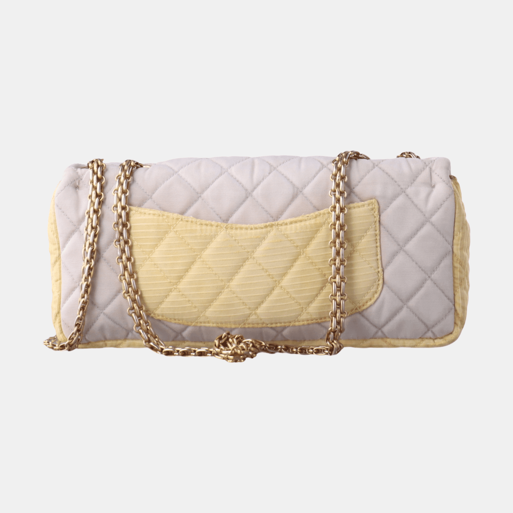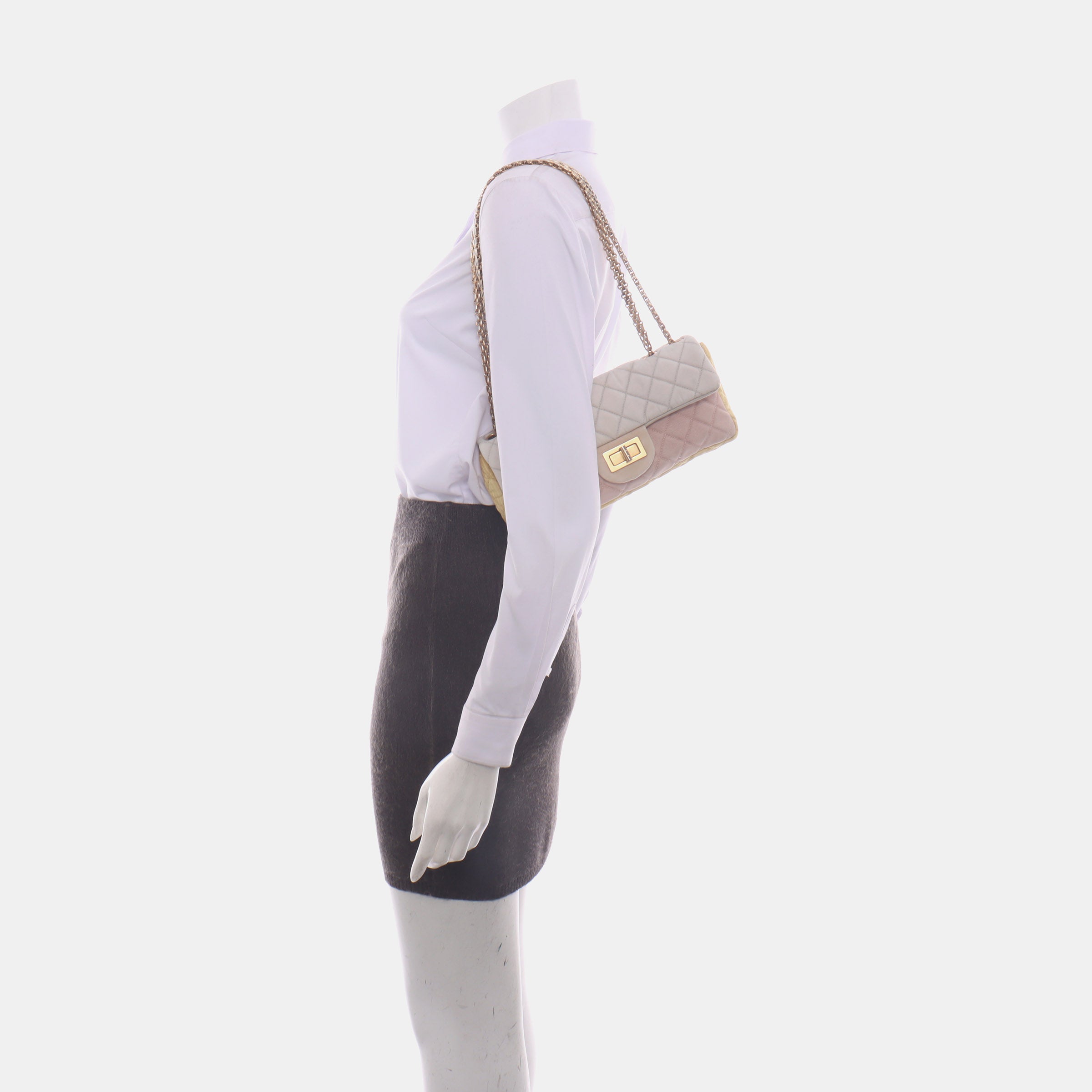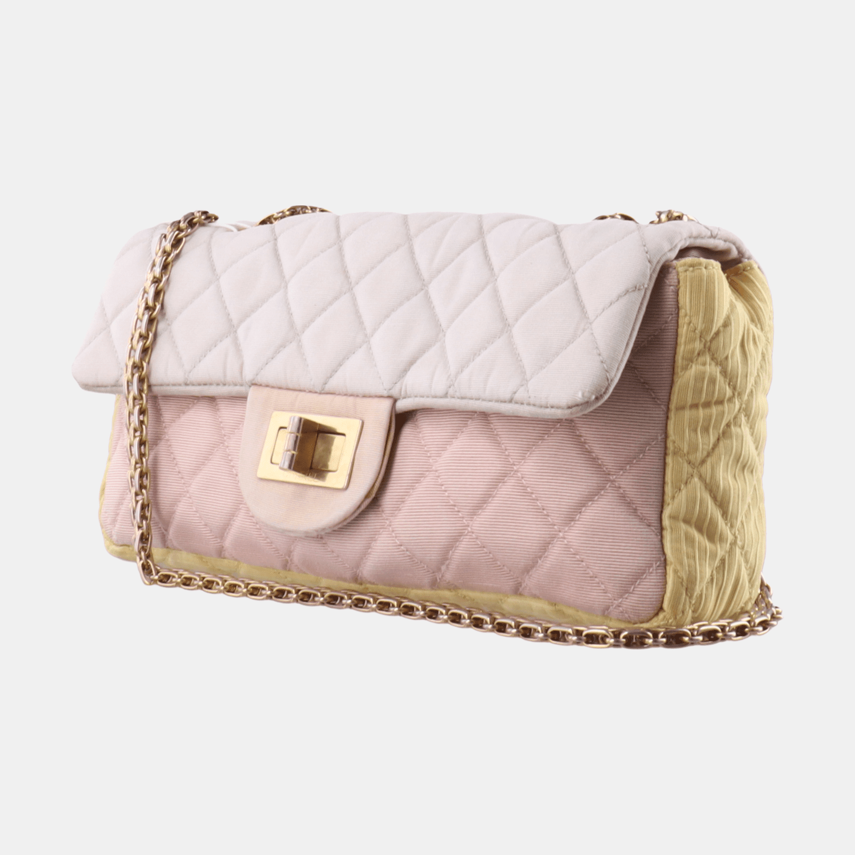 This Chanel 2.55 Flap bag features a mademoiselle turn lock and is made of pink iridescent cloth, square quilt wild stitch, accented with silver hardware and silver chain.