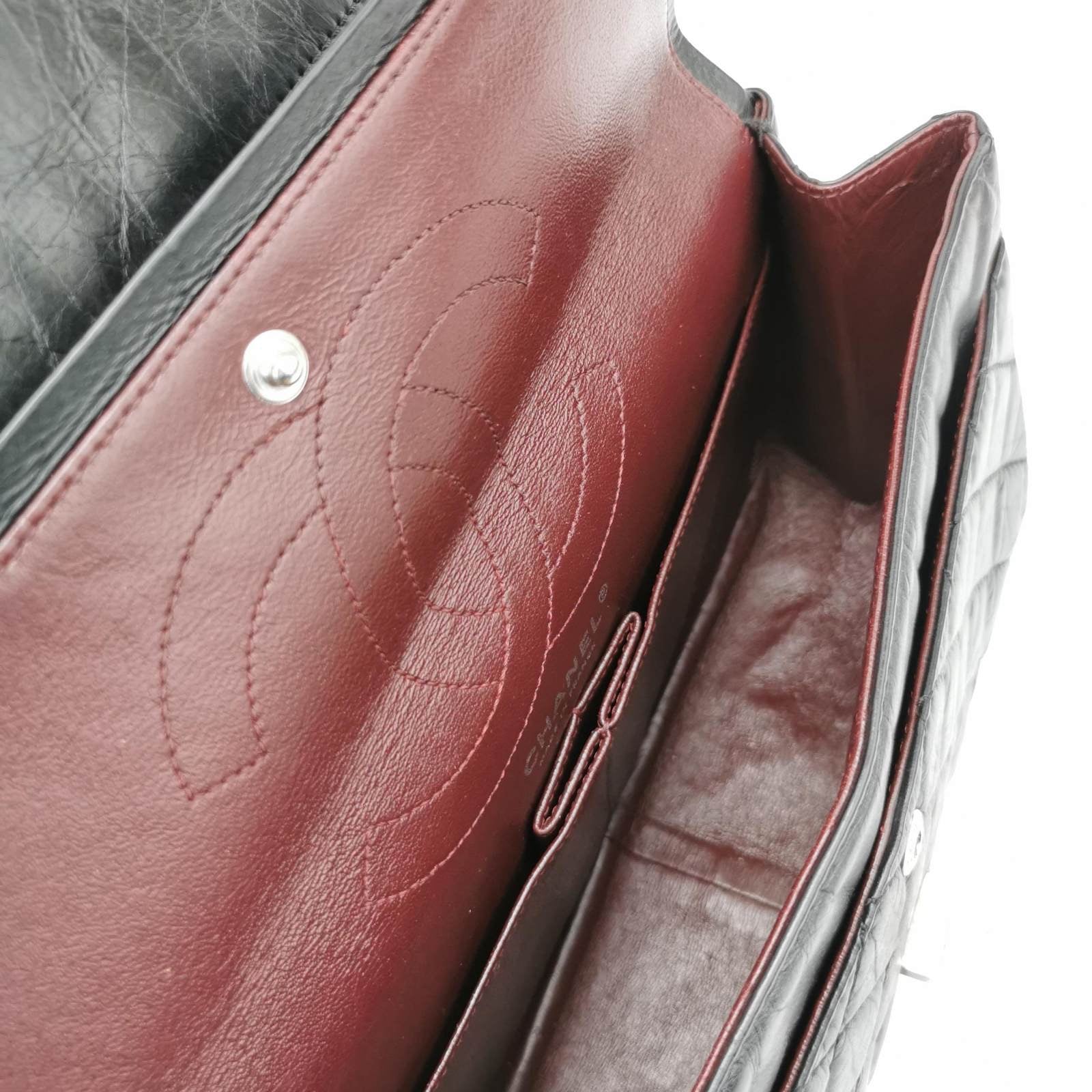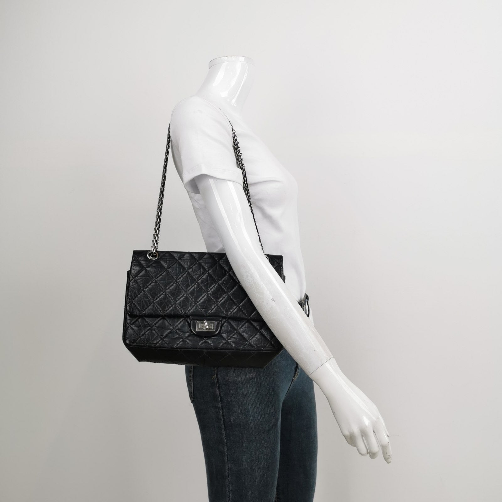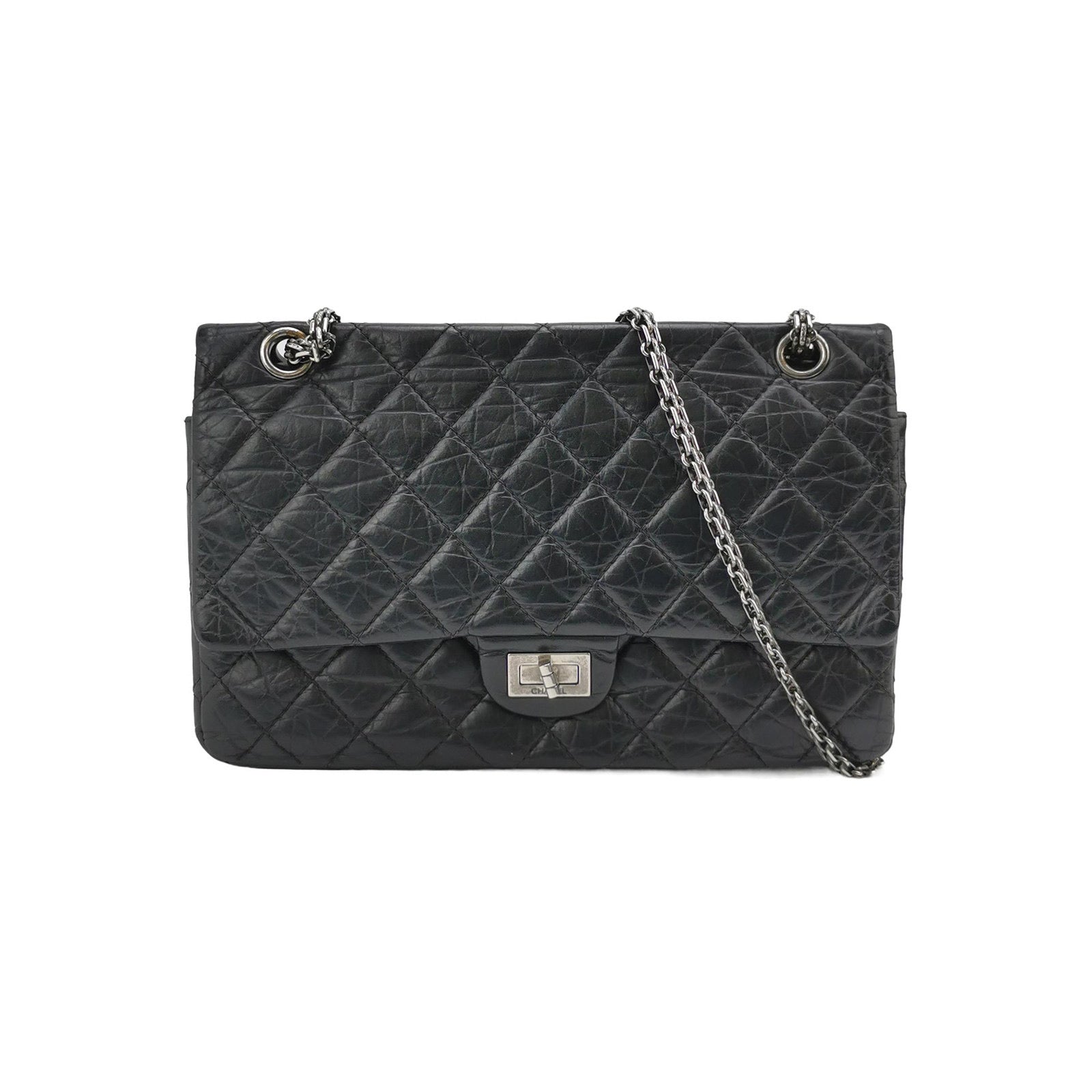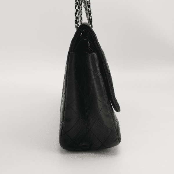 This Chanel 2.55 Flap bag features a mademoiselle turn lock and is made of shiny distressed calfskin leather in a classic black color, accented with silver hardware.