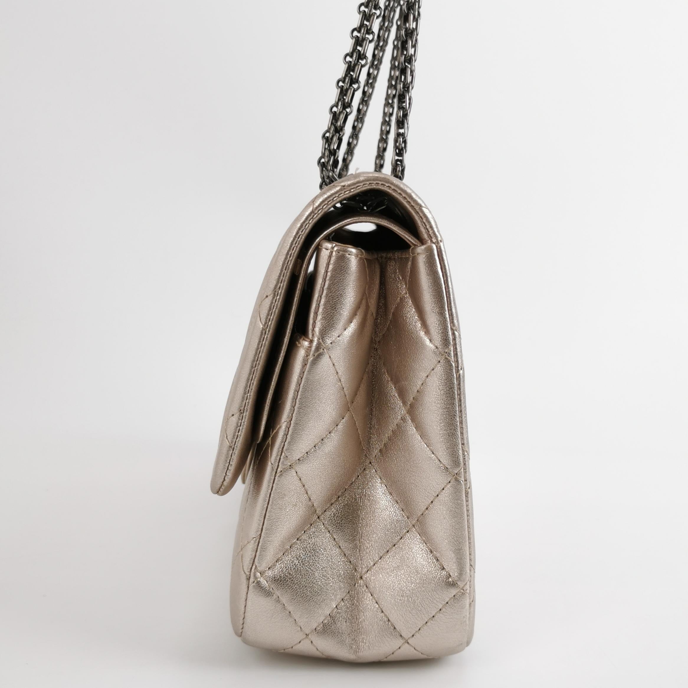 This Chanel 2.55 Flap bag features a mademoiselle turn lock and is made of lambskin leather in a stunning rose gold / champagne with an iridescent shin, accented with silver hardware.