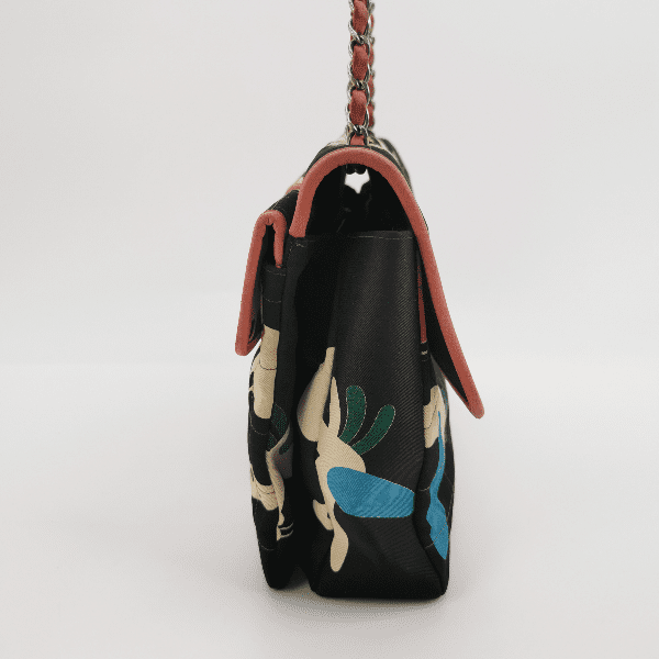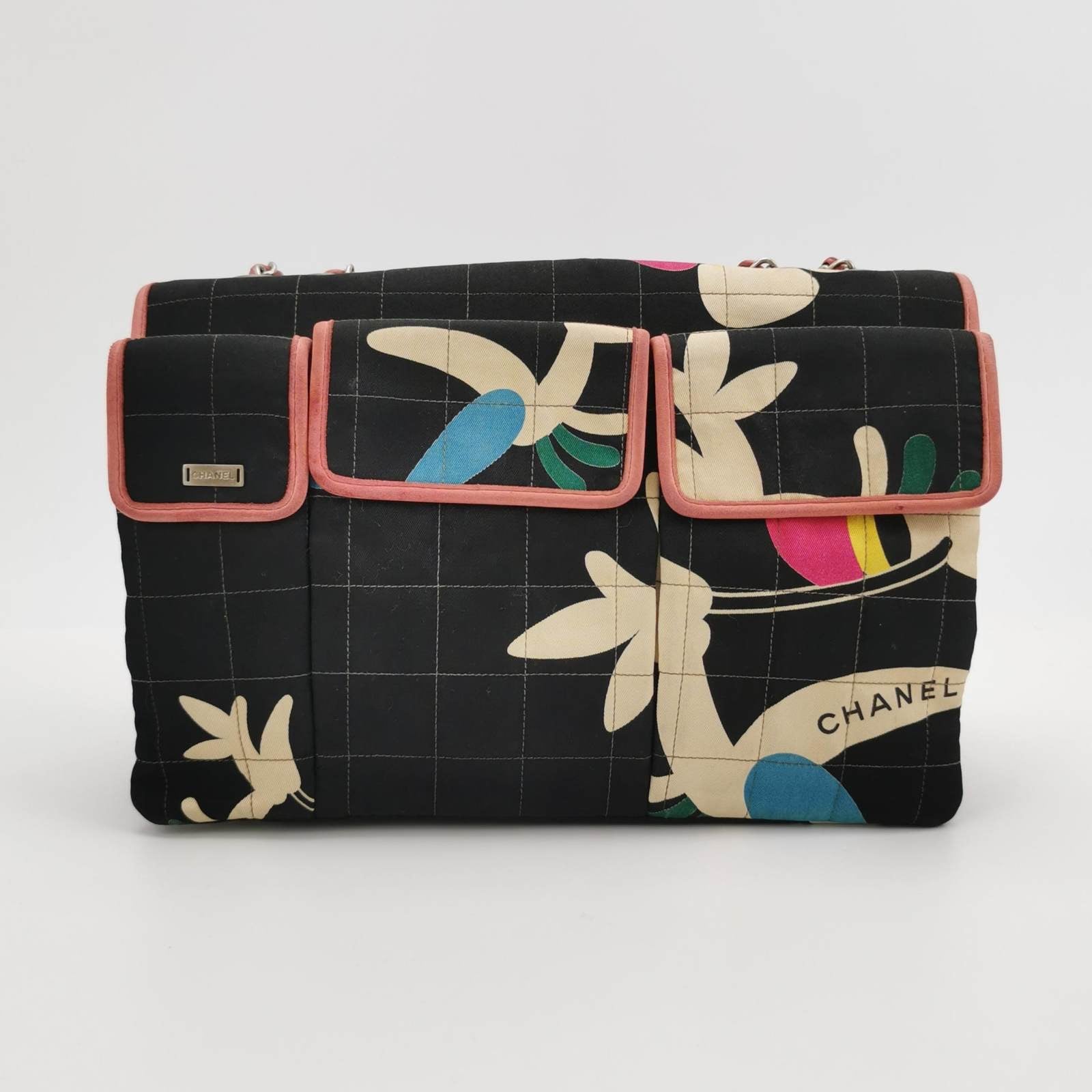 This Chanel 2.55 Flap bag features a mademoiselle turn lock and is made of black fabric with bird print and pink leather trim, square quilting. Multi-pockets on the back of the bag.