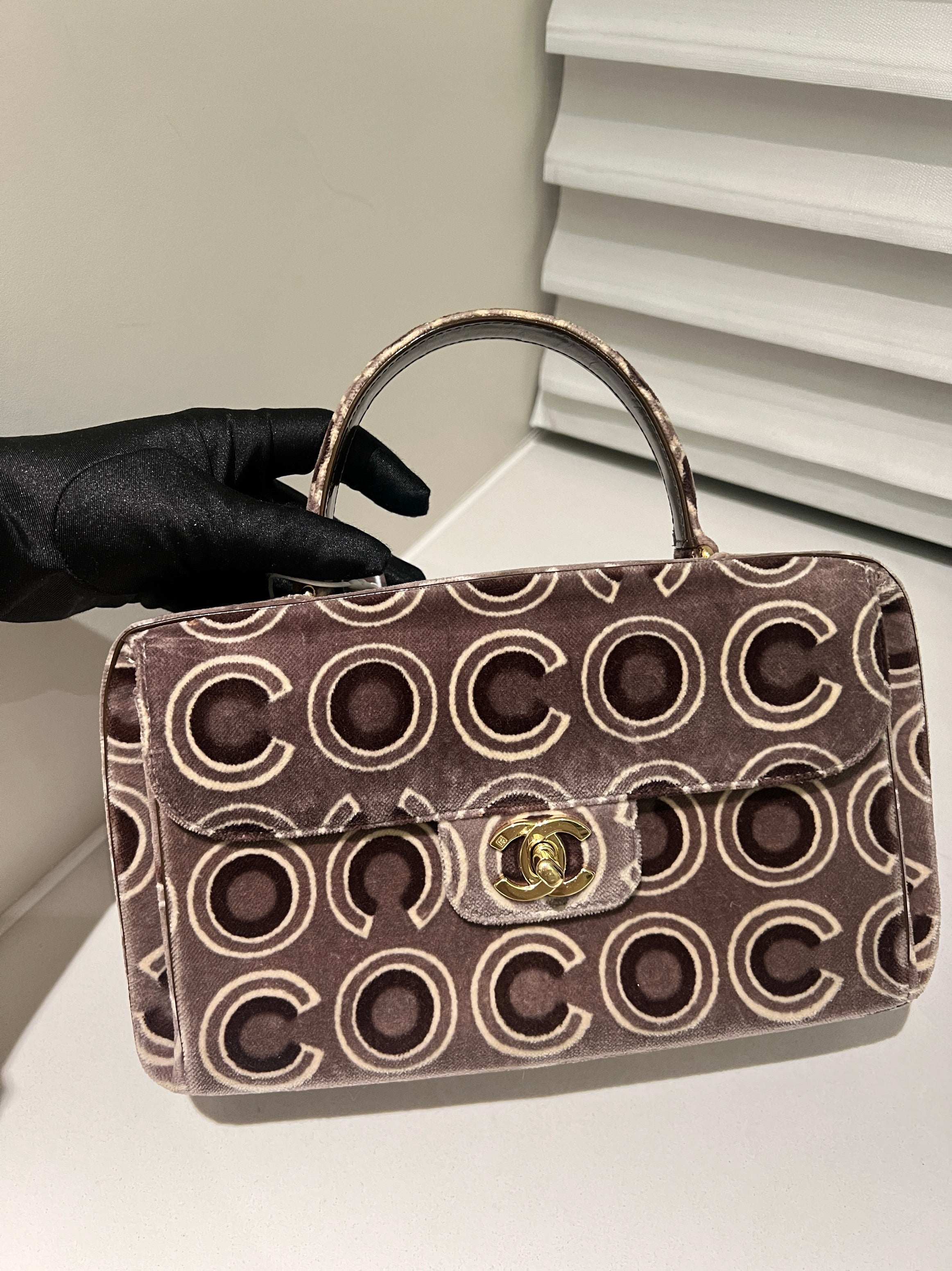 This Chanel handbag pays homage to the maison’s founder with its ‘Coco’ moniker print. It’s crafted from velvet to a structured silhouette with a top handle. Decorated with 24 karat gold plated CC turn-lock