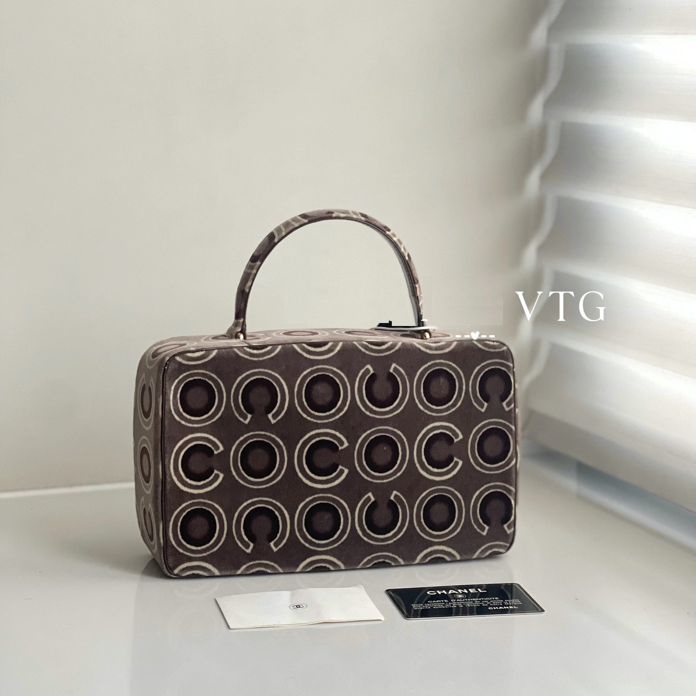 This Chanel handbag is in very good condition. Very minimal scuffs around the corners, which is rare for velvet bags. Light scuffs around the leather edge on the back. Scratches to the hardware.