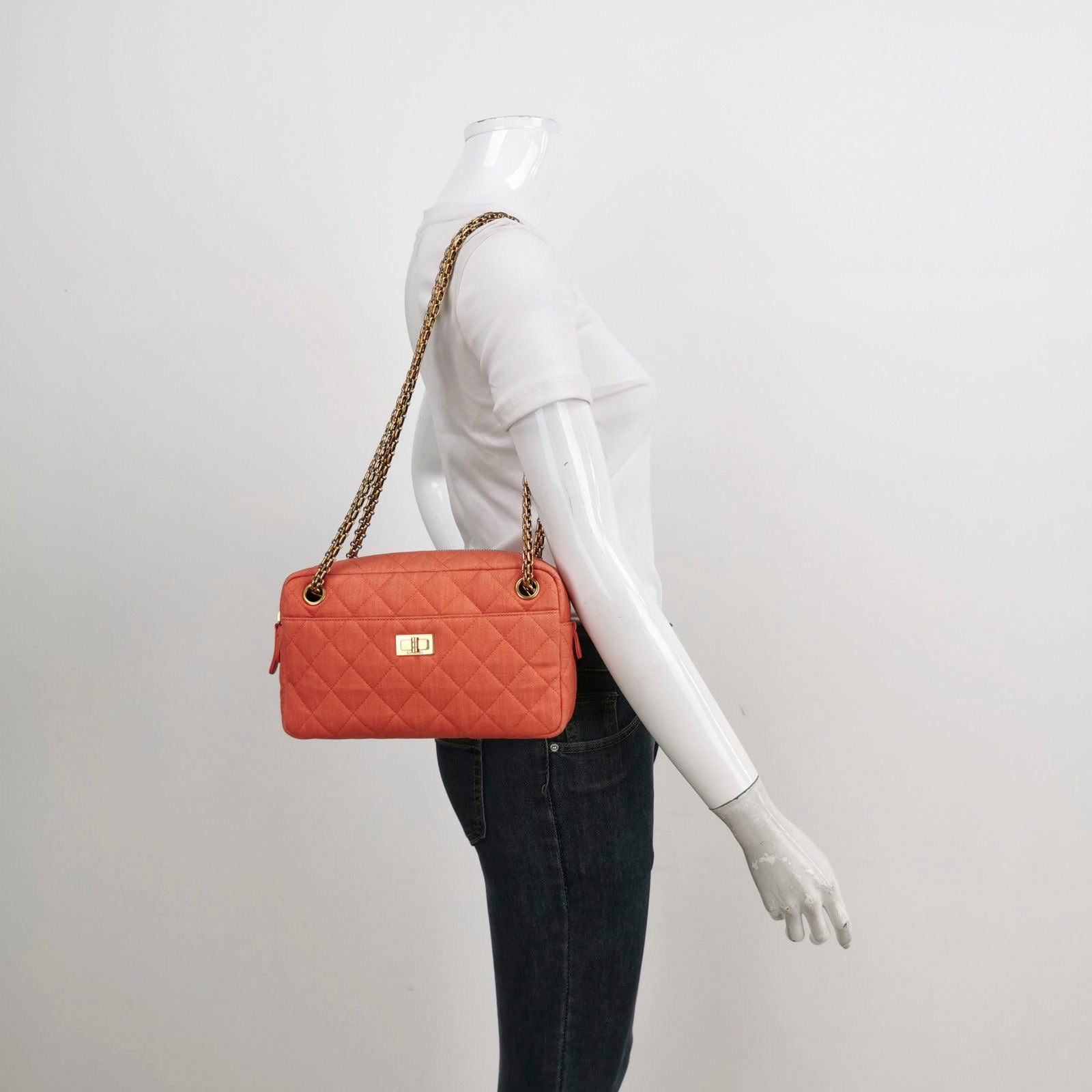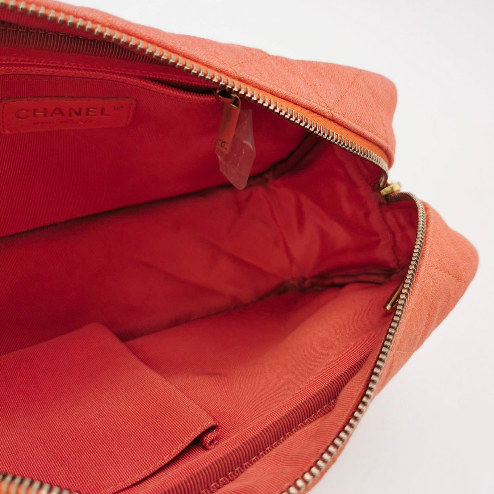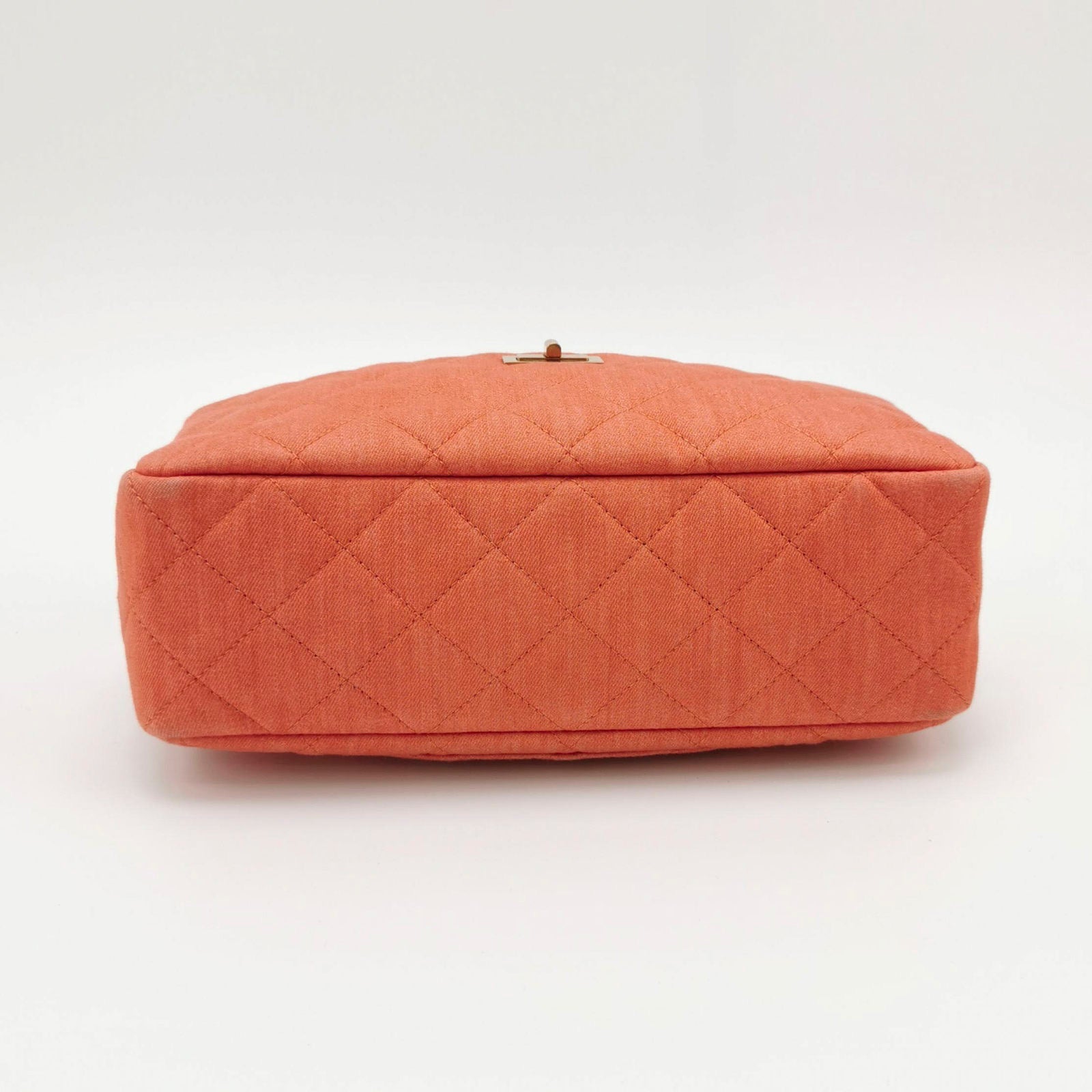 This is an Chanel handbag. It is crafted from lightweight canvas with a quilted stitching, and metallic blue finish. It’s adored with a 2.55 Mademoiselle turn lock on the front pocket. The top zipper opens up to a matching interior with zipper and patch pockets.Â