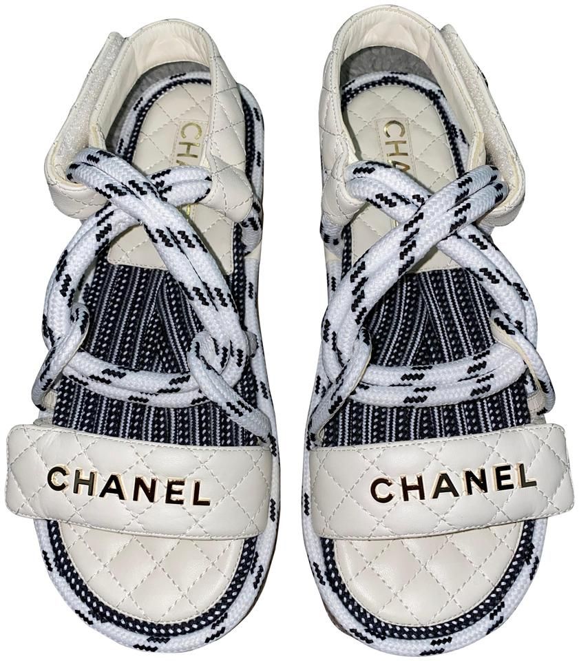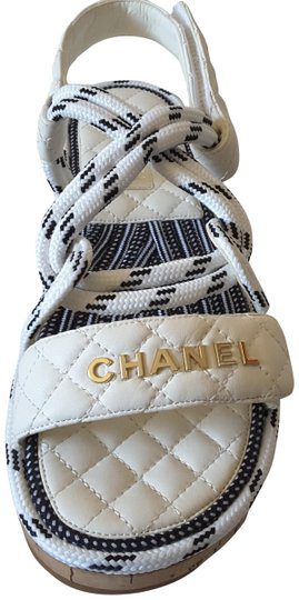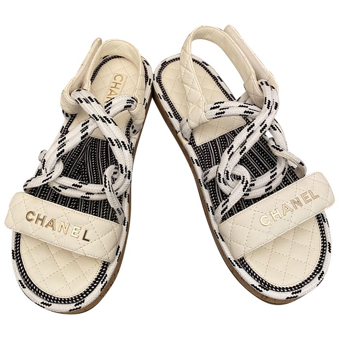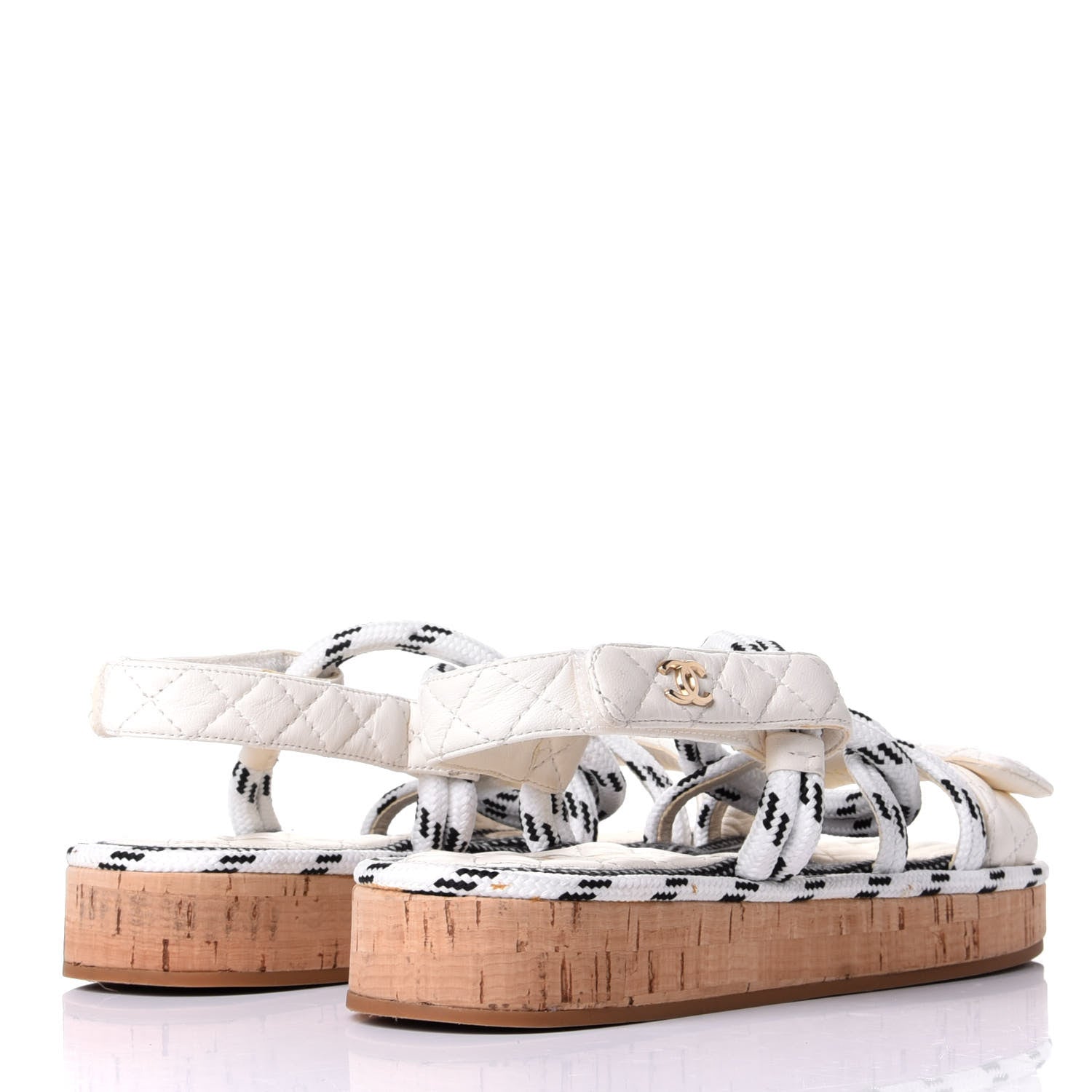 Features quilted lambskin and woven rope straps, a gold Chanel CC logo, and cork midsoles.