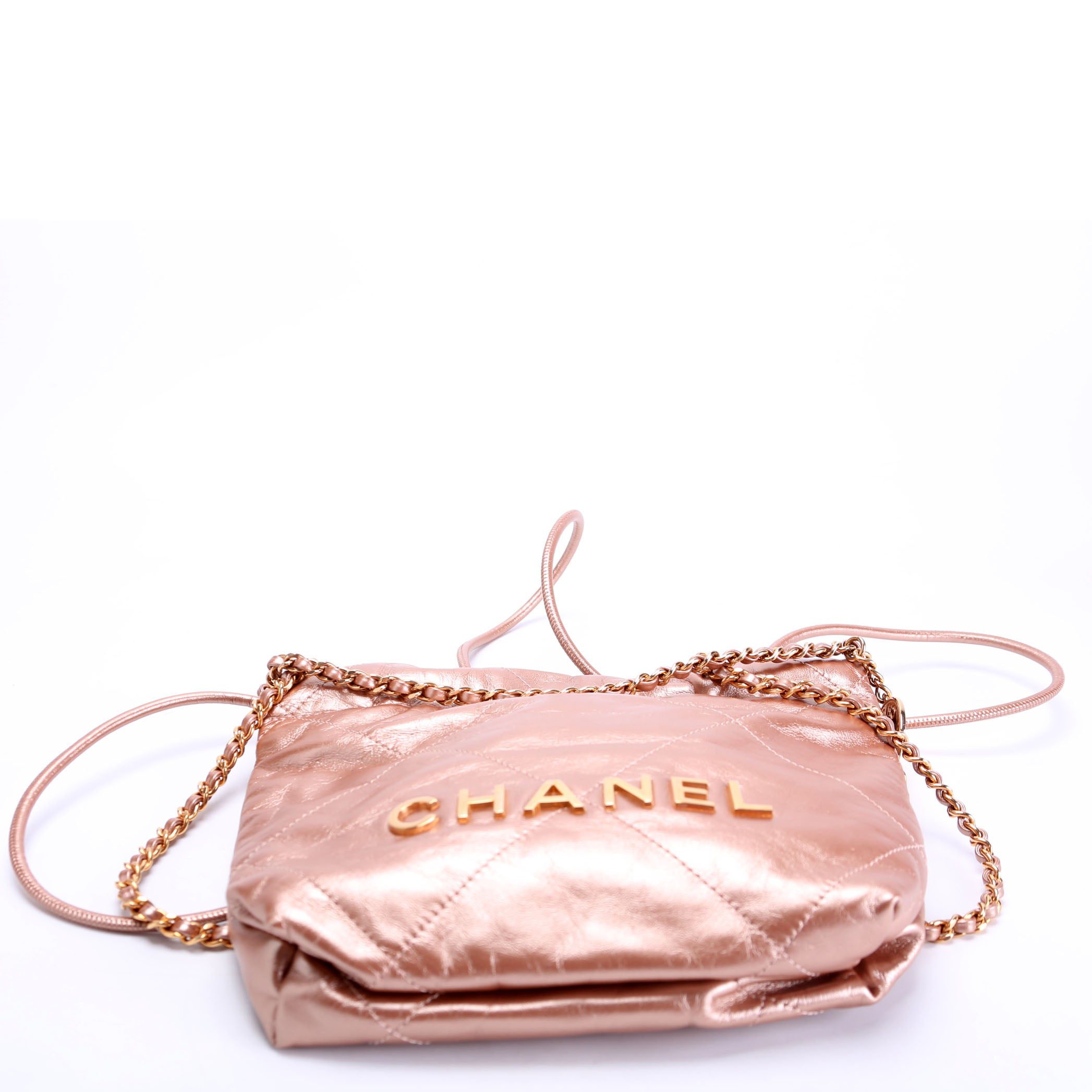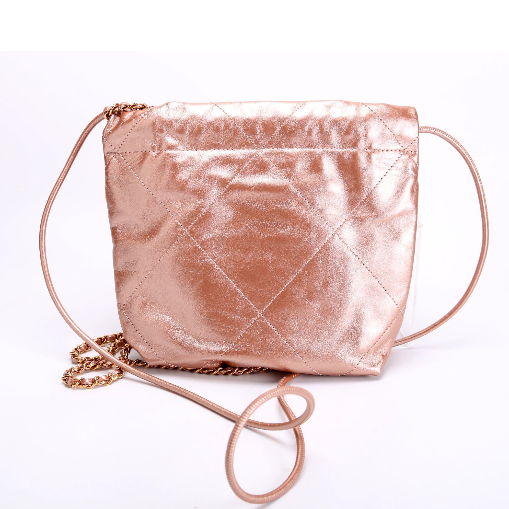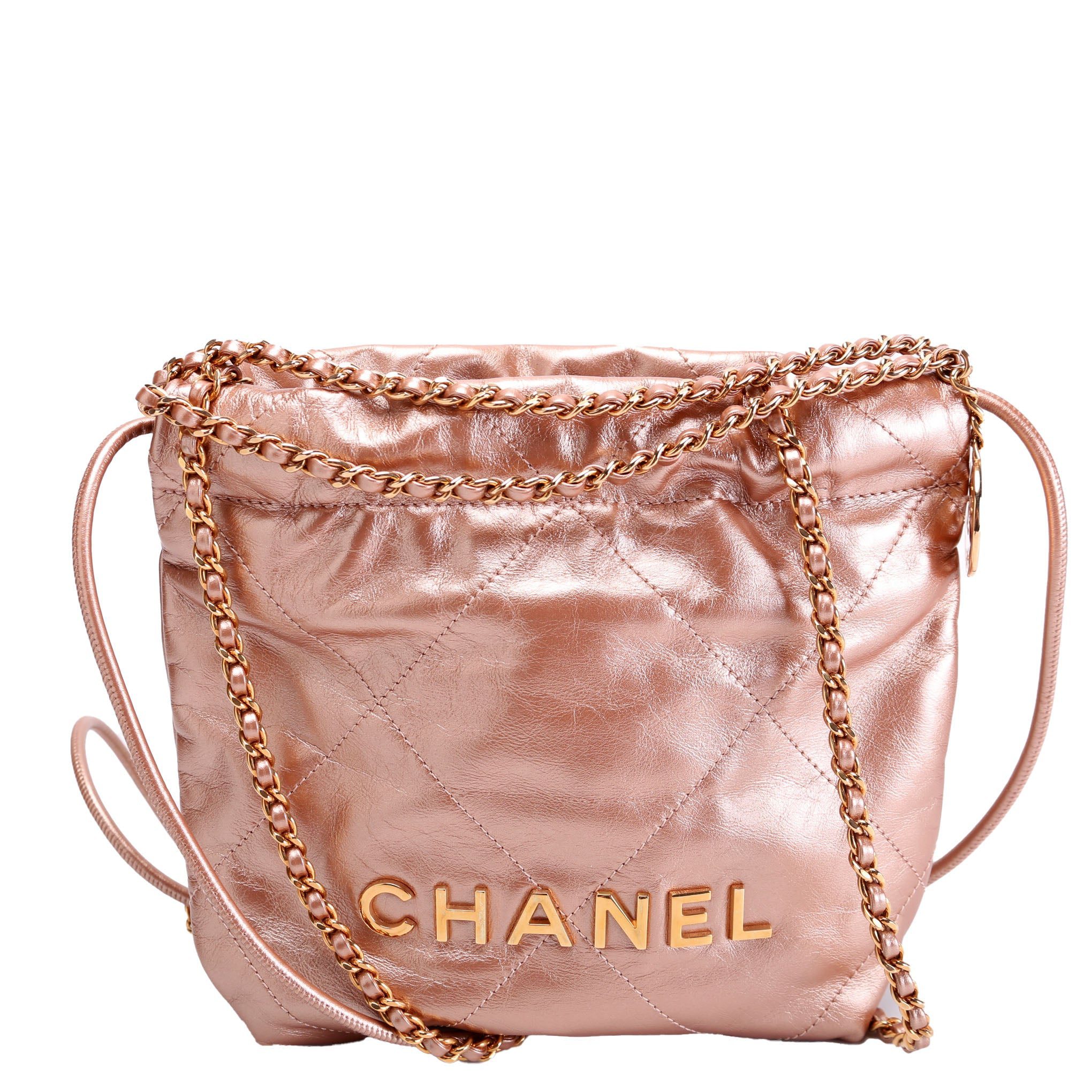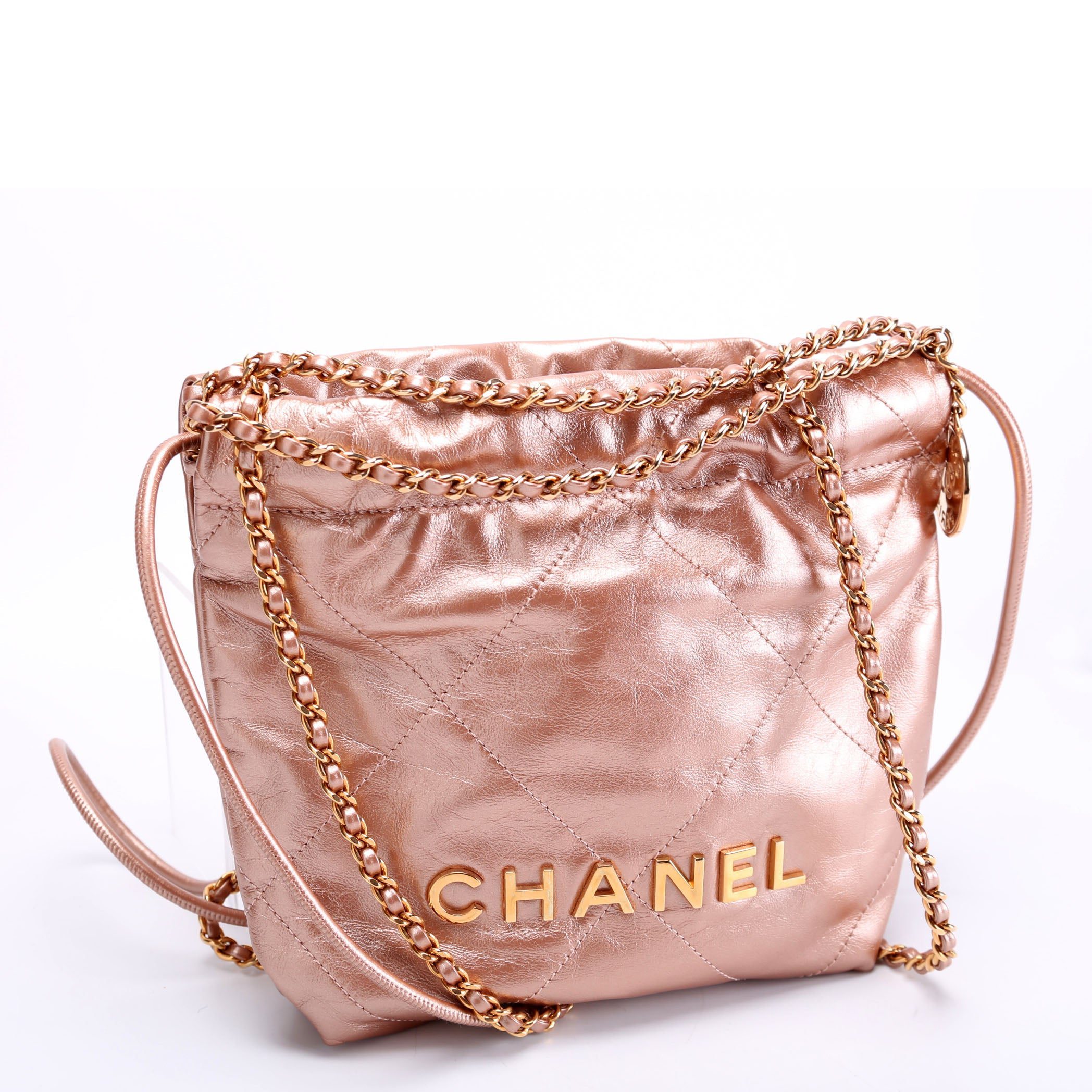 Chanel 22 Mini Metallic Calfskin�. The exterior is in the classic Chanel Calfskin leather.Â