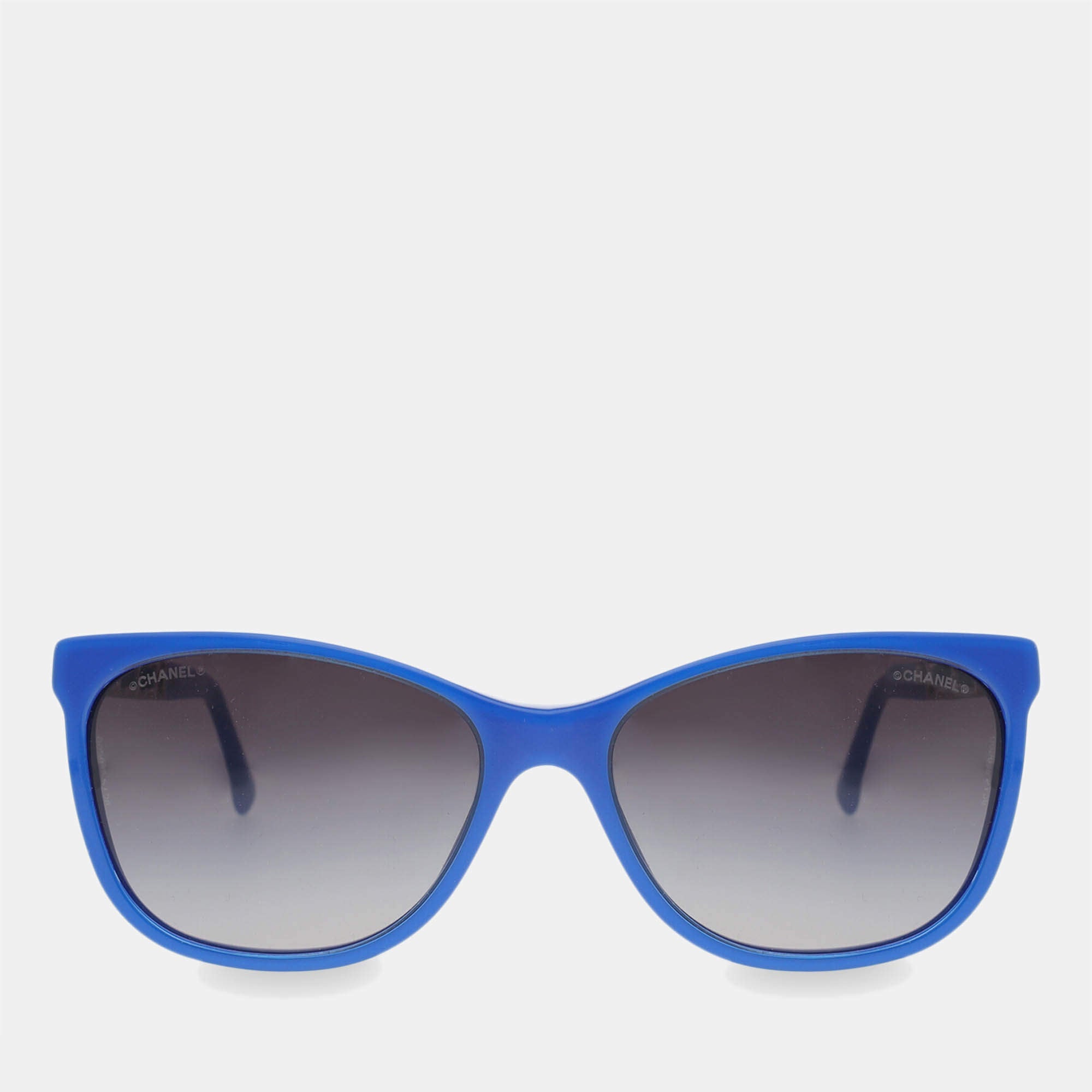 Chanel’s Chain Sunglasses pair Blue leather and silver chain for a great pair of everyday shades! Blue shiny opaque plastic frames , the arms are silver chain with leather woven through and silver CCs at the ends.