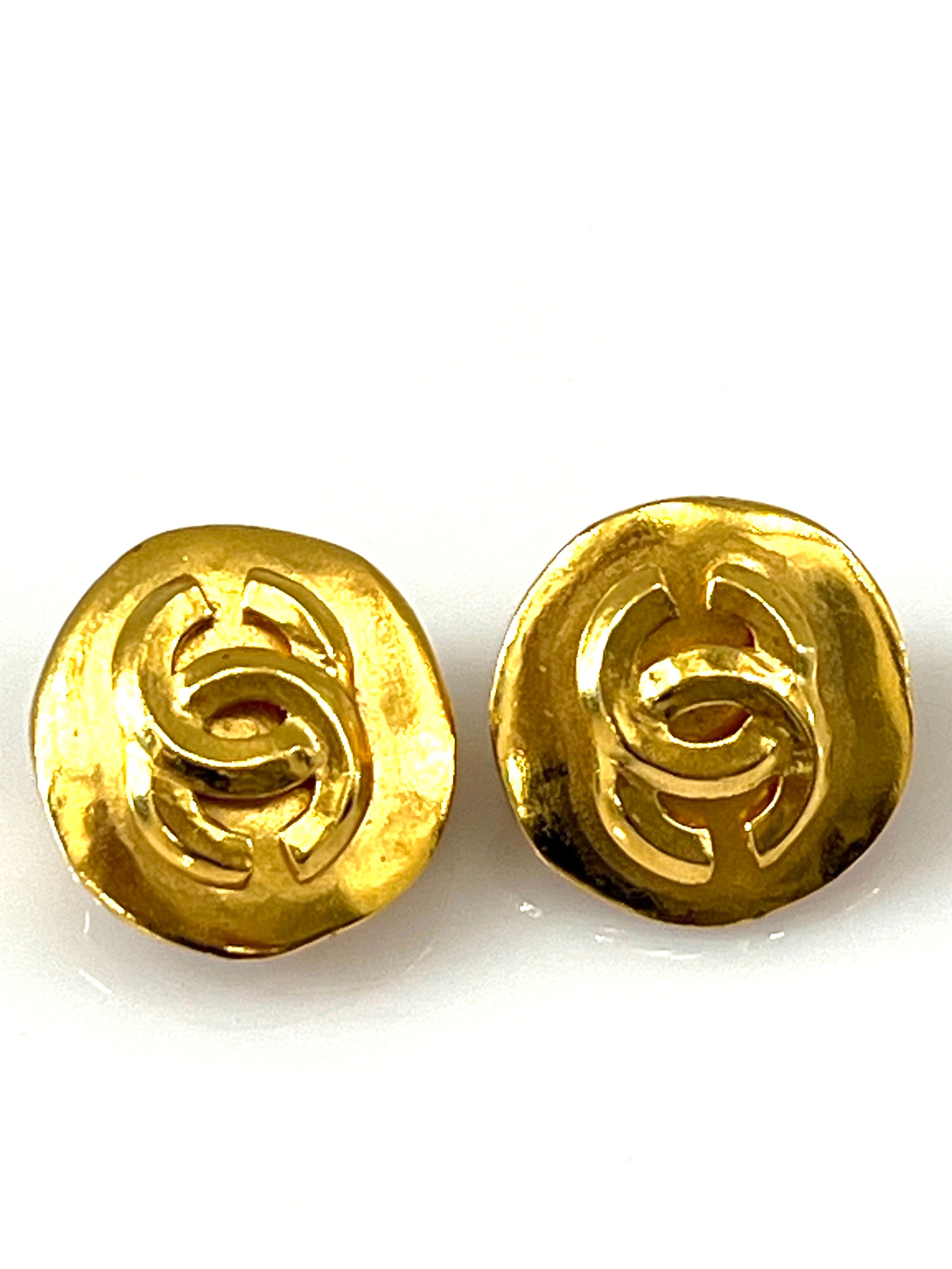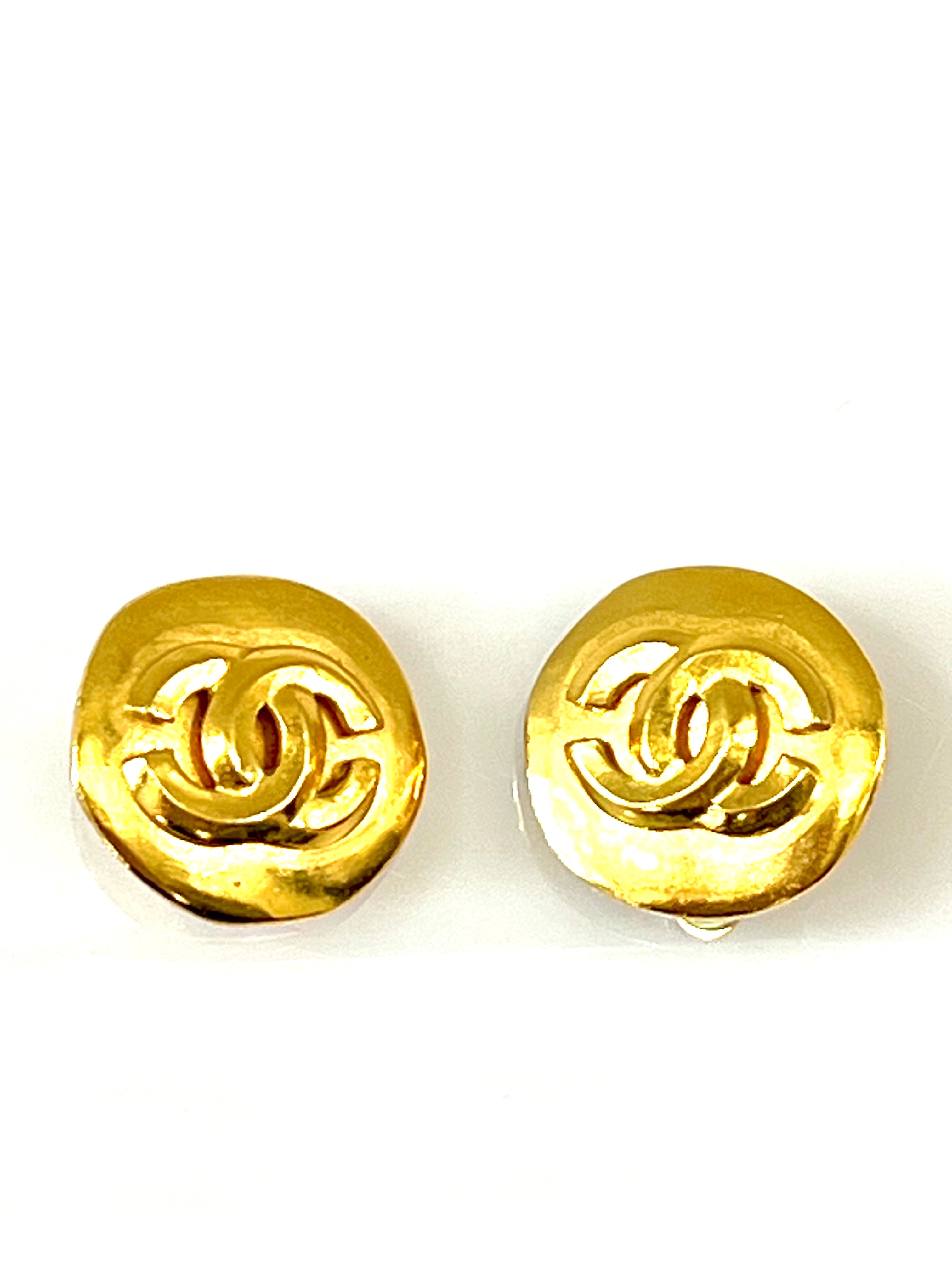 The button earrings are an icon amongst CHANELâs jewellery collections. Presented here traditionally gold-plated, they boast the signature interlocking CC logo on the front.