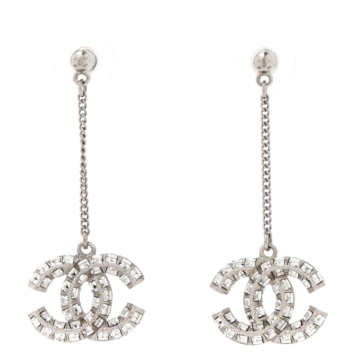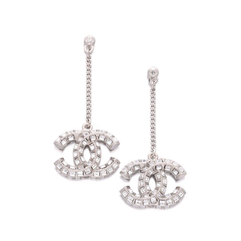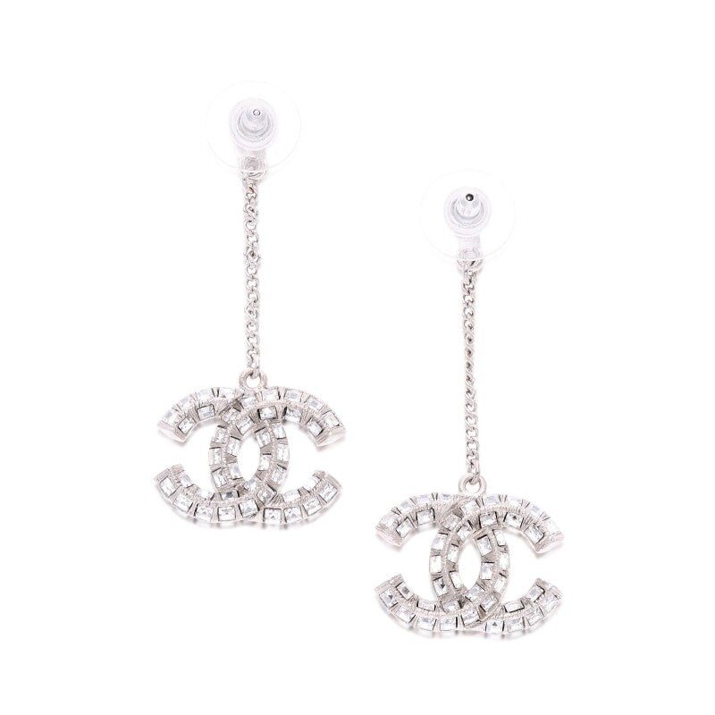 These CHANEL Stunning Earrings Features a Silver Drop Chain with a Hanging Chanel CC encrusted with baguette crystals.