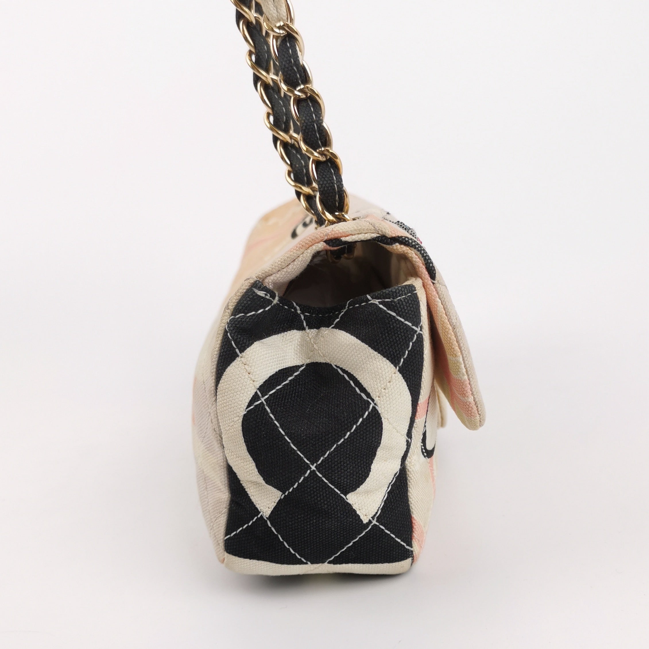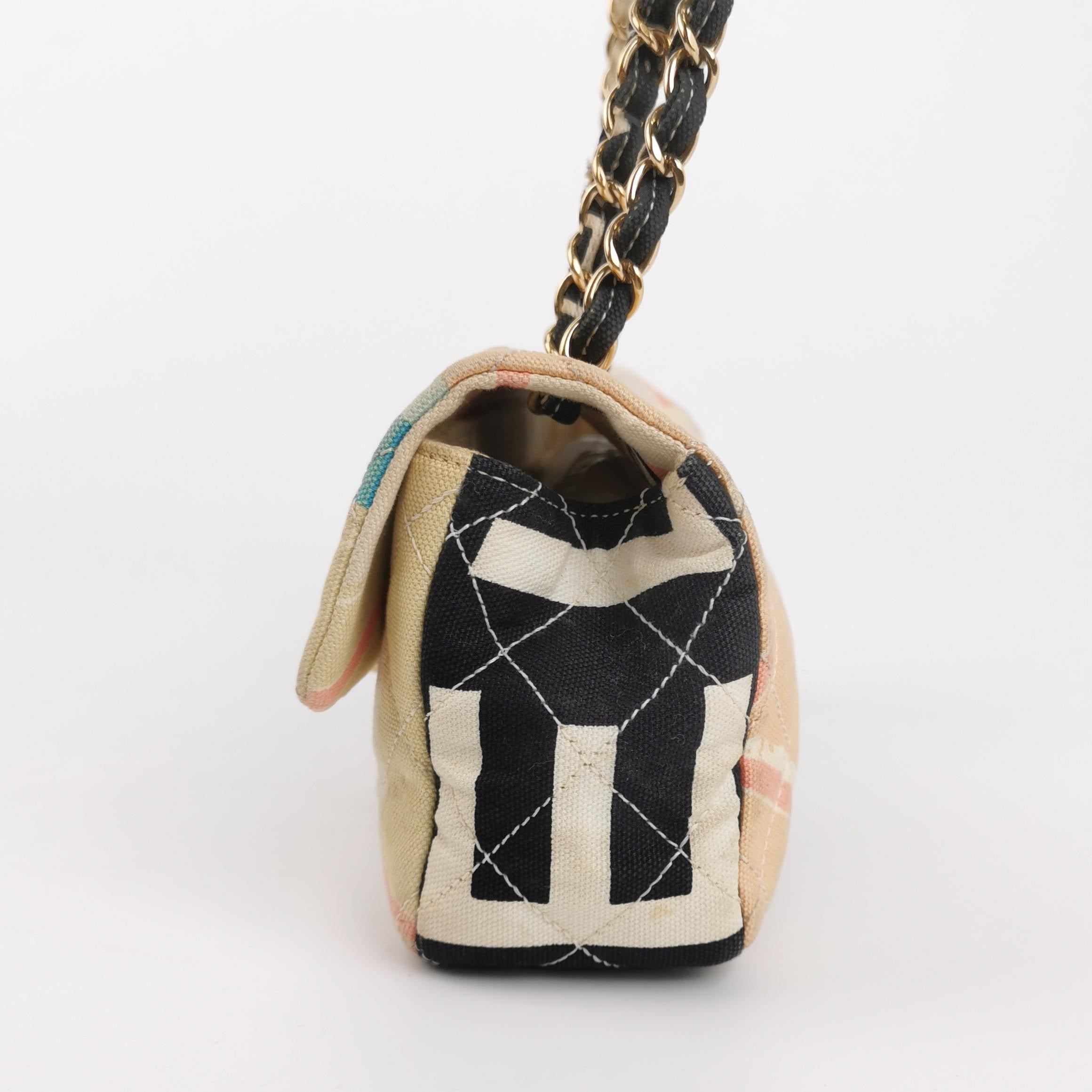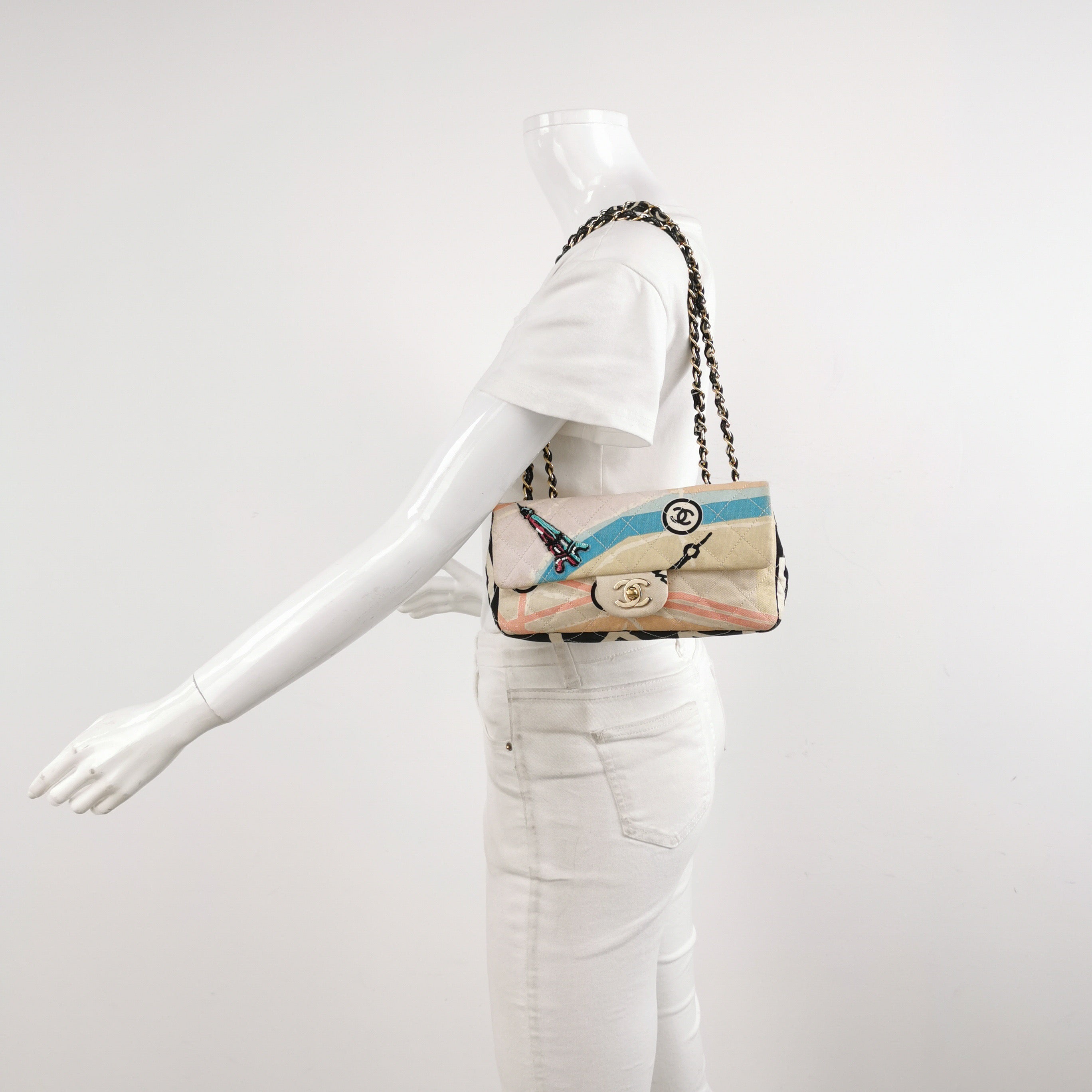 This Chanel Baguette Flap features a playful design, made of fabric with multicolor and Eiffel Tower prints. Slightly larger than the Chanel Mini, it can be worn as a baguette under the arm or carried with double or single chains.