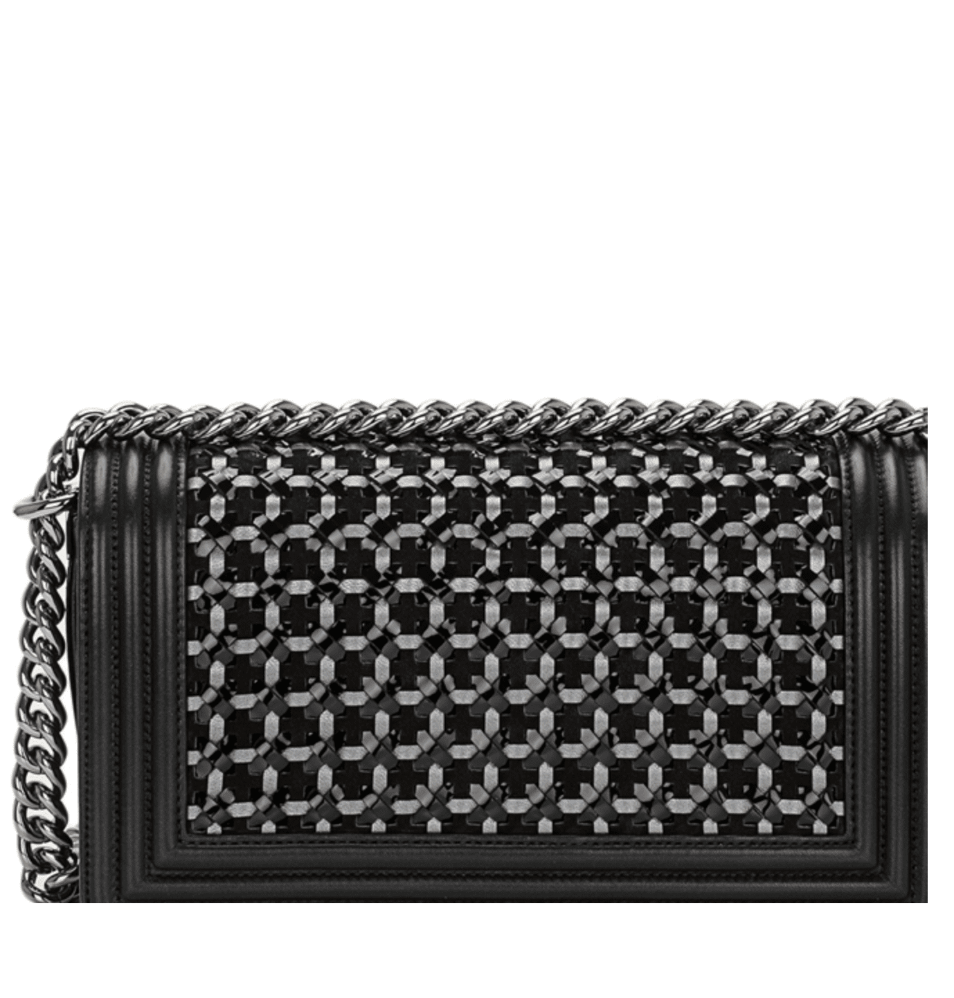 This Limited Edition Medium Boy bag marries multiple types of leather into a work of art accented with beautiful ruthenium hardware. The intricately braided center is made of black patent and silver metallic leather against a black suede background and is framed in smooth black lambskin leather on the front and back edges, and on the sides and bottom. The bag is in the classic Boy style with a full front flap with the Boy signature CC push lock closure and ruthenium chain link and black leather padded shoulder/crossbody strap.