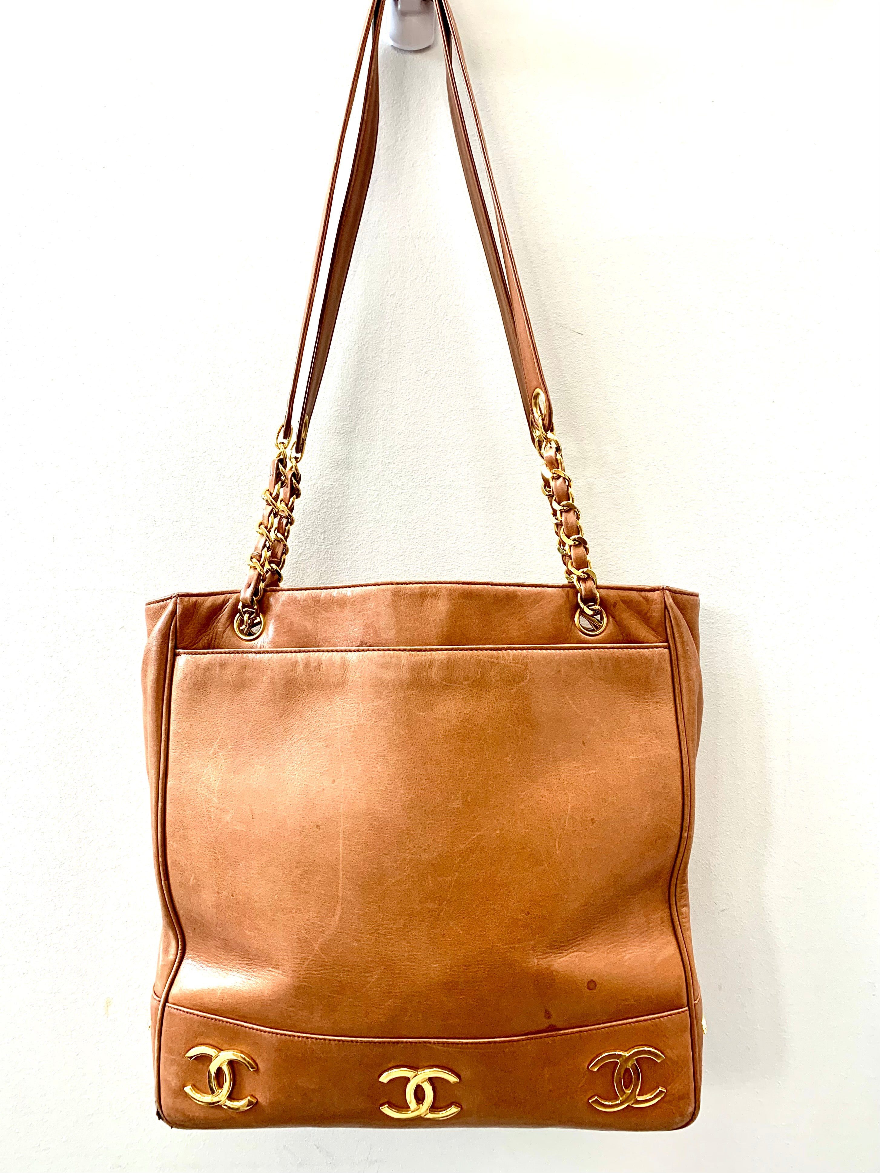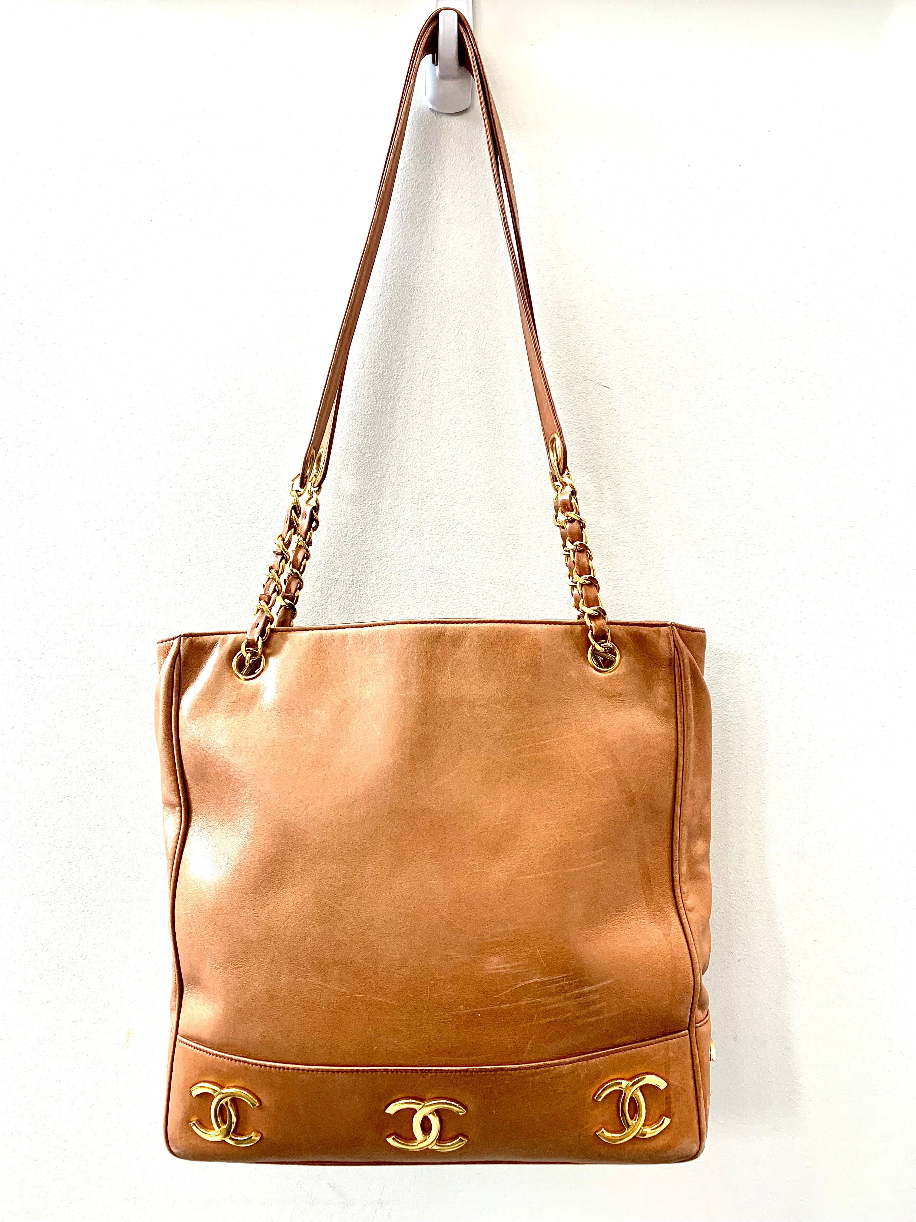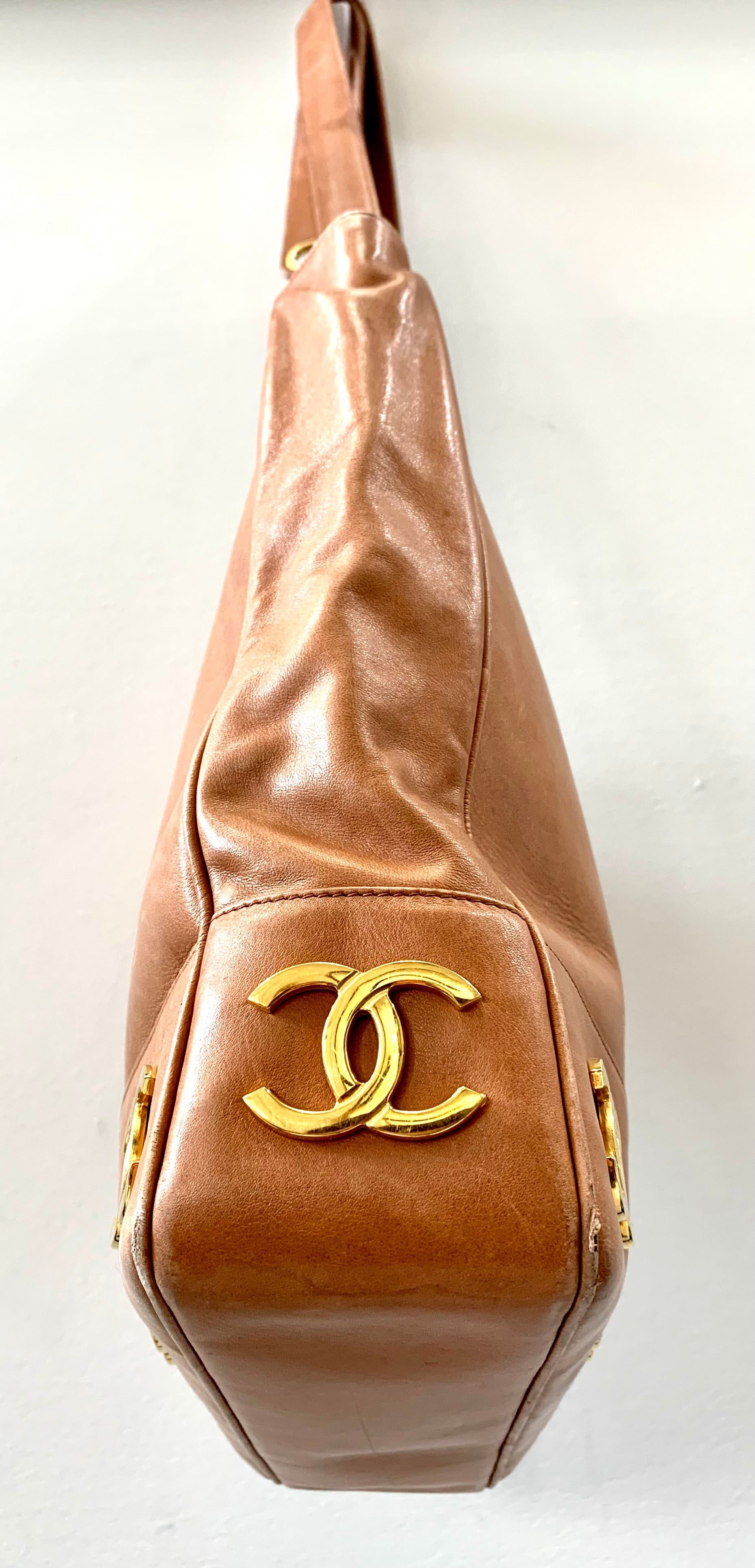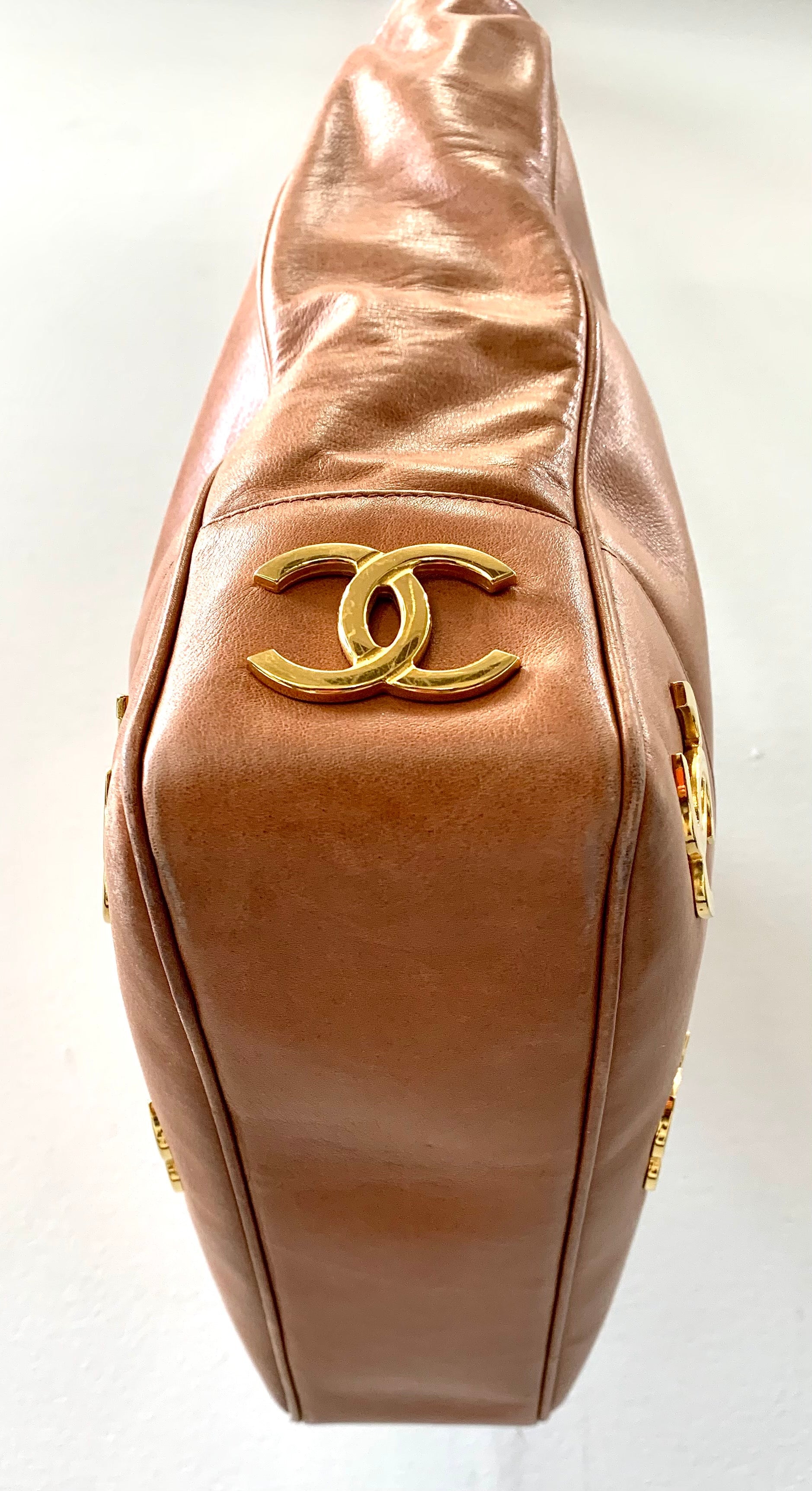 This bag is crafted in soft brown leather and features CC logos in gold-tone detailed around the bottom. There is one deep front pocket on the exterior, and an interior zip pocket. The shoulder strap is woven chain/leather and the interior is leather-lined.