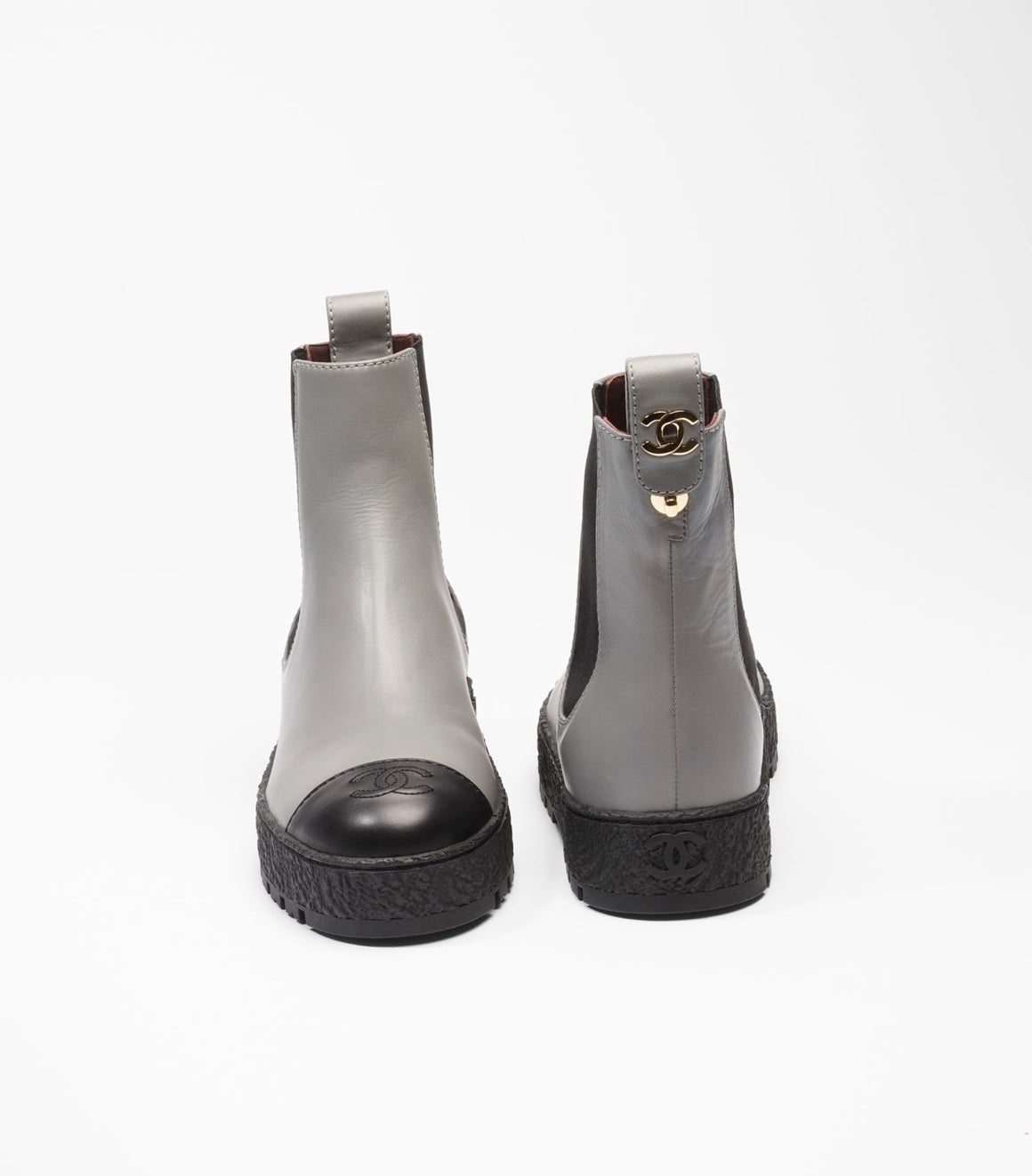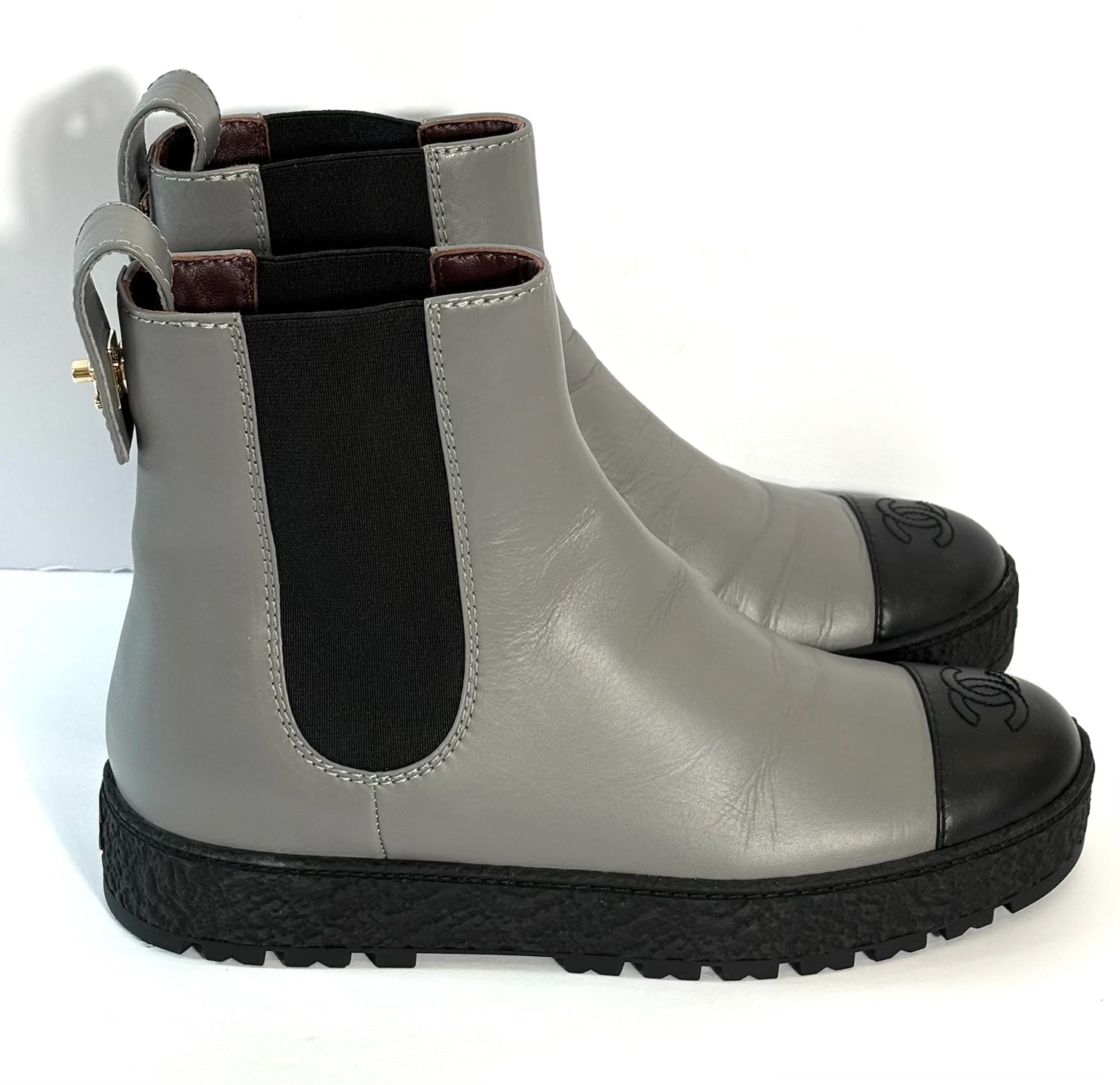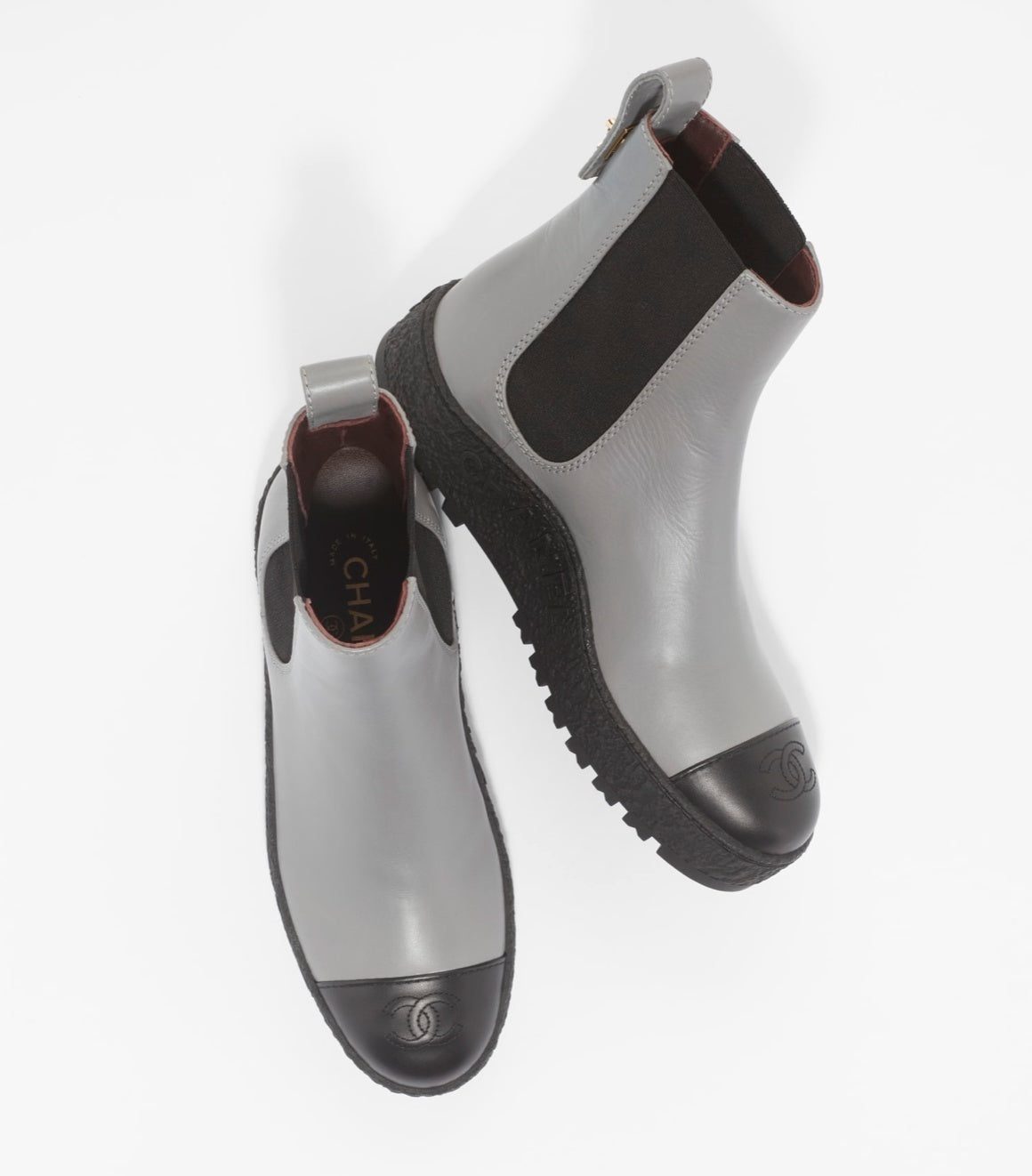 These Stylish Chanel Chelsea boots are crafted from smooth Grey Calfskin leather with a signature black cap toe for a classic contrast. Designed with a sleek silhouette, they feature the iconic black Chanel CC logo at the top of the shaft and a 1.5-inch platform sole for added height and edge.