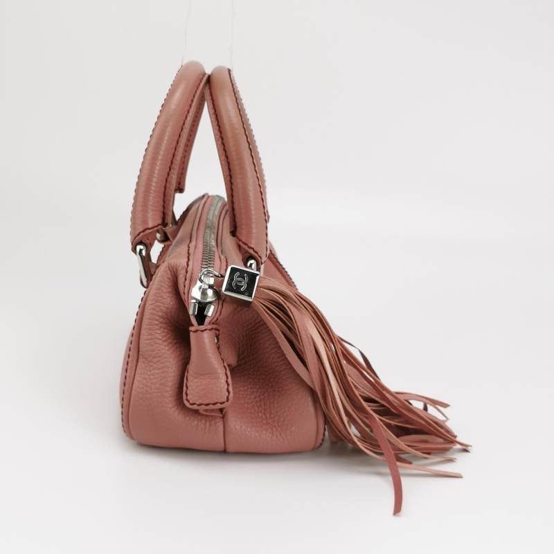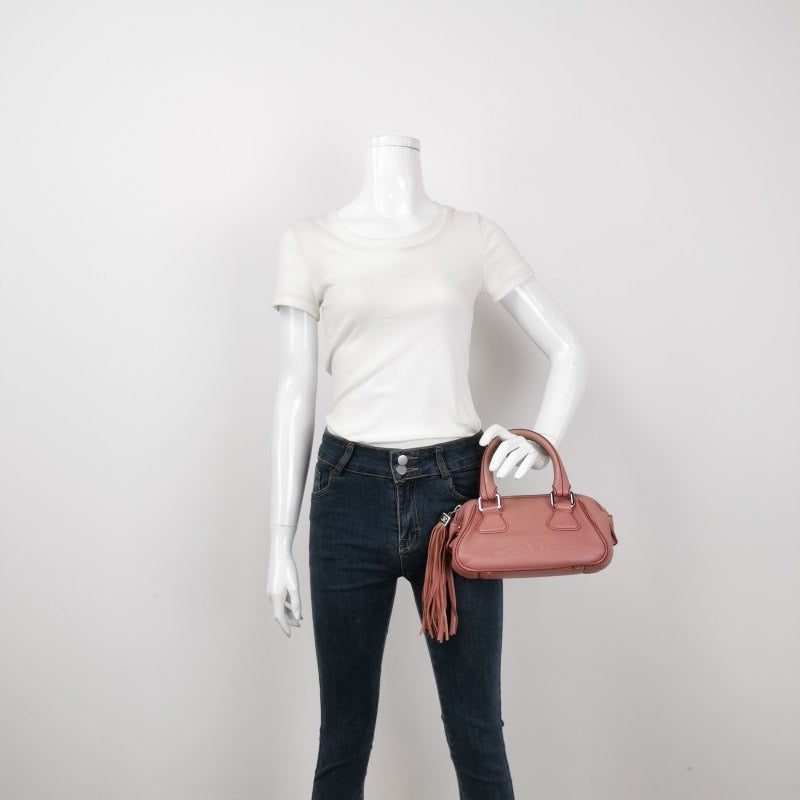 This is a genuine CHANEL Caviar Patent Quilted Small Bowler Bag in rare pink. Expertly crafted in durable pebbled calfskin leather, this elegant Chanel duffel features two top leather handles, stitched piping detail, a stitched Chanel logo on the front and a tassel on the side. The top zipper reveals a fabric interior with a zippered pocket.