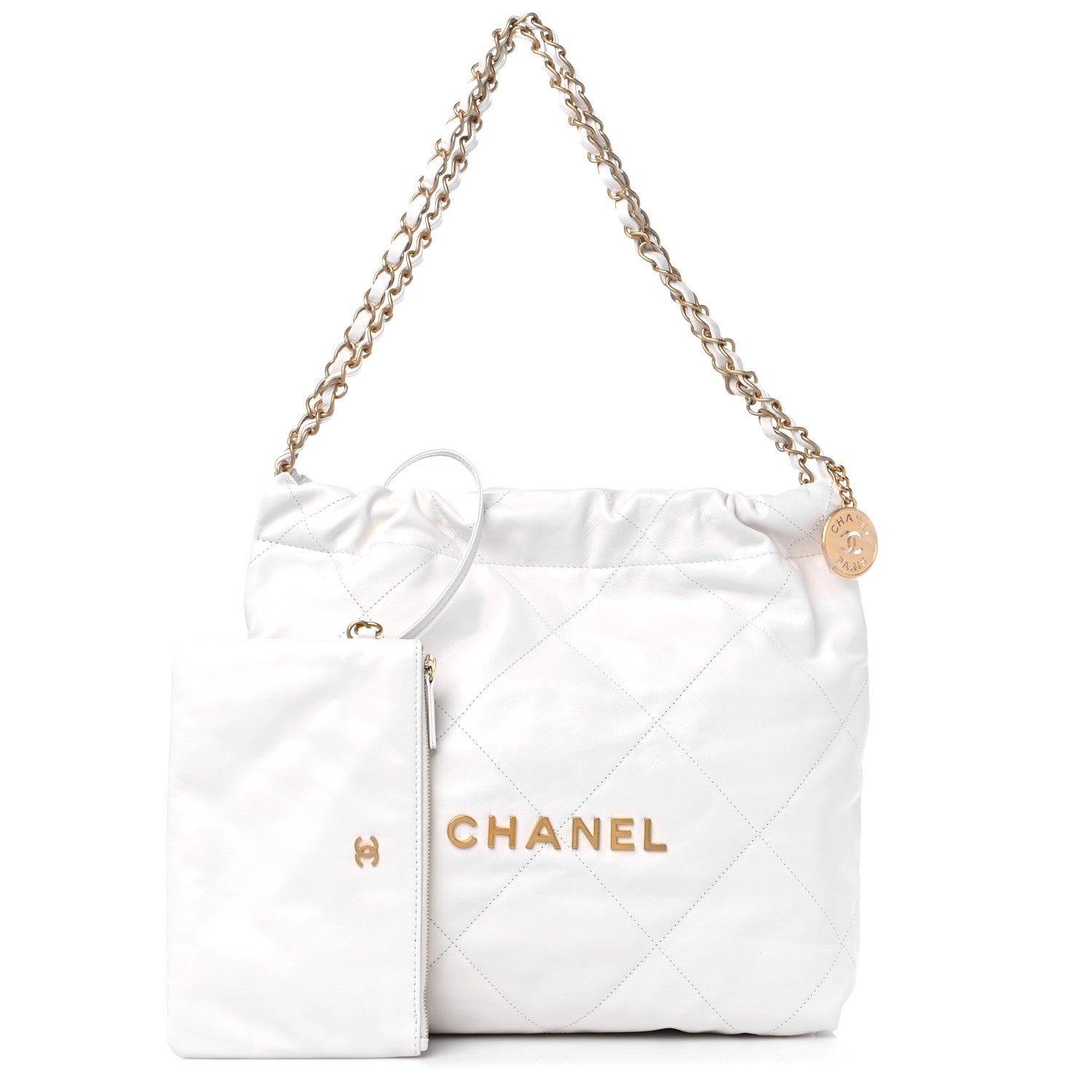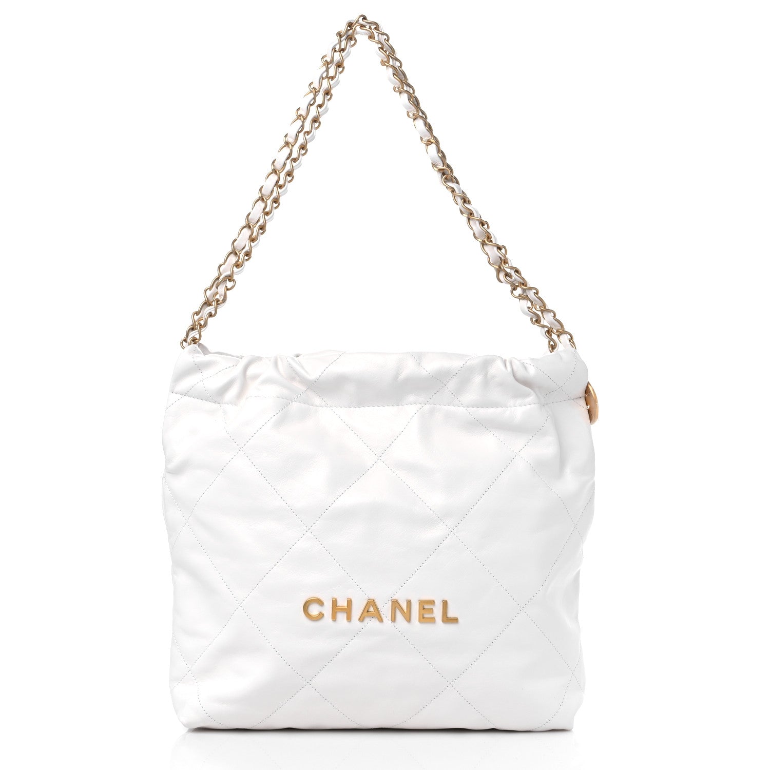 The CHANEL Small 22 Hobo Bag is an Exquisite Blend of Modern Sophistication and Timeless Elegance. Crafted from luxurious diamond-quilted shiny calfskin leather in white, this effortlessly chic silhouette features soft structure and understated sheen, offering a refined yet relaxed look.