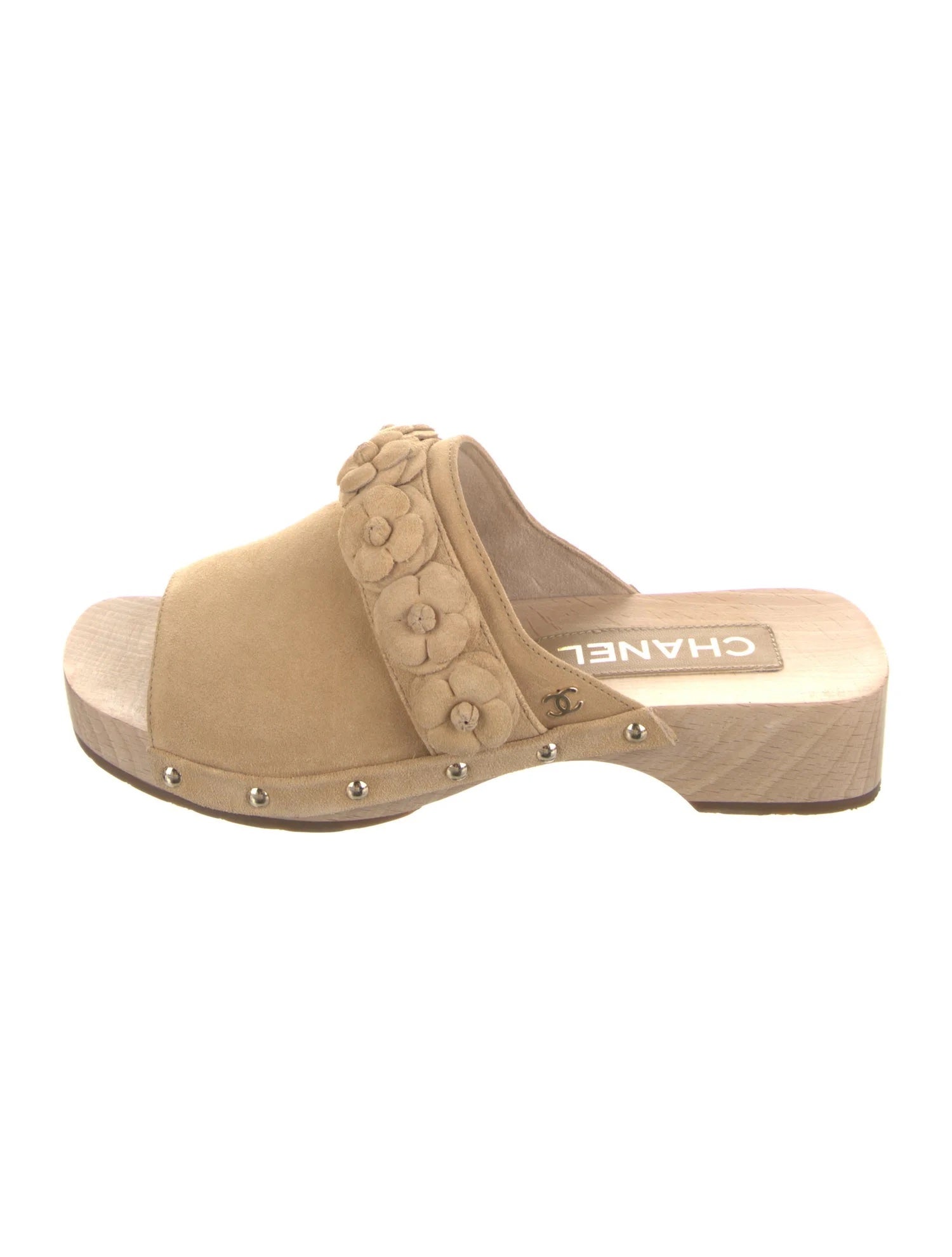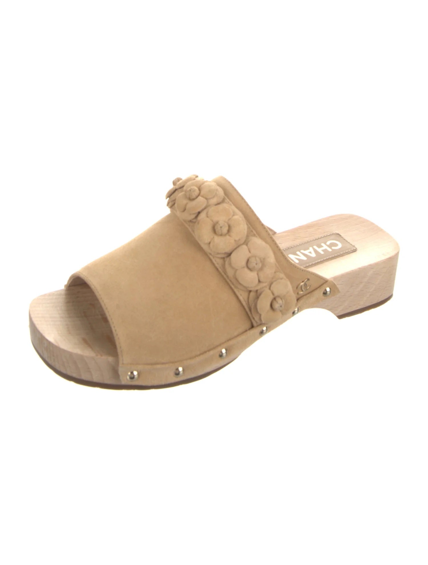CHANEL CALFSKIN SUEDE CAMELLIA MULES CLOGSCHANEL CALFSKIN SUEDE CAMELLIA MULES CLOGS
