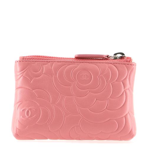 The case features embossed camellia flowers and a small silver Chanel CC logo on the front. The top zipper opens to a pink fabric interior with room enough for cosmetics.Â