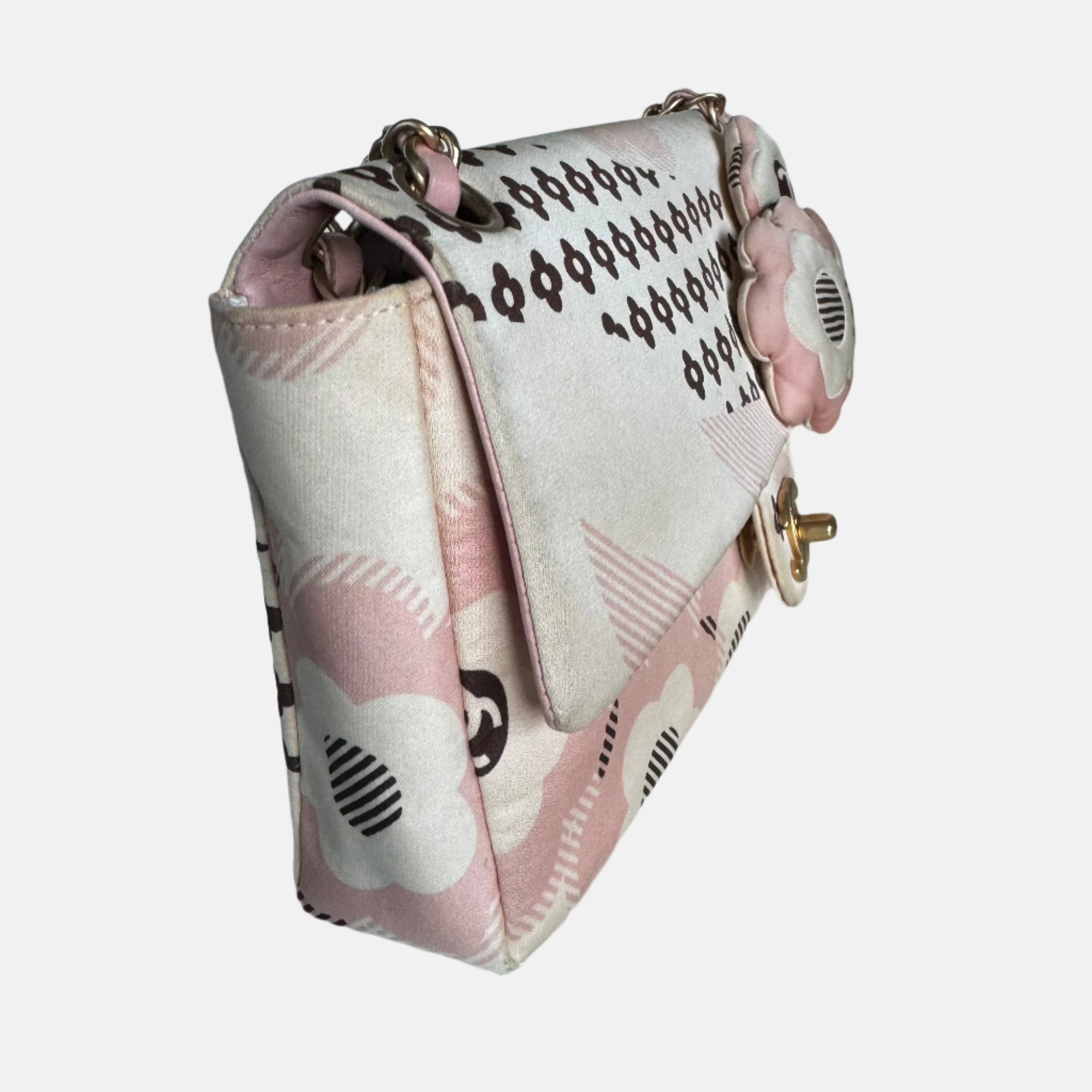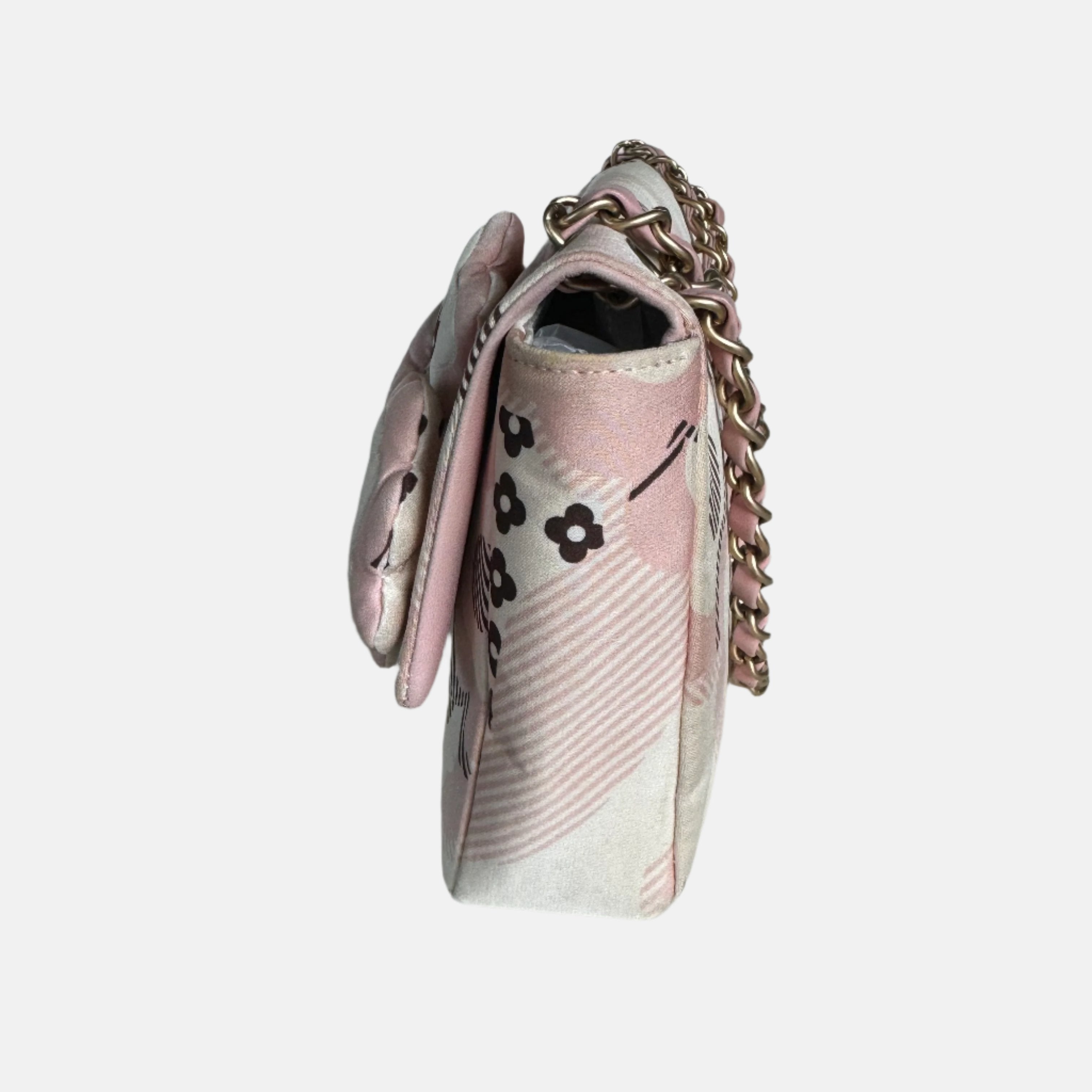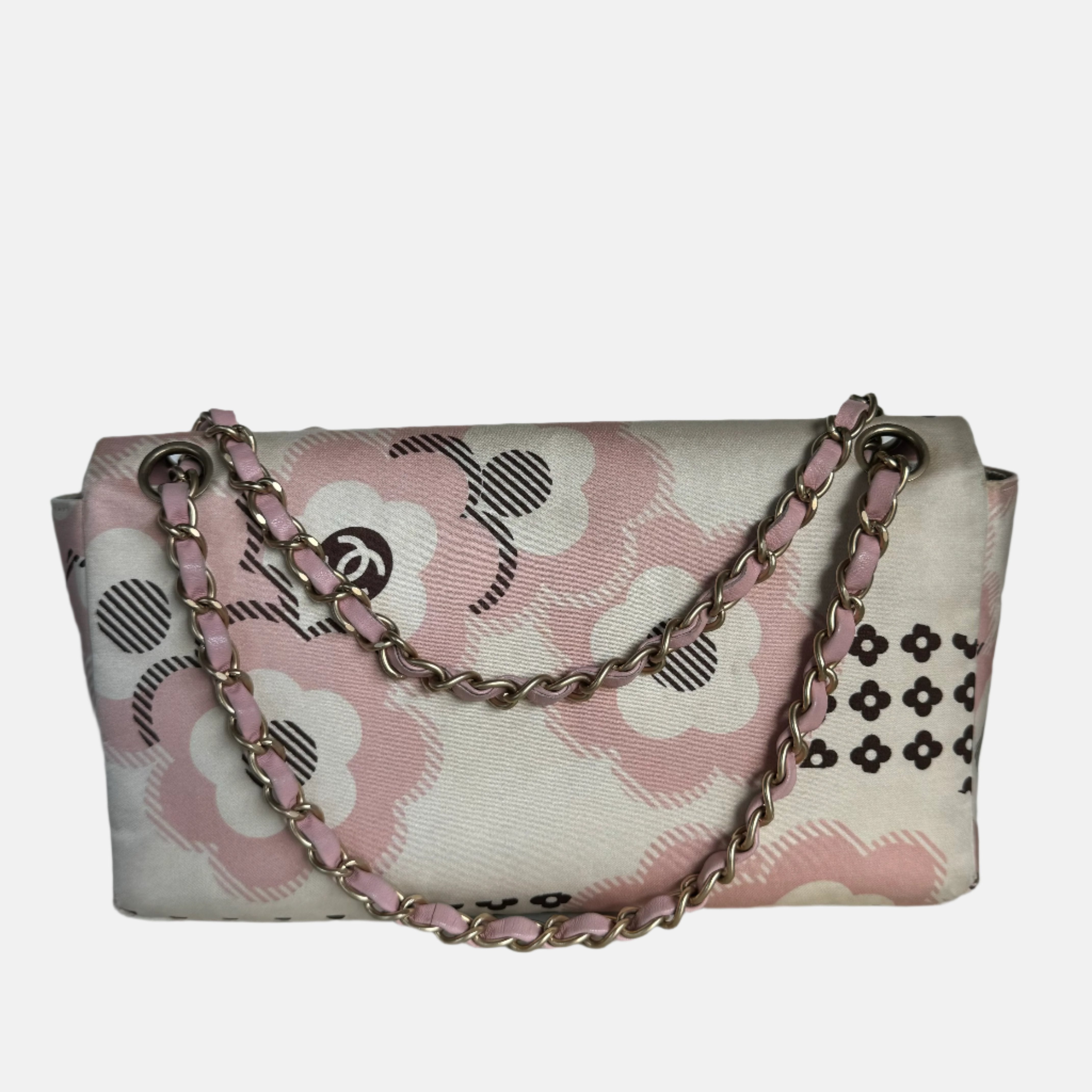 This Chanel Camellia Flap Bag Printed Satin Medium, crafted in beige and pink printed satin, features woven in leather chain link straps and matte gold-tone hardware. Its CC turn-lock closure opens to a white fabric interior with zip pocket.Â