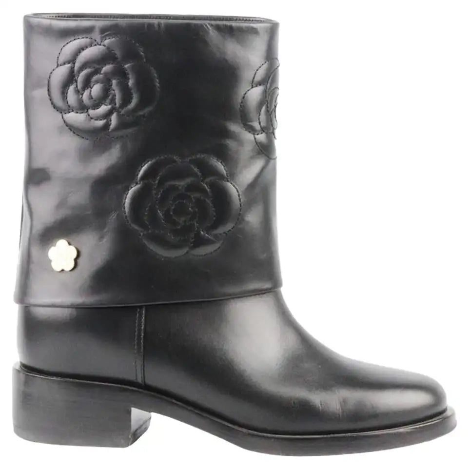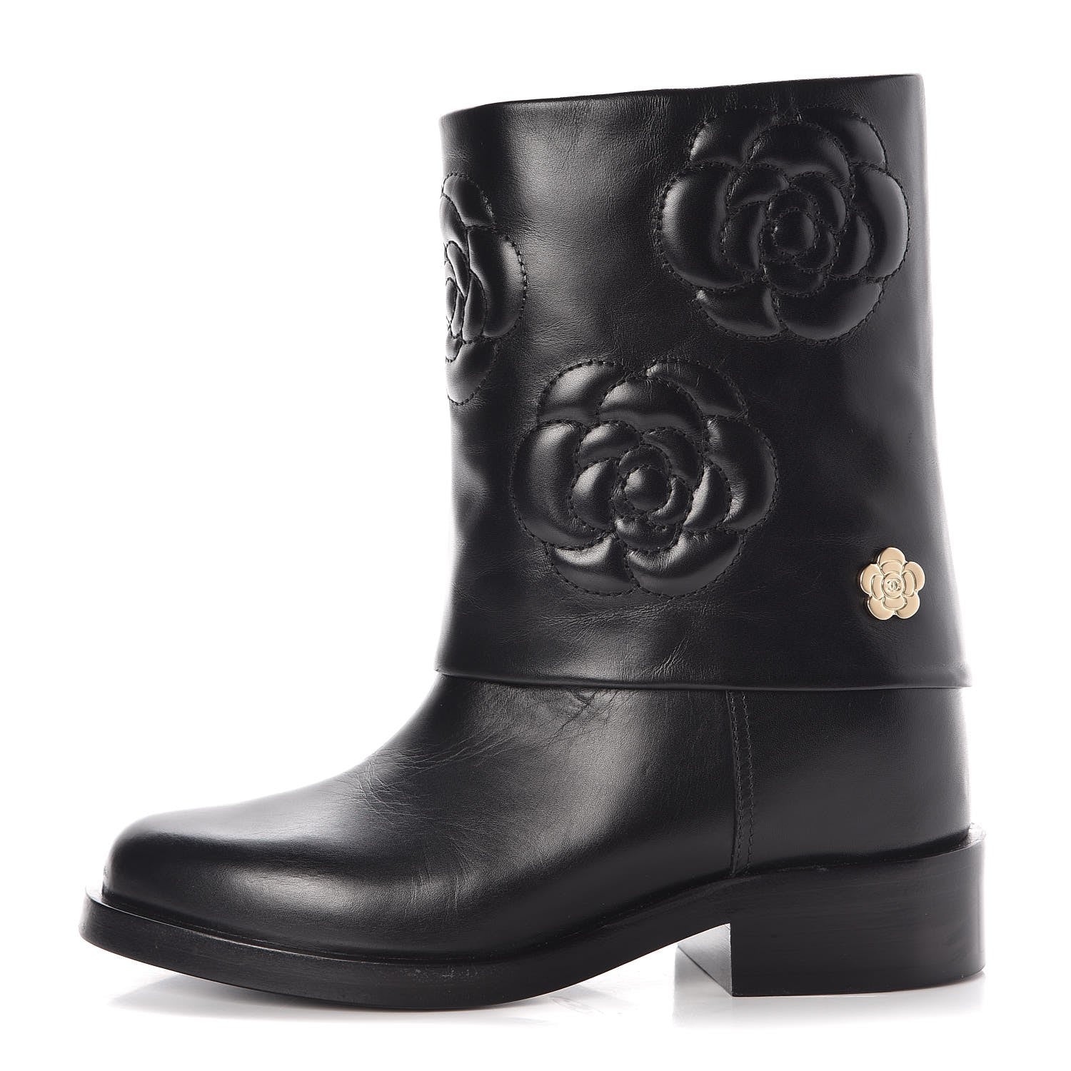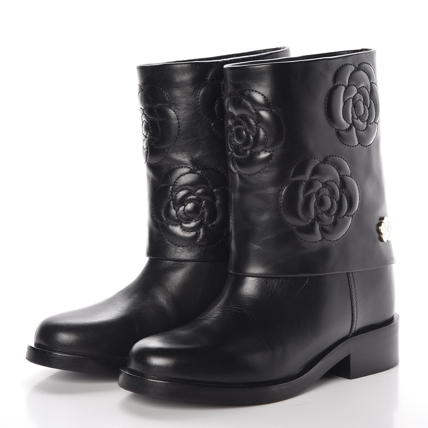 Crafted of calfskin leather in black with camellia flowers embossed.