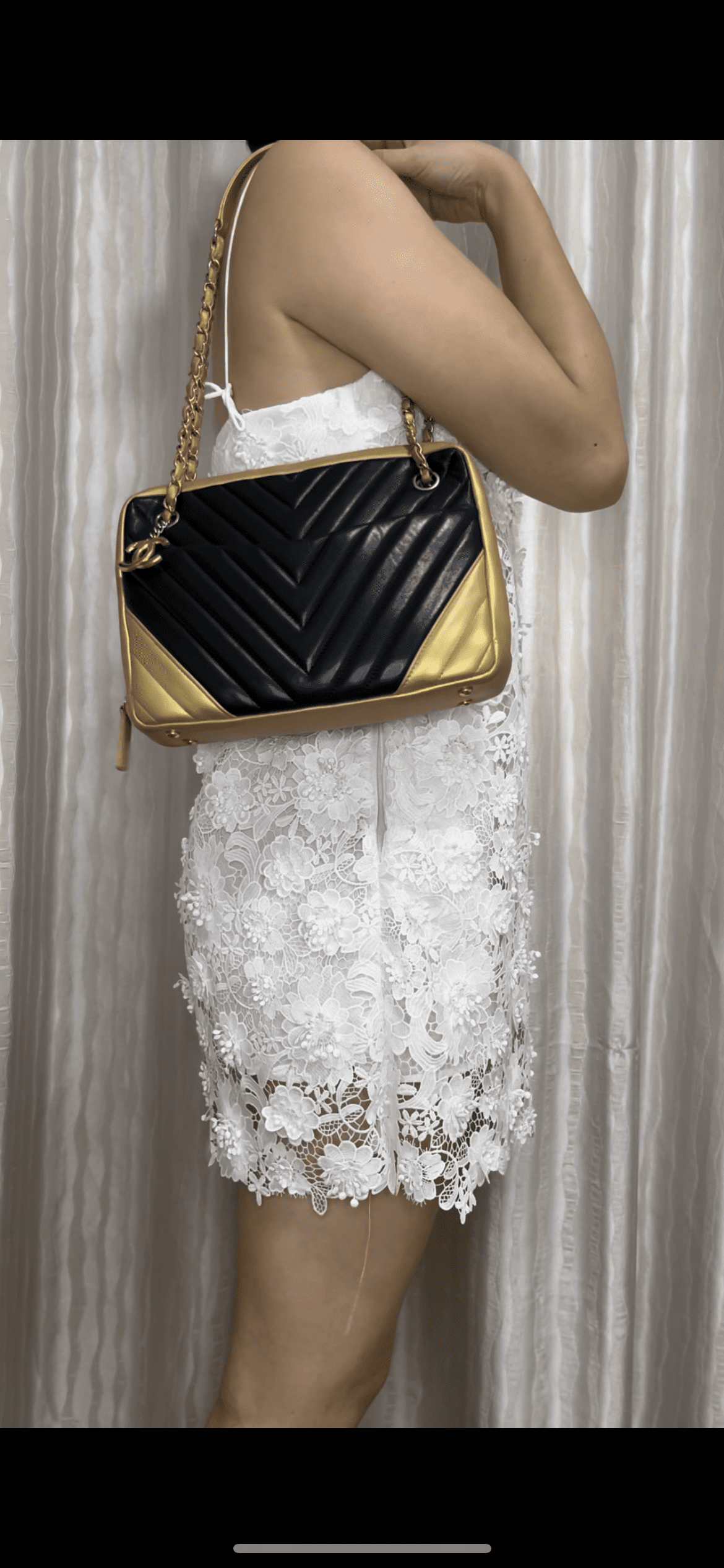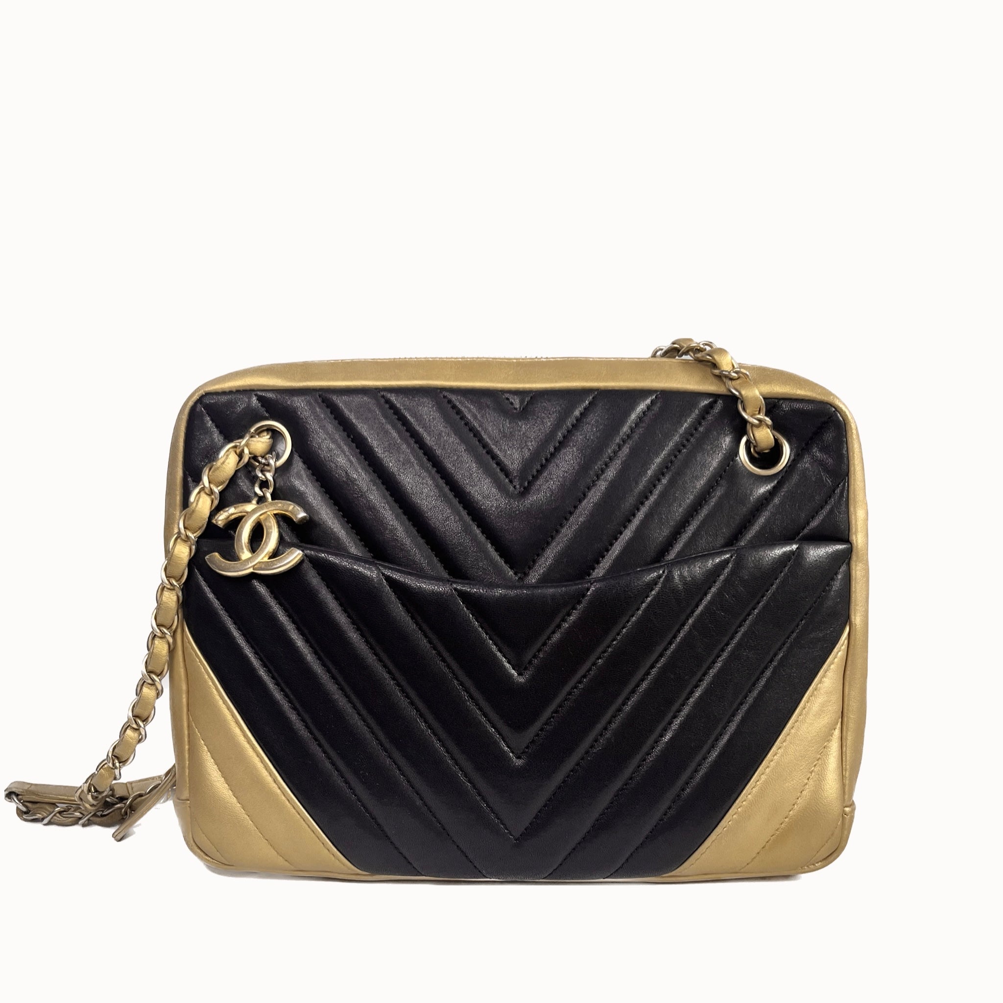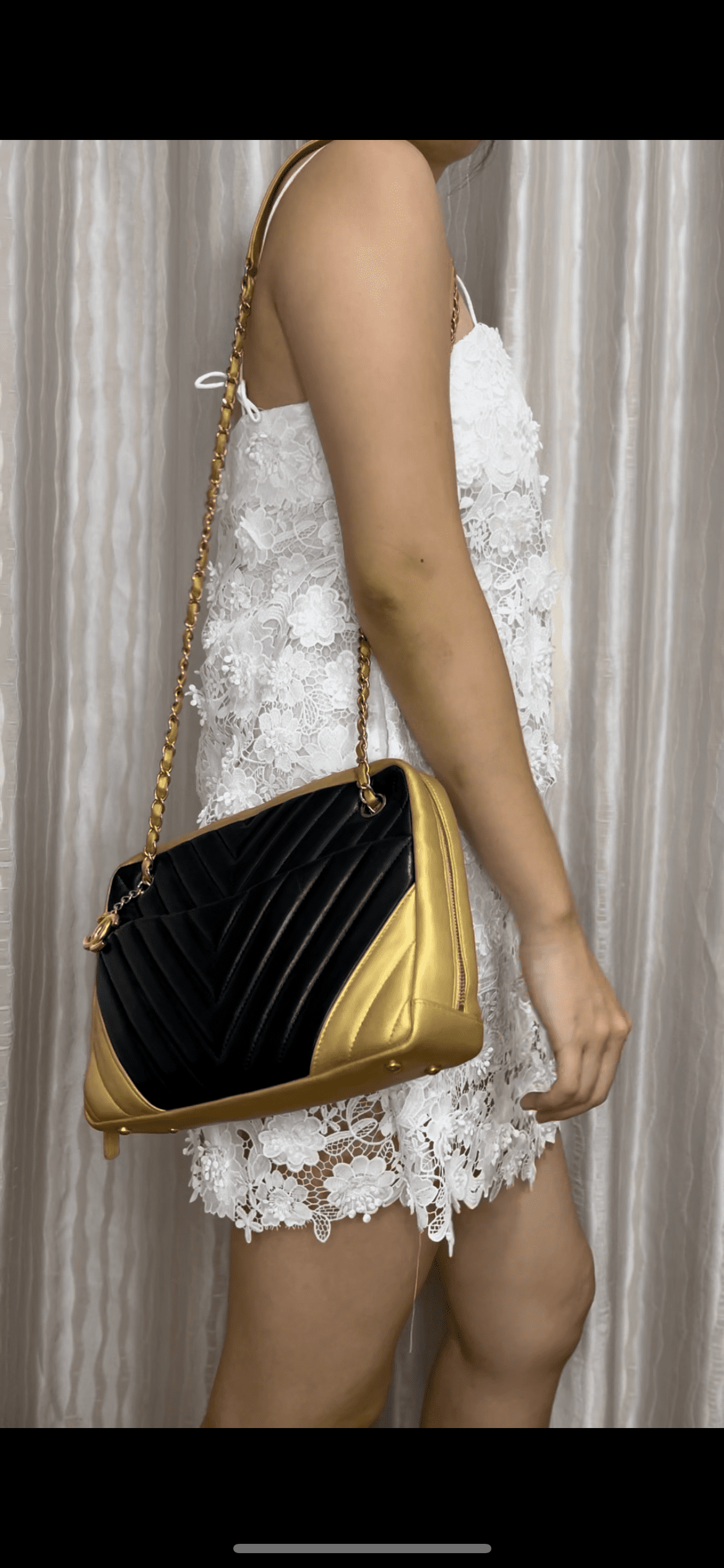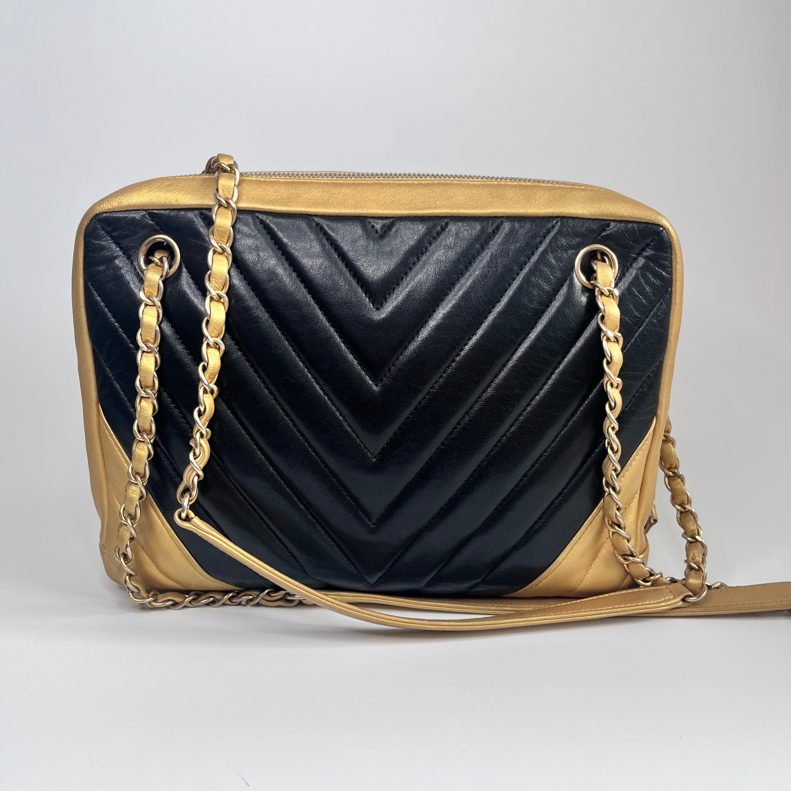 Chanel CC Chevron Black and Gold Lambskin Leather bag. Gold hardware. The strap can be shortened to wear it on the shoulder, or lengthened on one side to create a long shoulder strap to wear it on the shoulder or crossbody.Â
