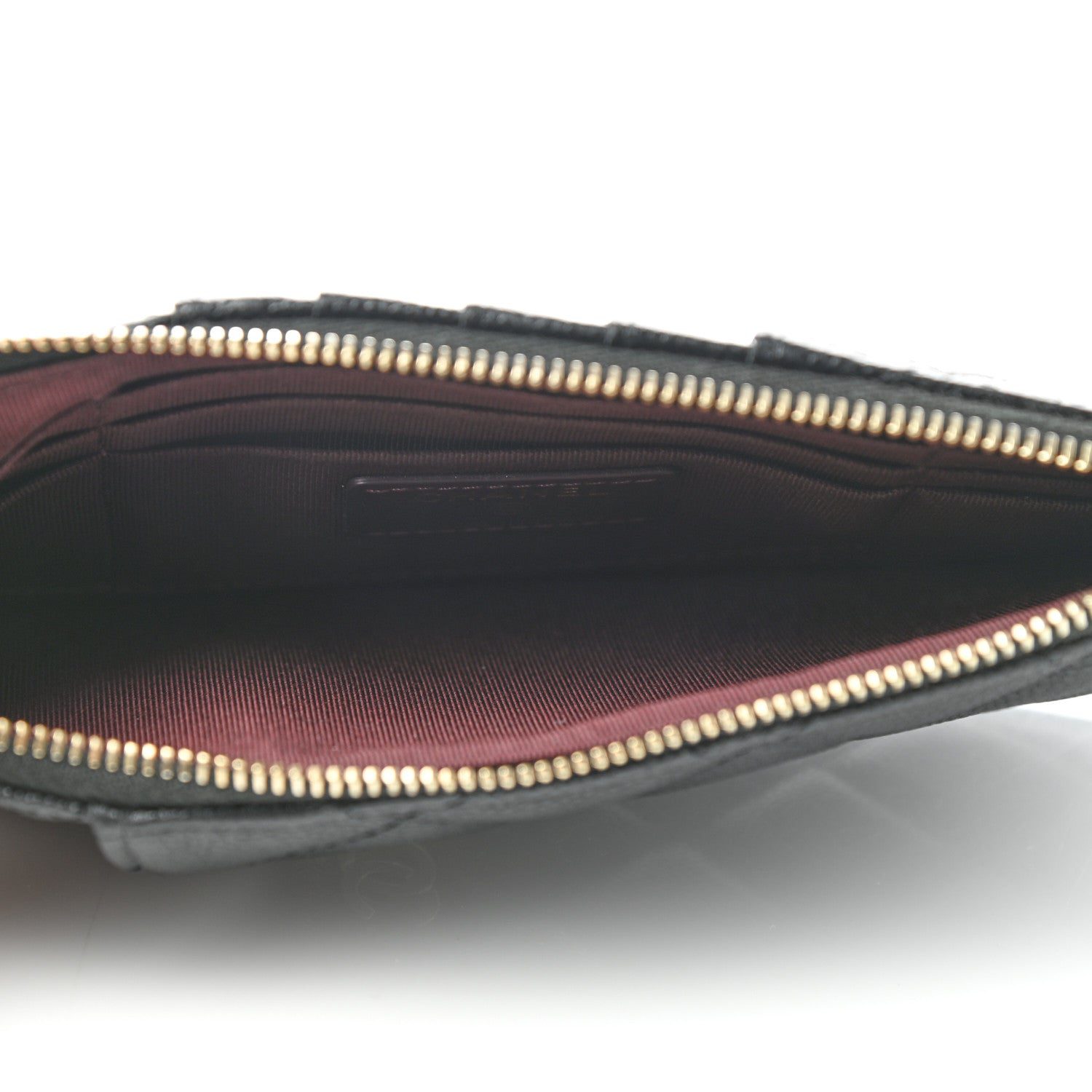 Features a polished gold Chanel CC logo, an exterior patch pocket, card slots, and a side zipper that opens to a burgundy fabric interior.