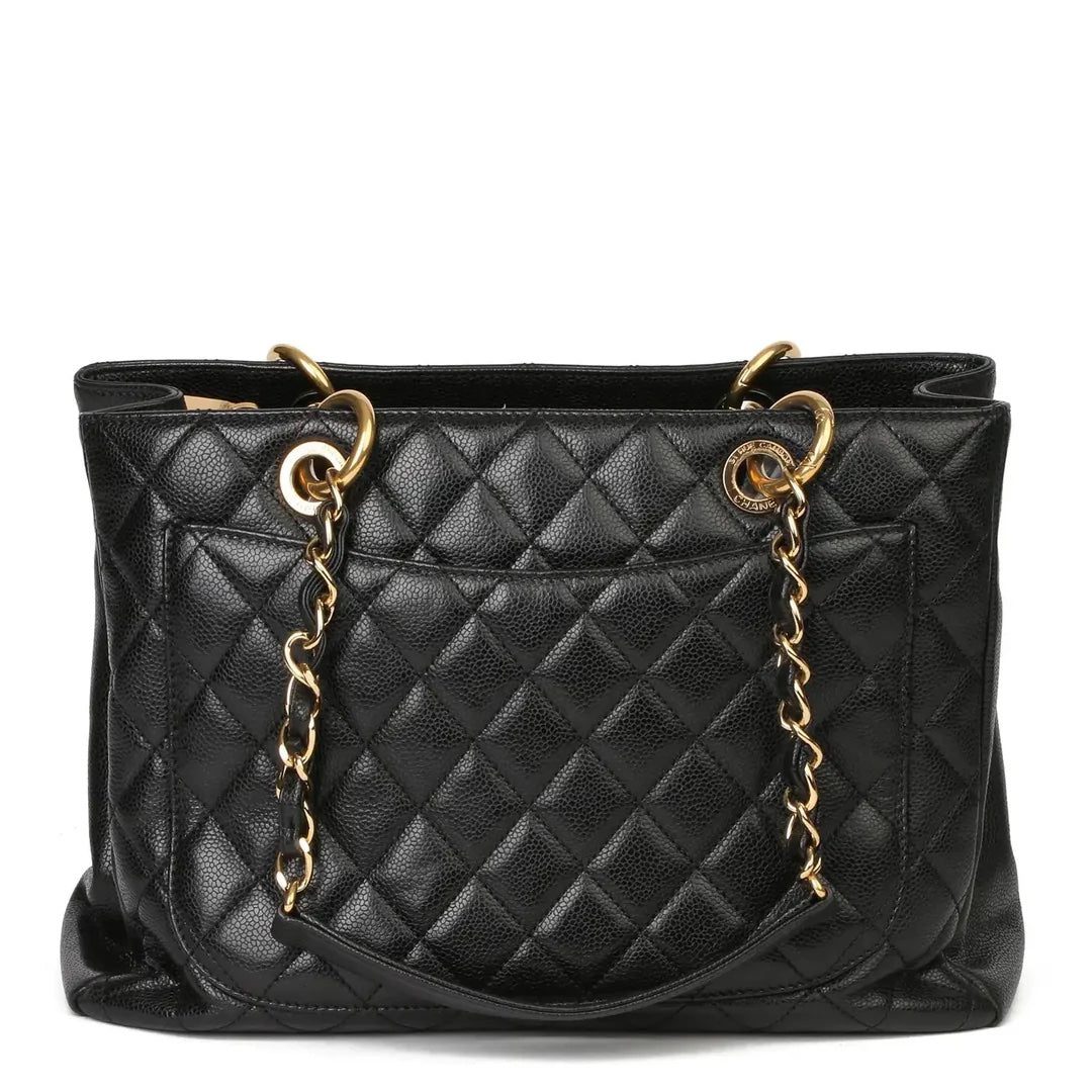 This GST tote is crafted of diamond quilted caviar leather in black. It features leather threaded polished gold chain-link shoulder straps with shoulder pads, a quilted Chanel CC logo on the front, and a flat pocket on the rear. The top opens to a partitioned black satin interior with both a zipper and patch pocket.