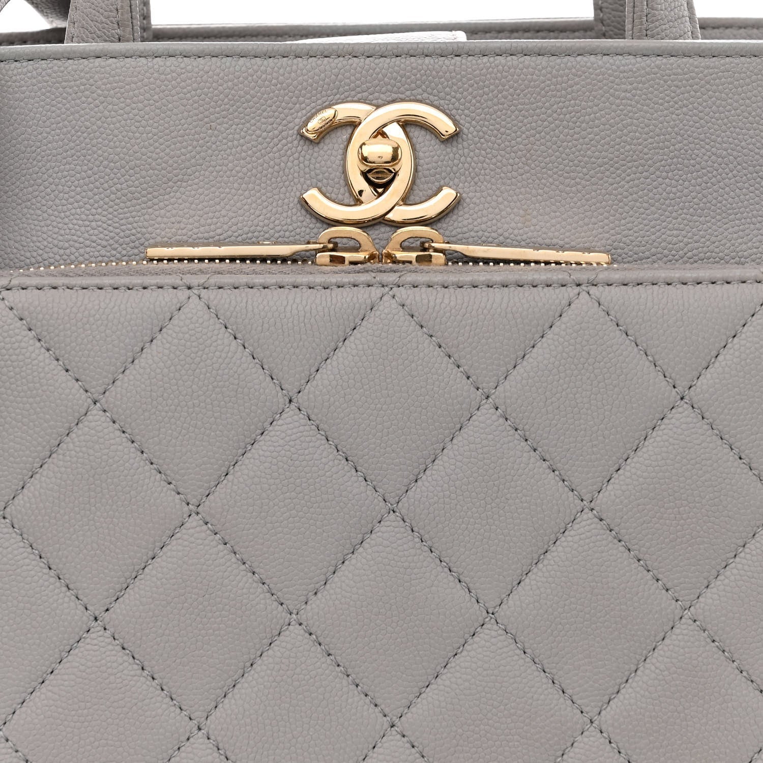This Stunning Tote is beautifully crafted of caviar leather in grey. The bag features rolled top handles, a front zipper pocket, a leather threaded gold chain link shoulder strap with shoulder pad, expandable sides, and a gold Chanel CC turn lock. The top opens to a very spacious grey fabric interior with zipper and patch pockets.