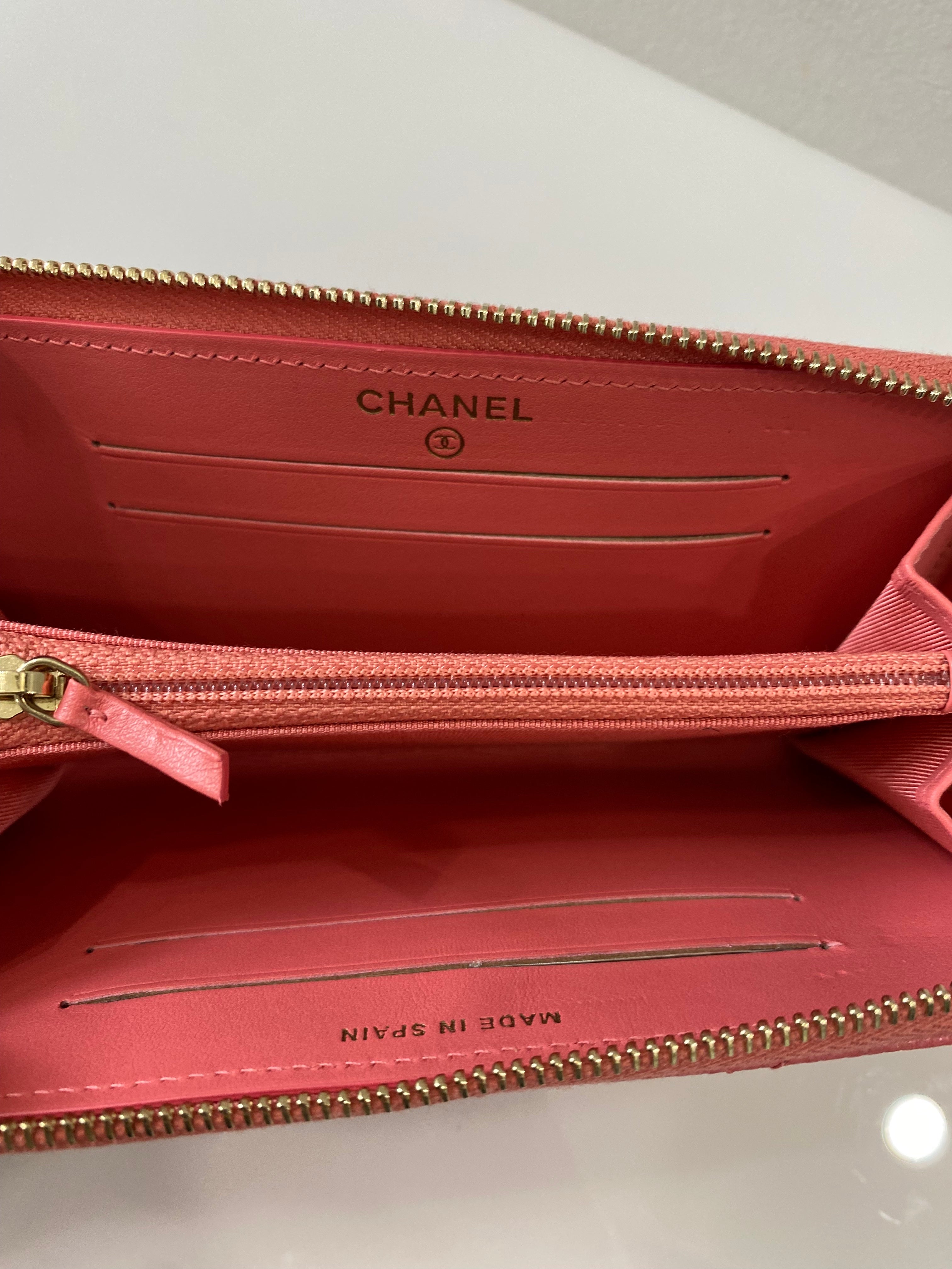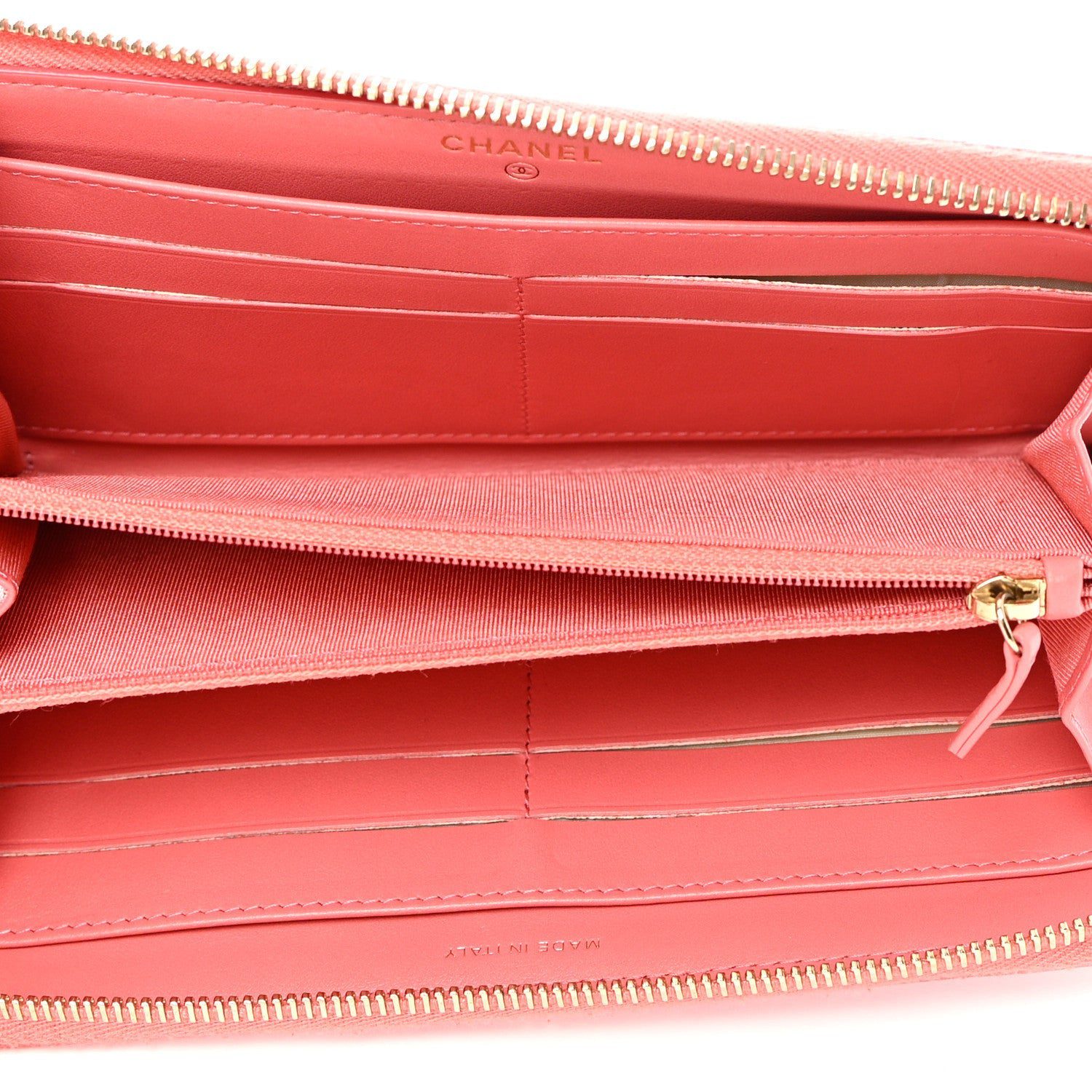 CHANEL Caviar Quilted Zippy Wallet in Pink. This wallet is crafted of soft diamond quilted caviar leather in pink. The wallet features a light gold Chanel CC logo on the front, and a matching polished gold toned wrap-around zipper that opens to a partitioned pink fabric interior.