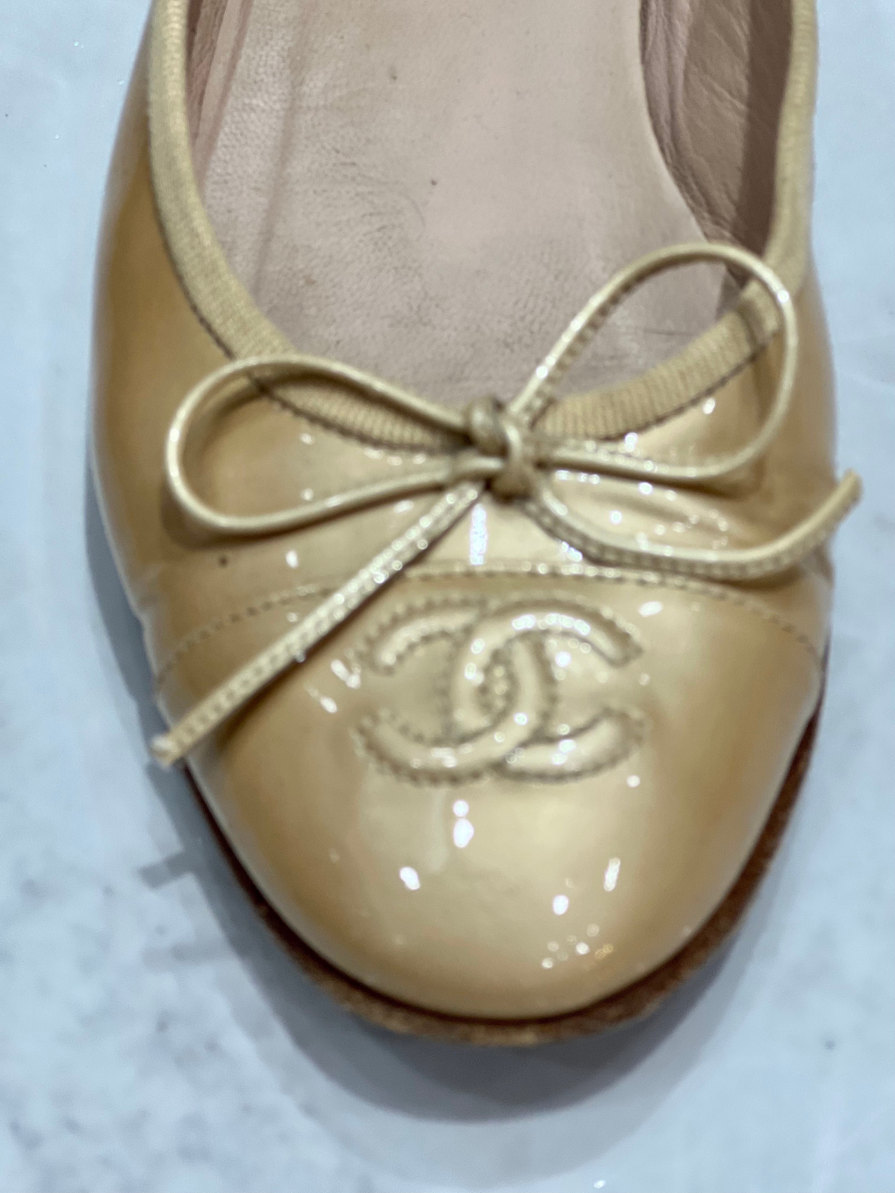 These Chanel Ballet Shoes Feature a half-inch stacked heel, a cap toe with a CC logo, and a leather bow.