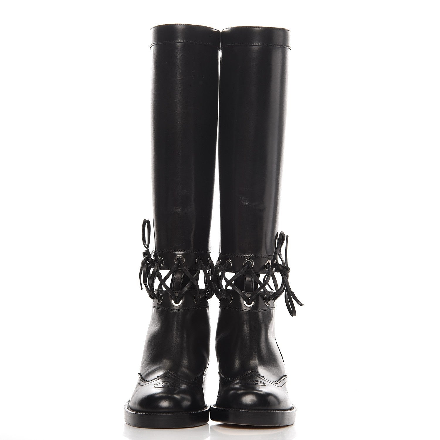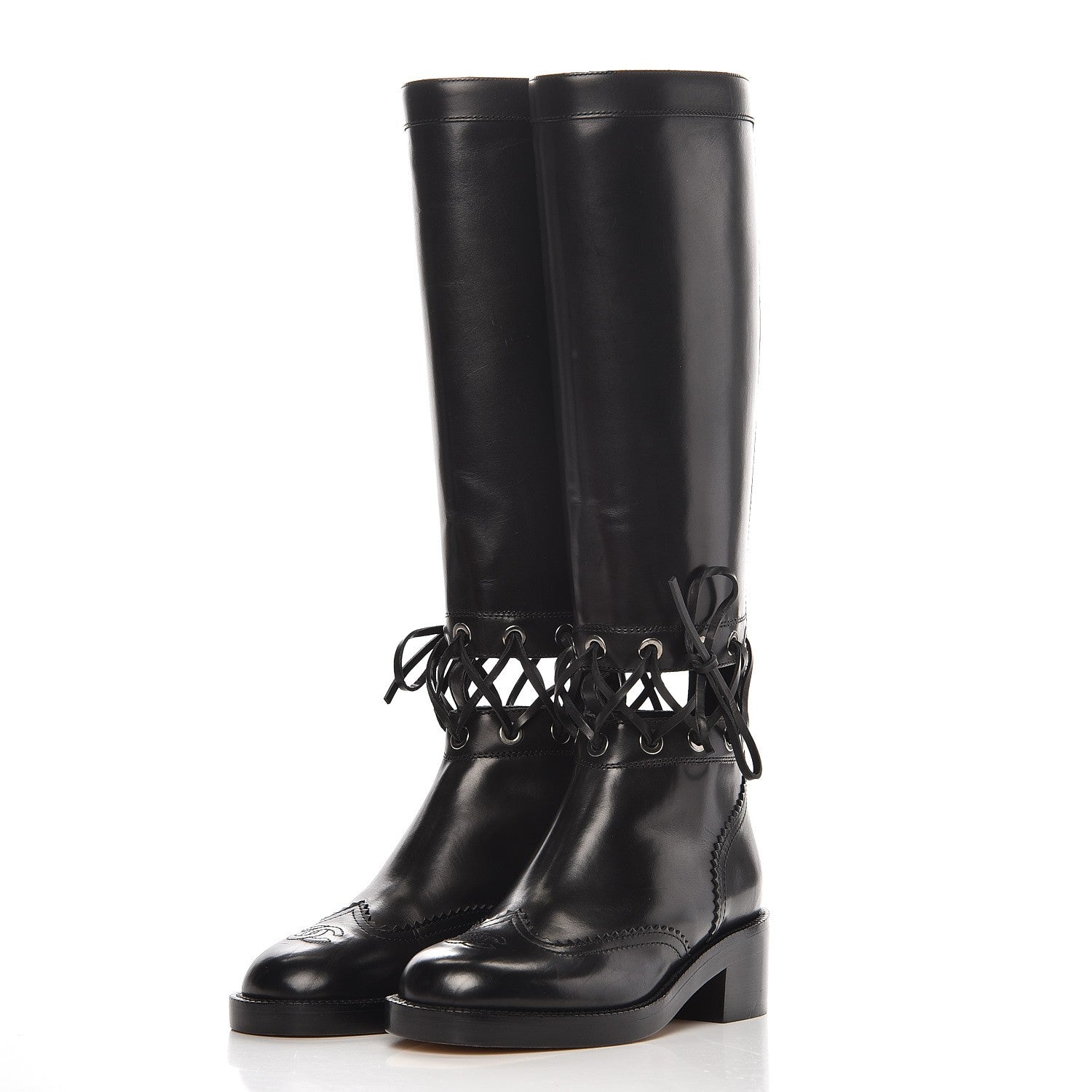 CHANEL CC CALFSKIN CROSS STITCH CUT OUT KNEE HIGH BOOTS
