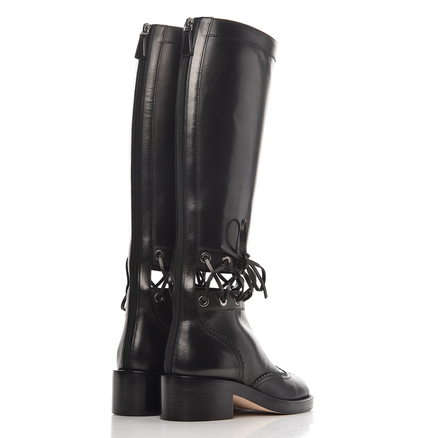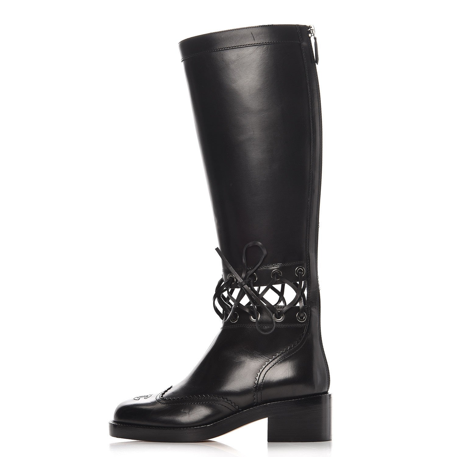 These stylish boots are crafted of knee-high-length black calfskin leather. They feature a two-inch block heel, a full-length zipper down the back, and lace detailing around the ankle.
