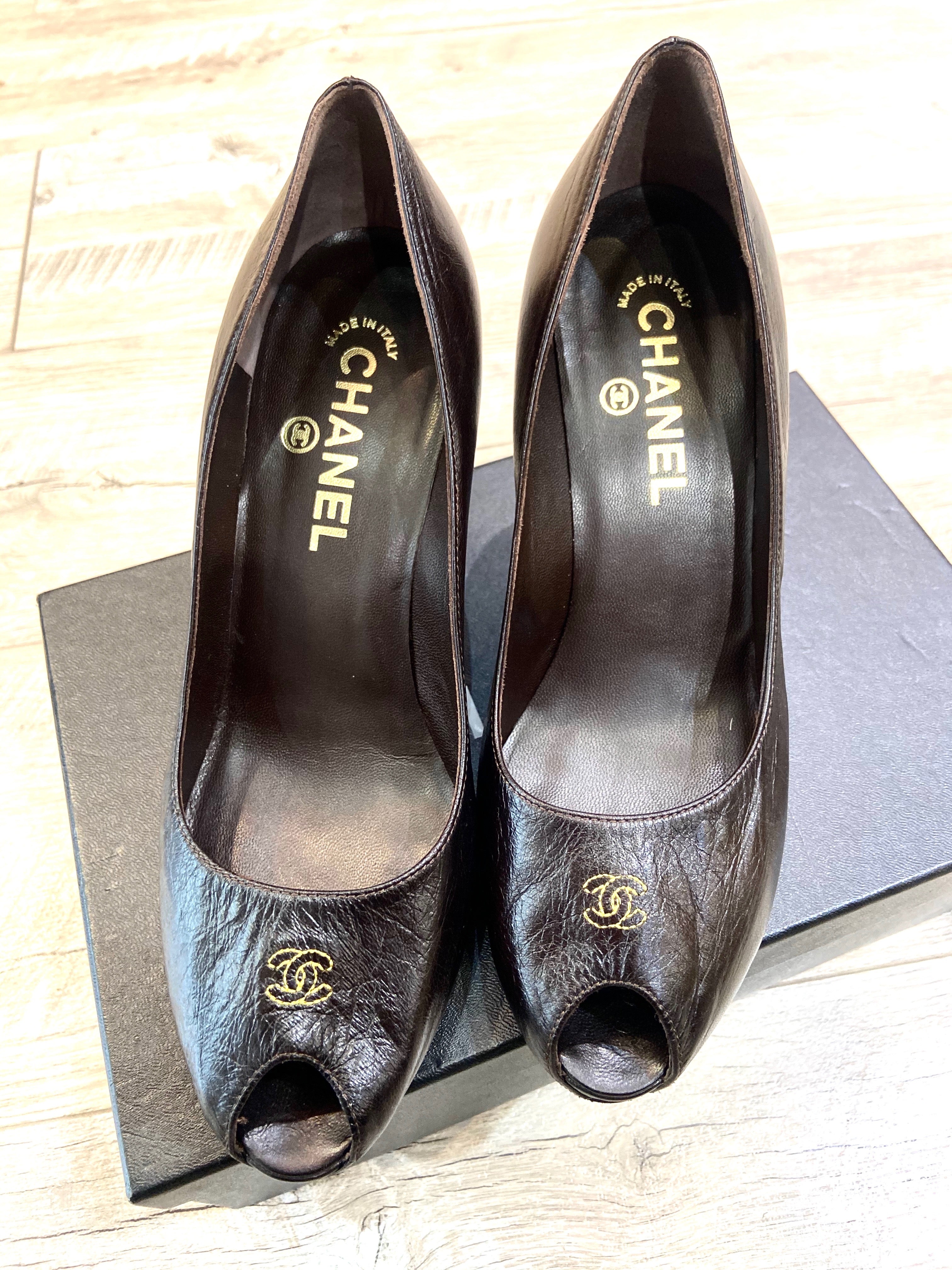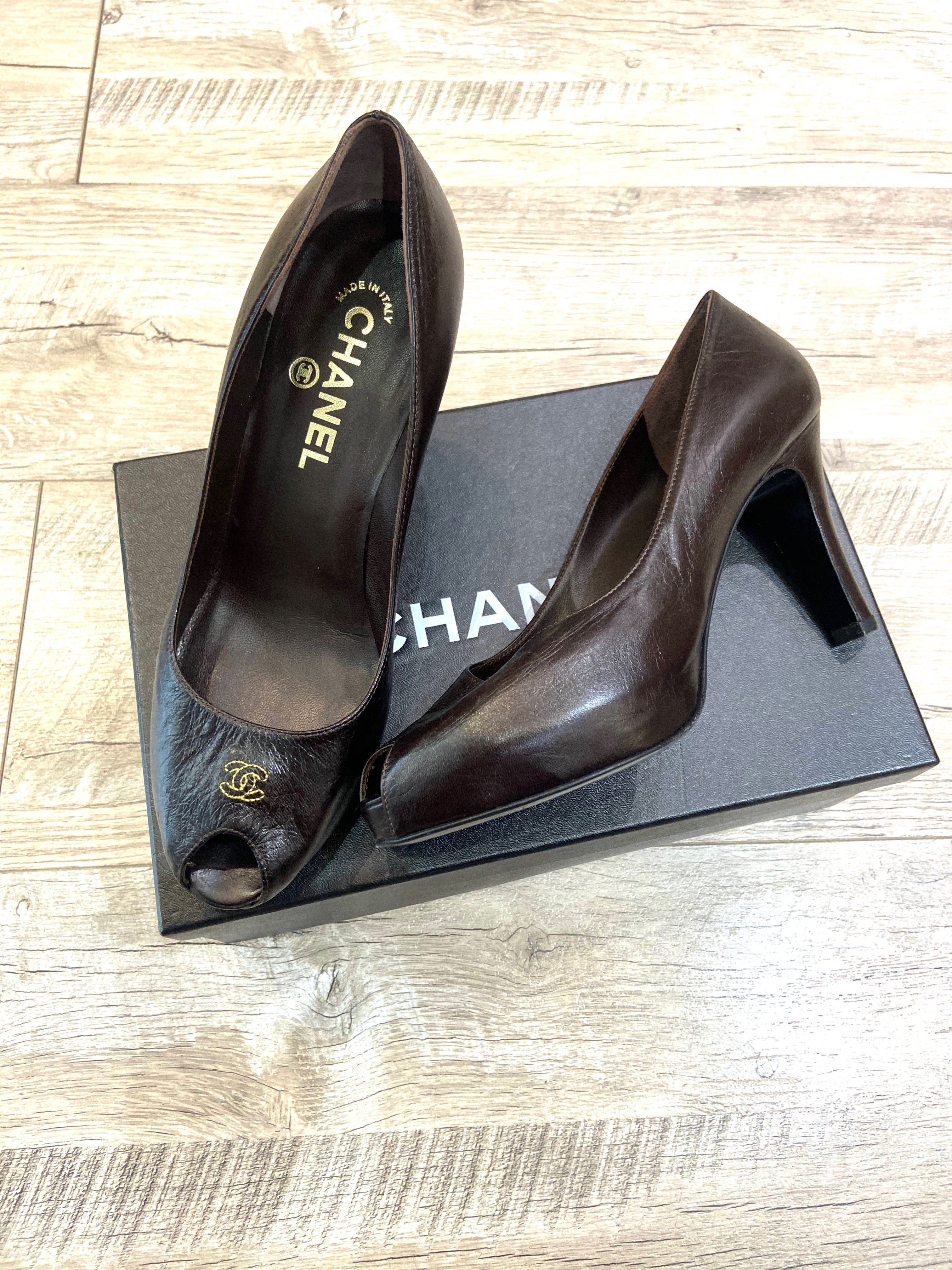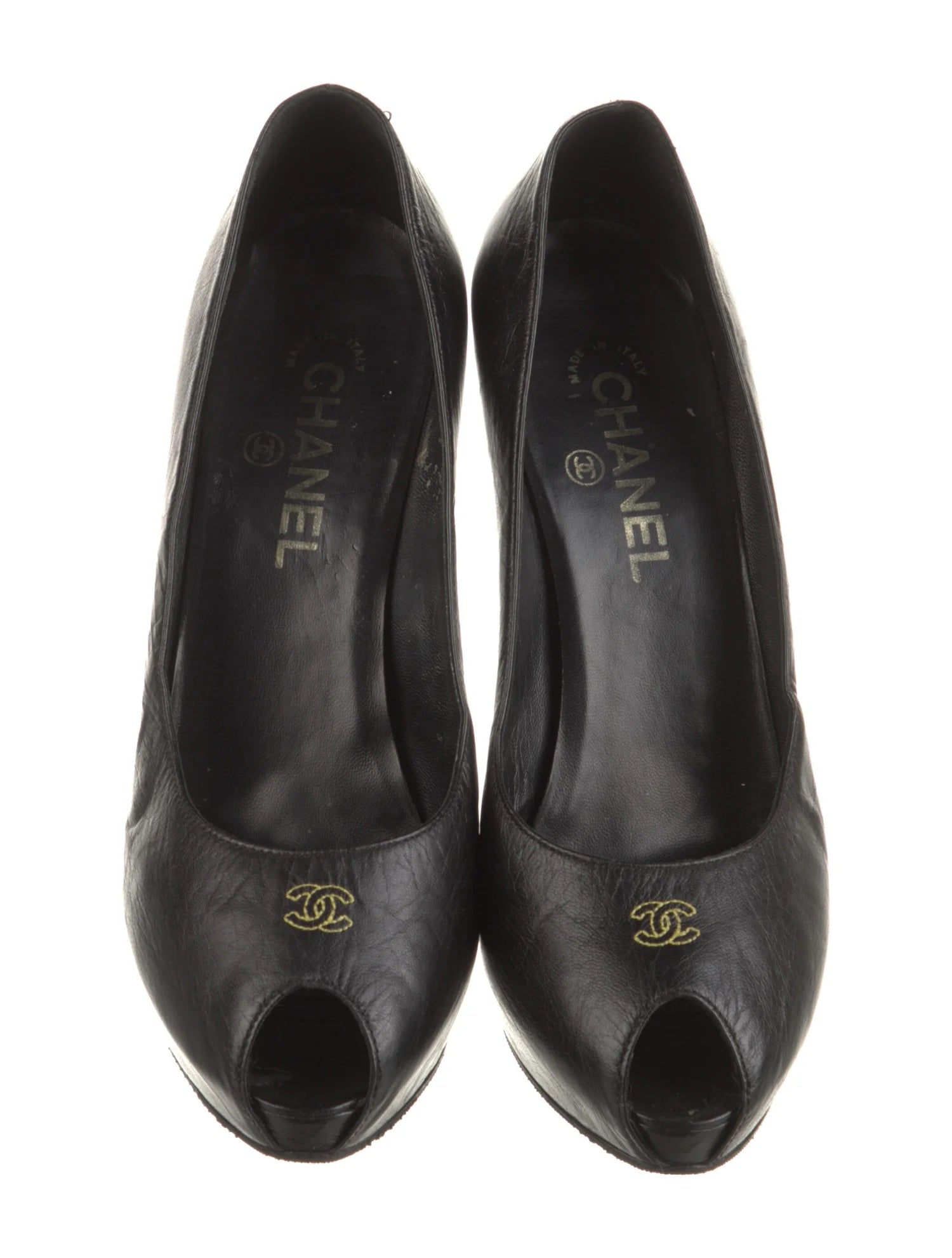 CHANEL CC CALFSKIN LEATHER PEEP TOE PUMPSCHANEL CC CALFSKIN LEATHER PEEP TOE PUMPS