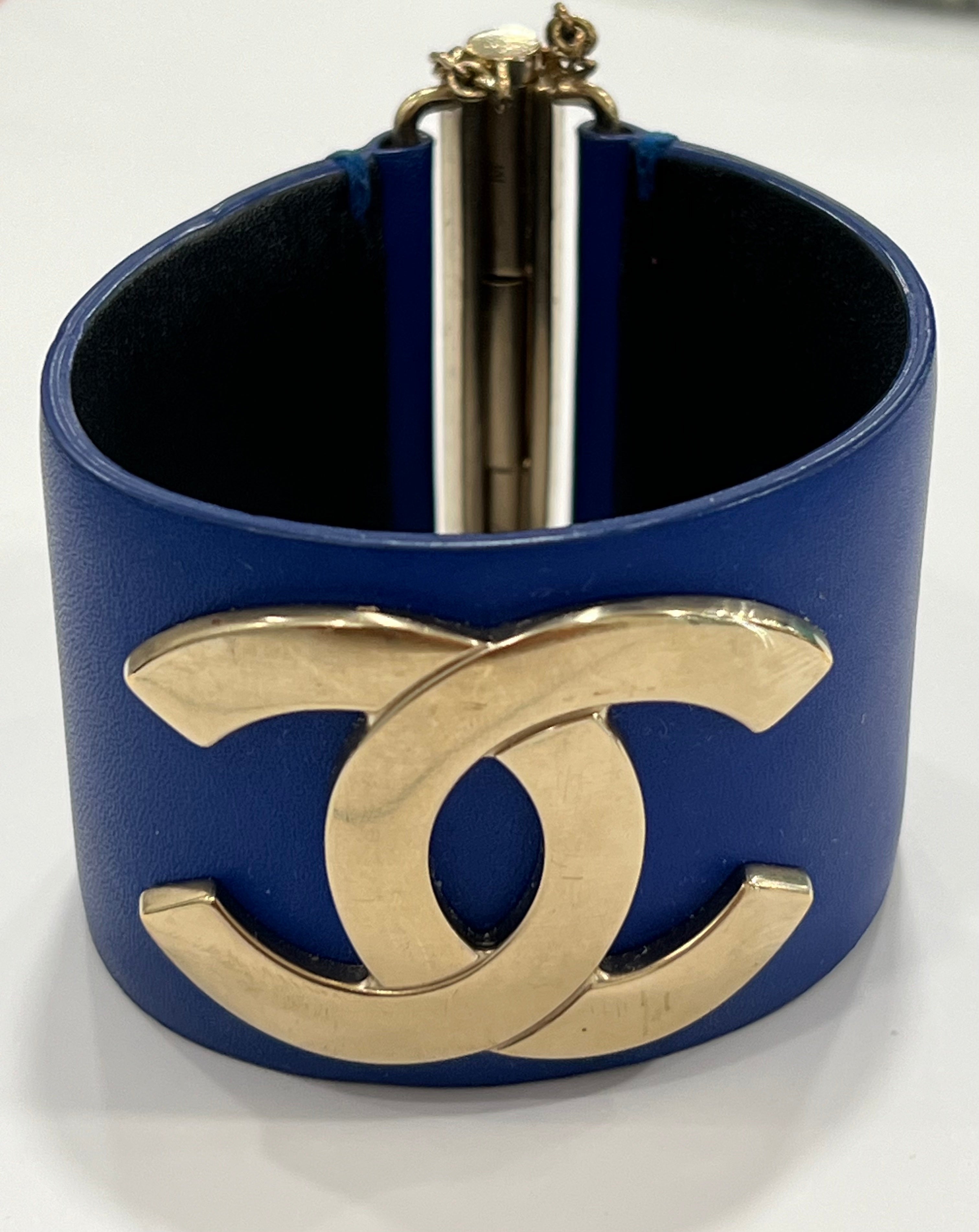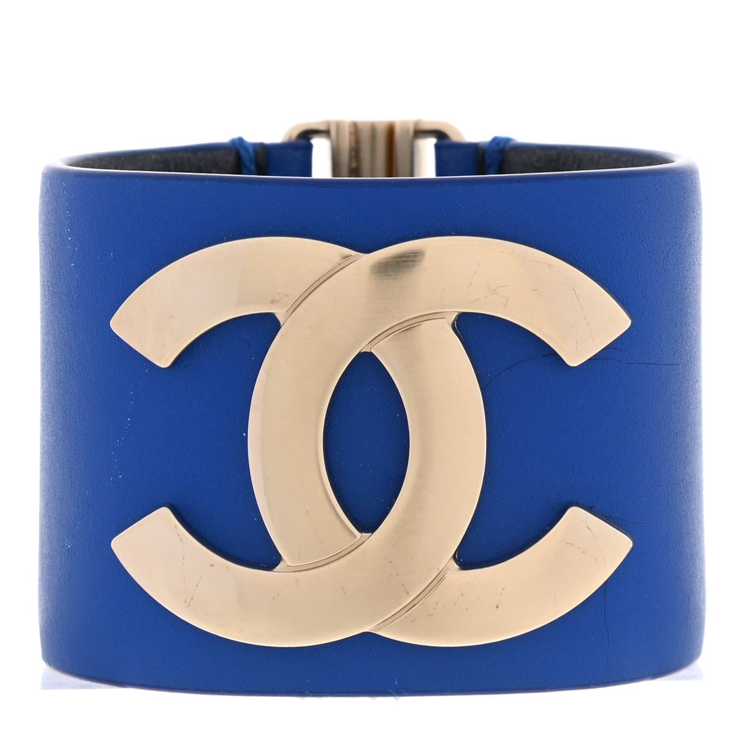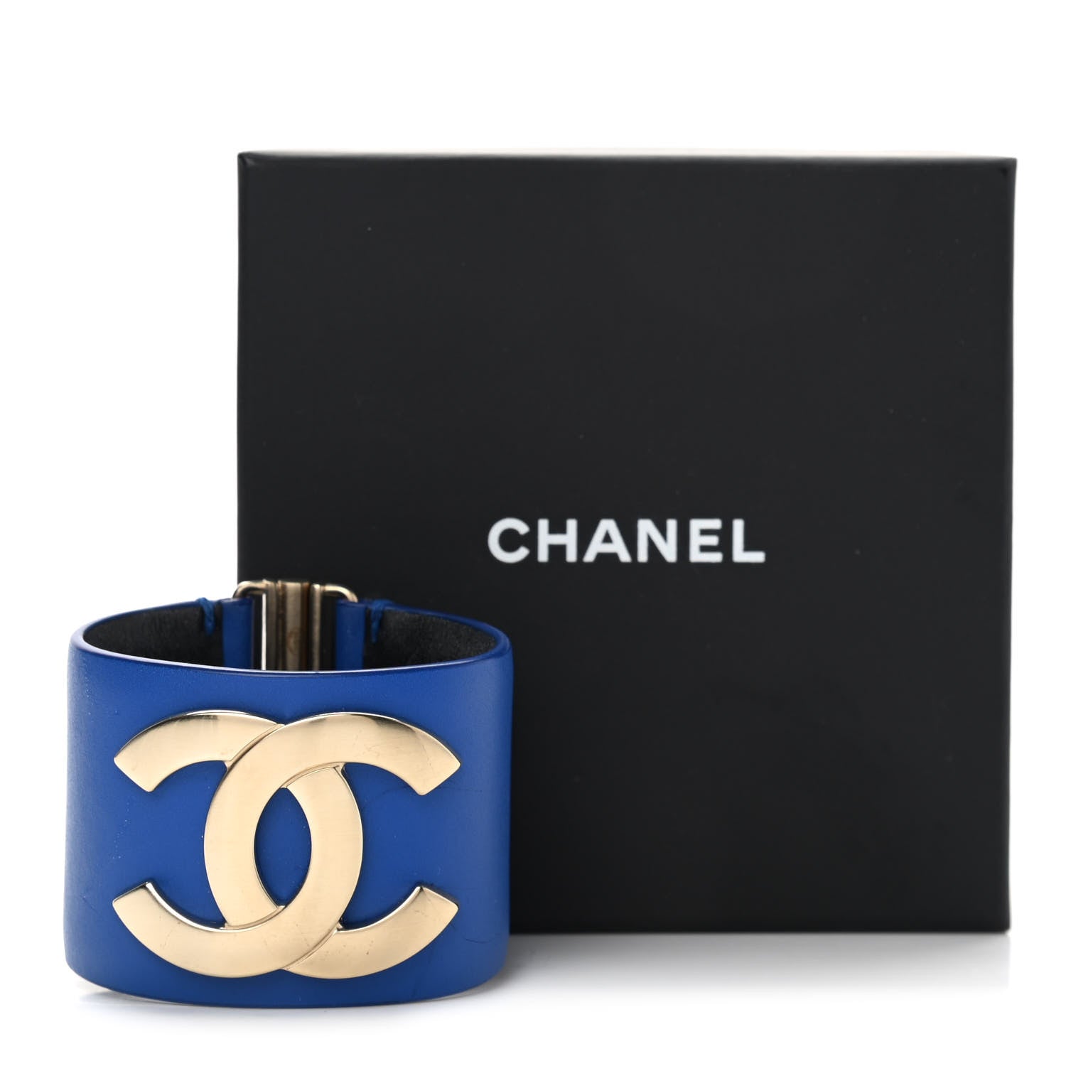 This Elegant Bracelet is Crafted in Blue Calfskin leather and Features a light gold Chanel CC logo and closure.