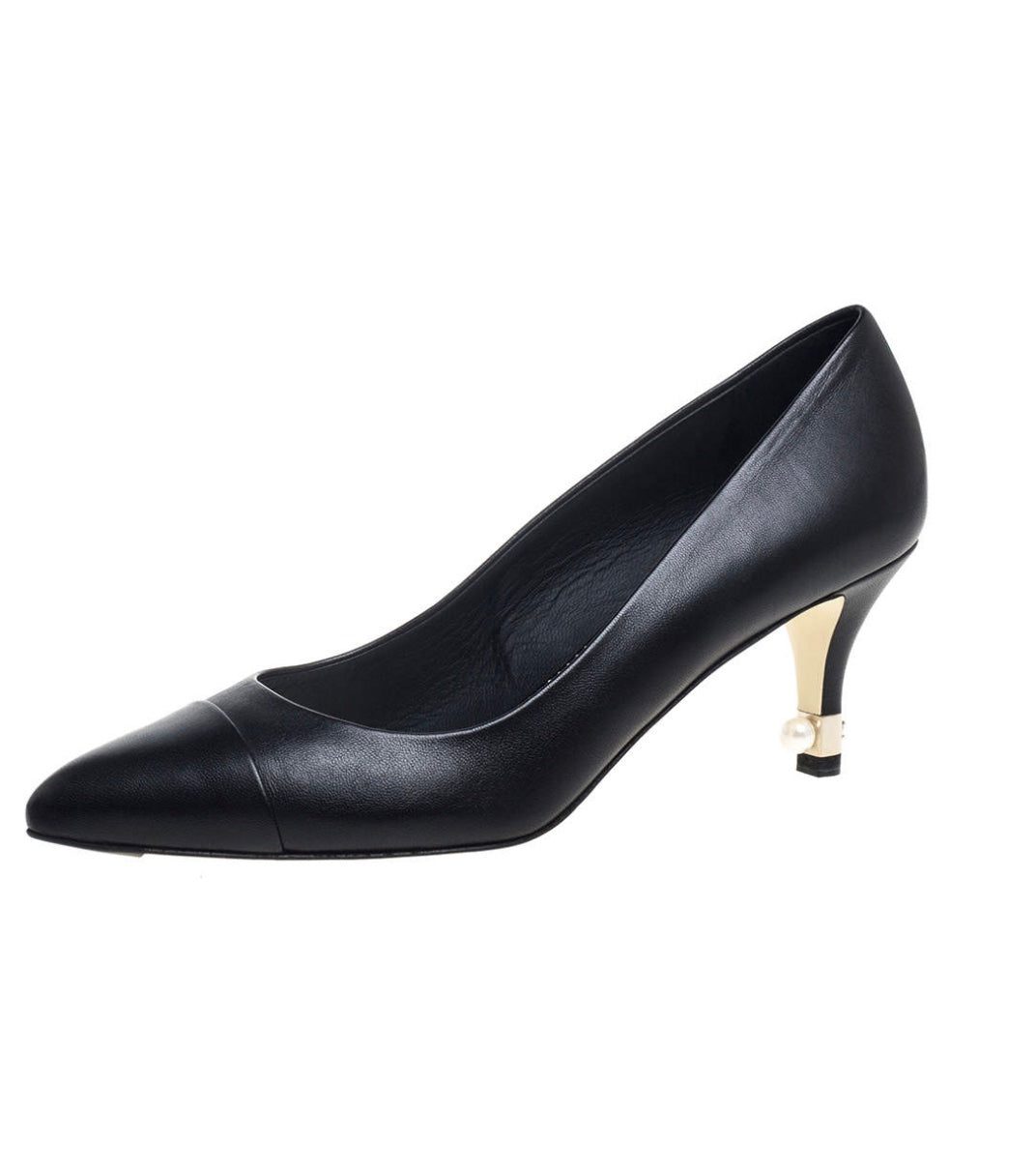 Classic yet fashionable, these black pumps from Chanel are perfect for channeling your elegance. They are crafted from Lambskin leather and feature cap toes and stitch detailing. They also flaunt the CC logo, pearl-embellished, and gold-tone hardware detailed heels. Pair these beauties with dresses and skirts to look chic.