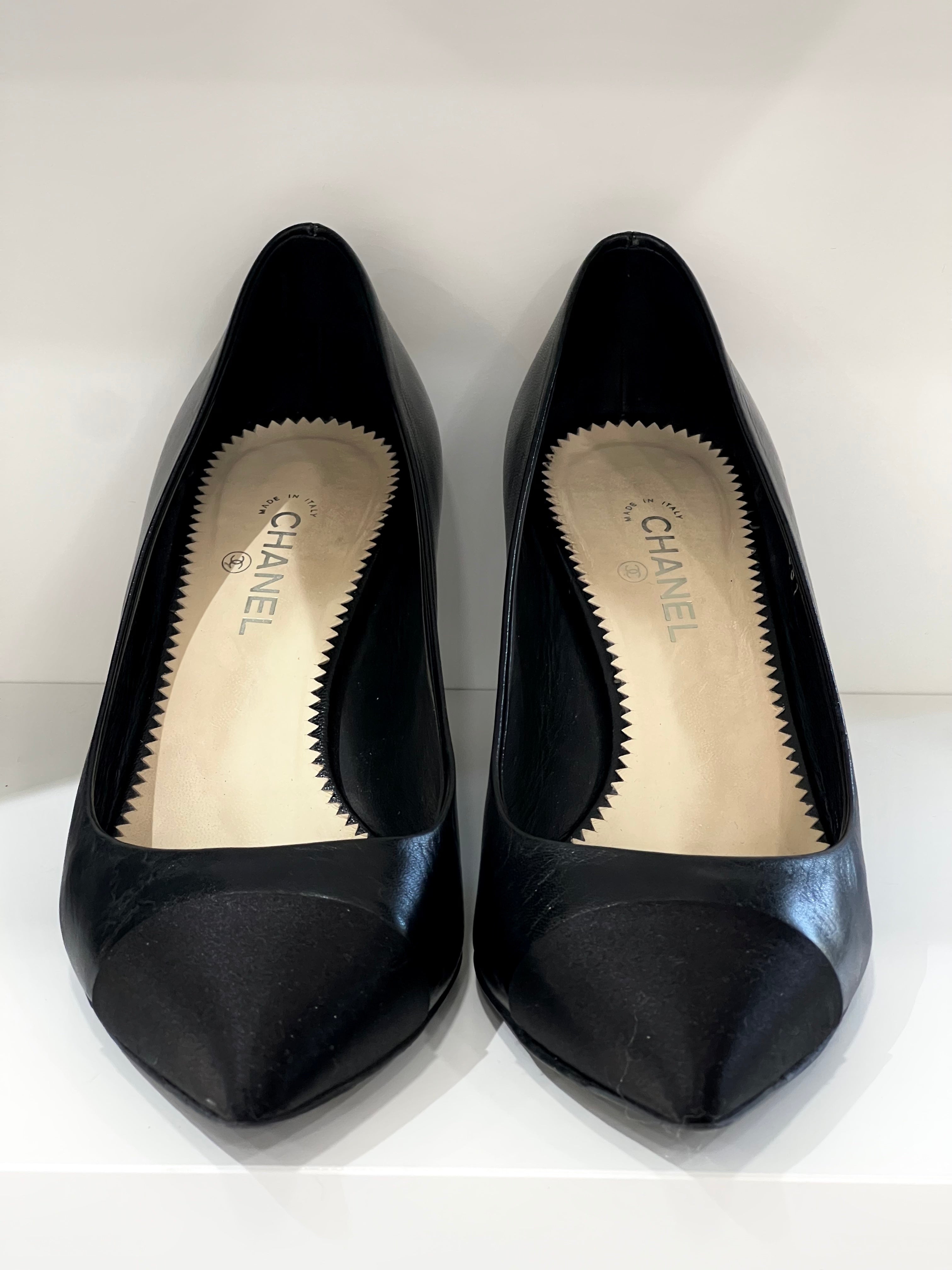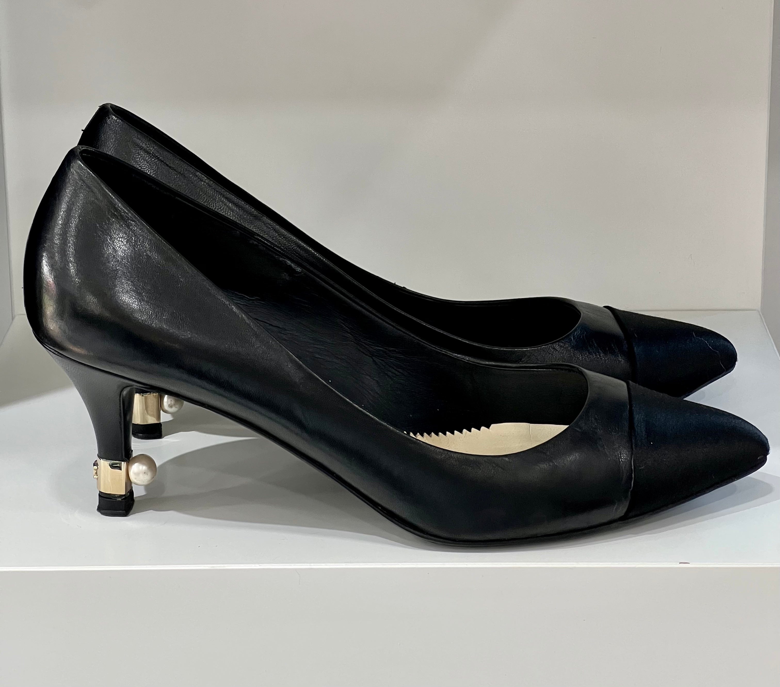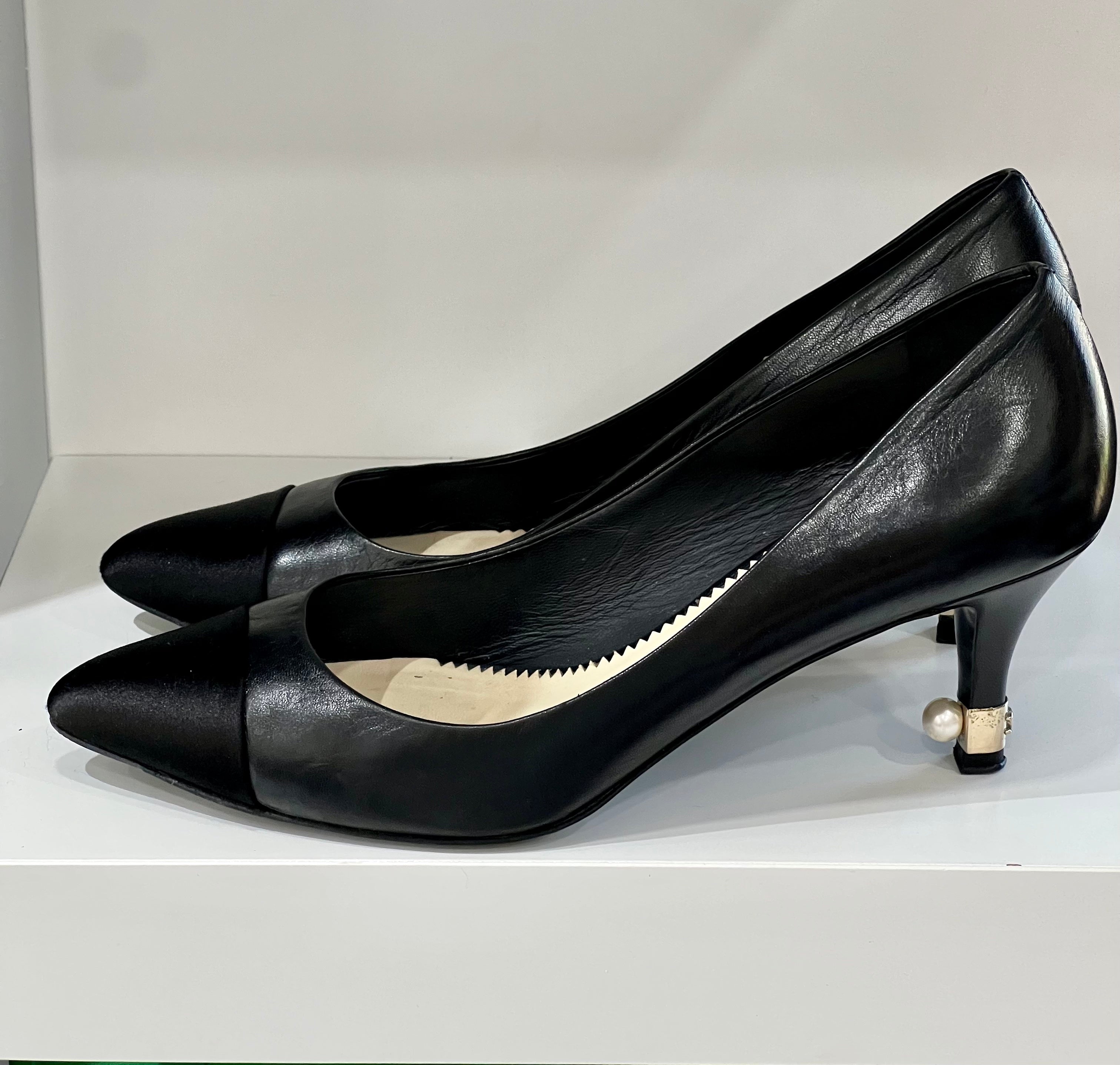 CHANEL CC CAP TOE PEARL EMBELLISHED HEEL PUMPS