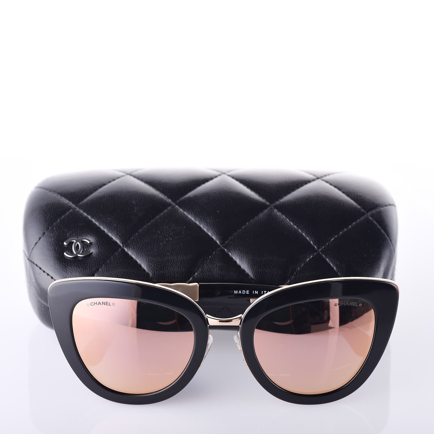 These stunning sunglasses have classic black rims with rose gold trim and gradient tint. The arms feature a quilted rose gold bars with a Chanel CC logo at the earpiece.Â