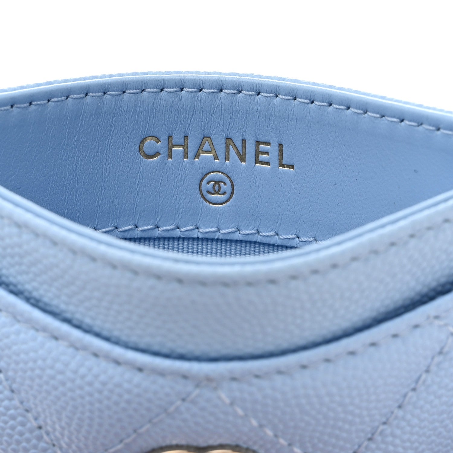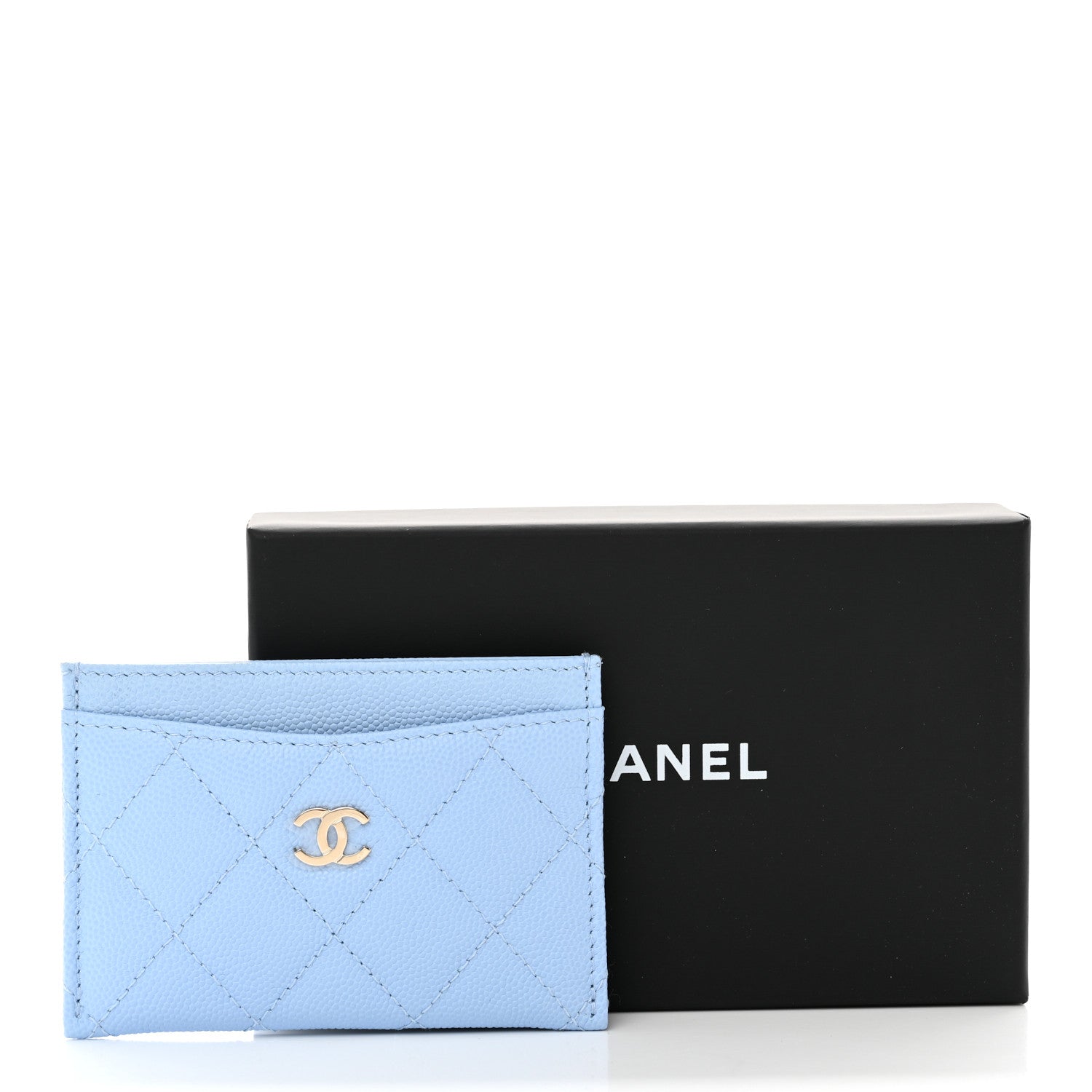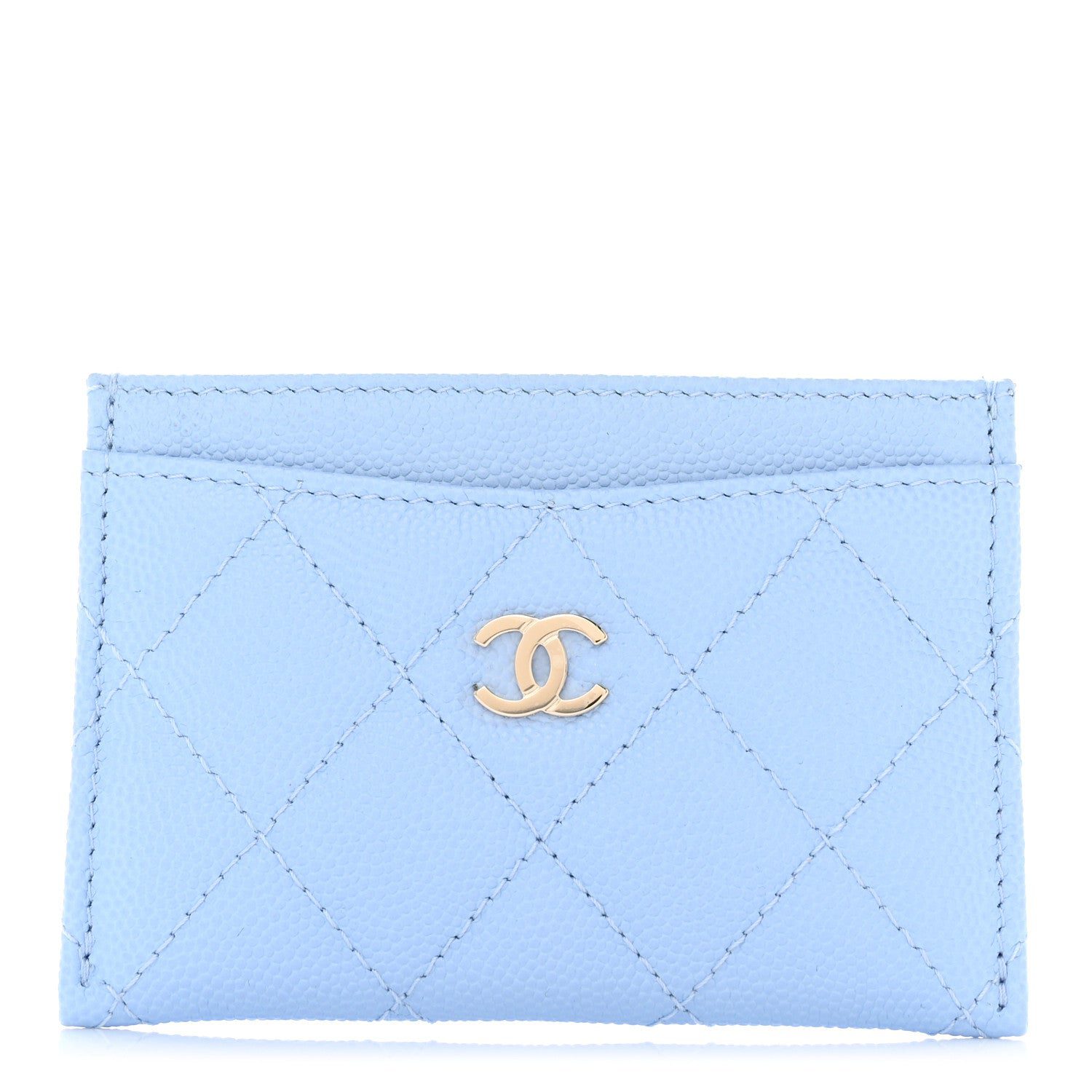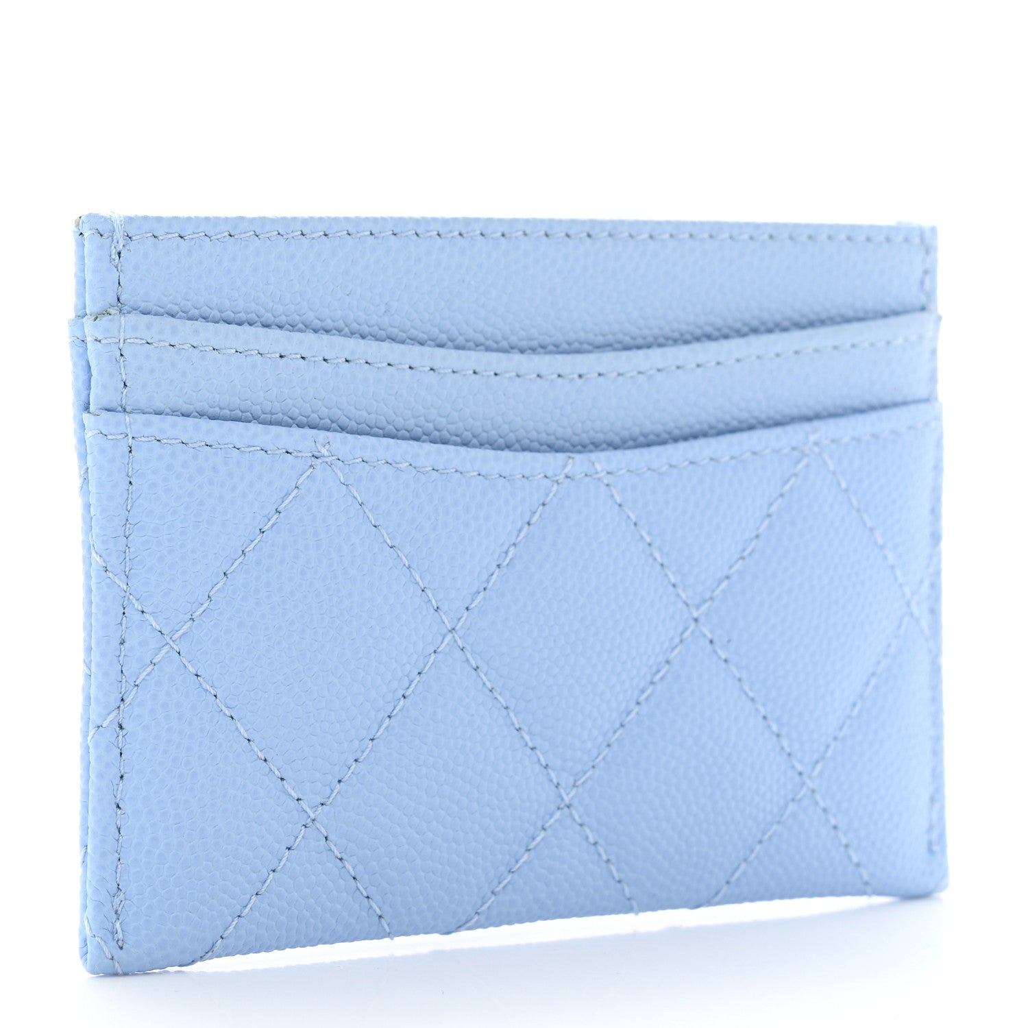 This Stunning and Timeless Chanel Card Holder is Crafted from Luxurious light blue Caviar leather with the signature Diamond quilted pattern. It features a polished light gold-tone CC logo on the front, adding a touch of classic Chanel sophistication.