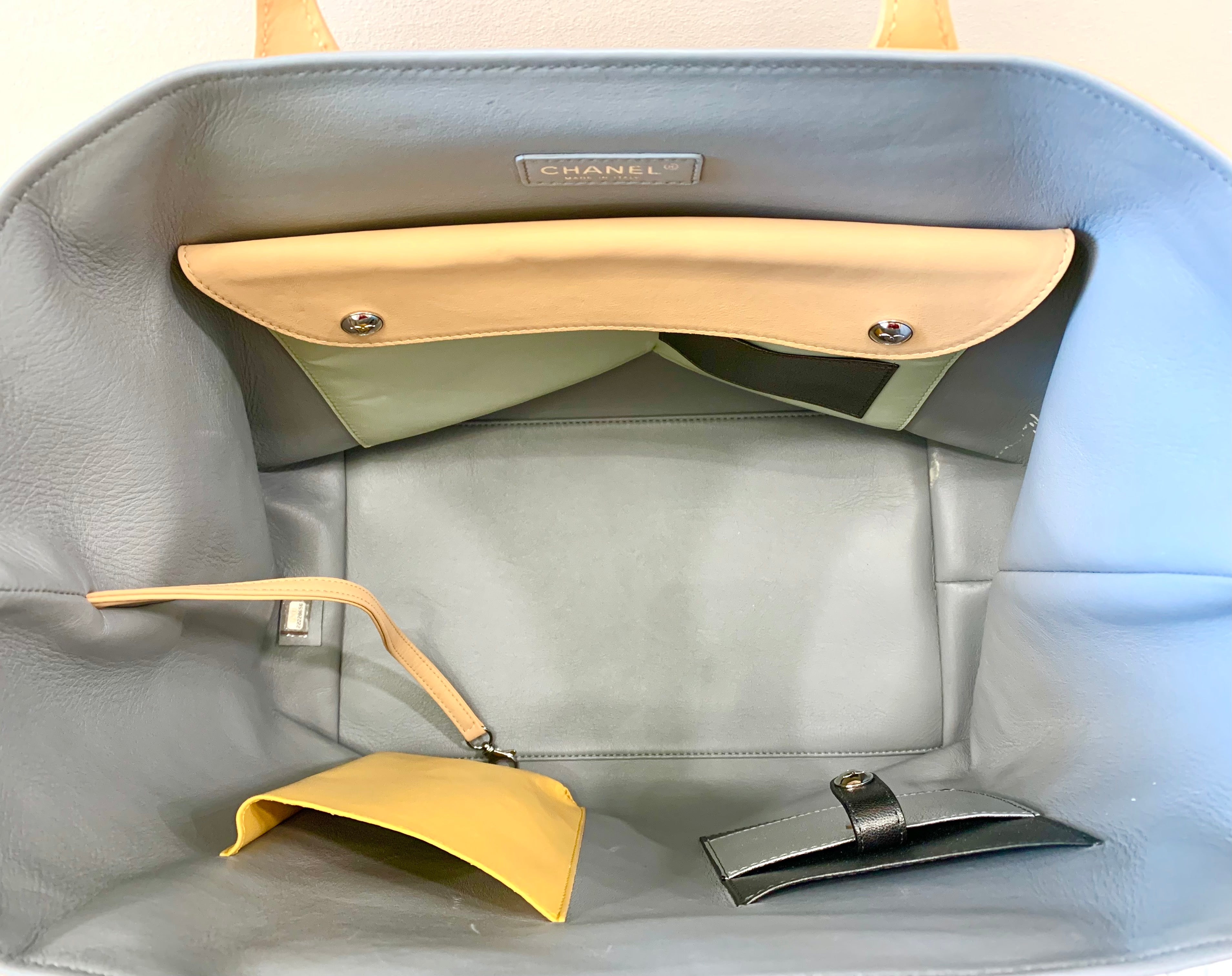 This beige quilted calfskin leather tote bag features a gold-tone CC logo charm, leather handles and leather-laced chain shoulder straps. The leather interior had has one large rectangular snap closure pocket, one large slip pocket and one card holder pocket.