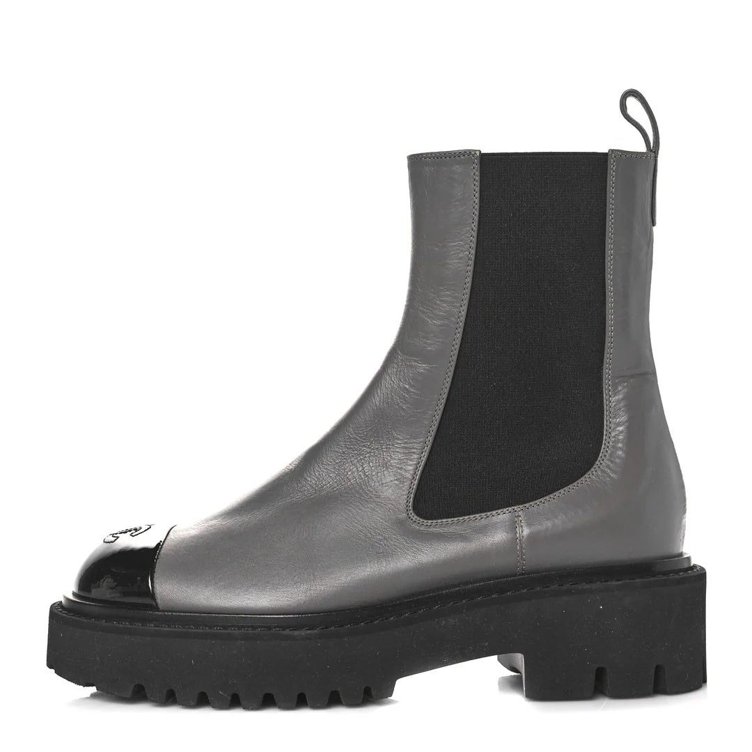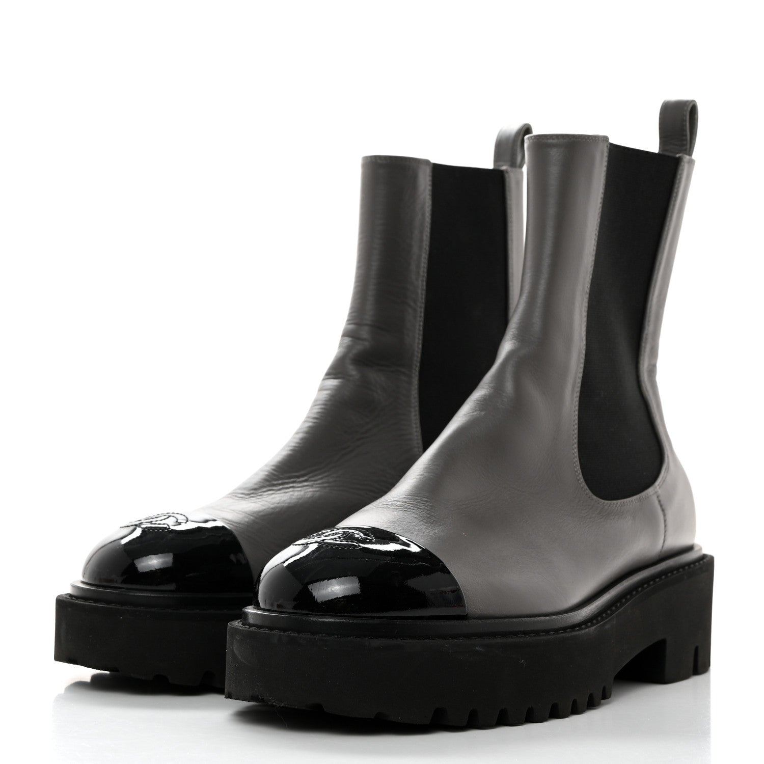 Super Stylish CHANEL Crumpled Calfskin Patent Cap Toe Chelsea Boots in Gray and Black.