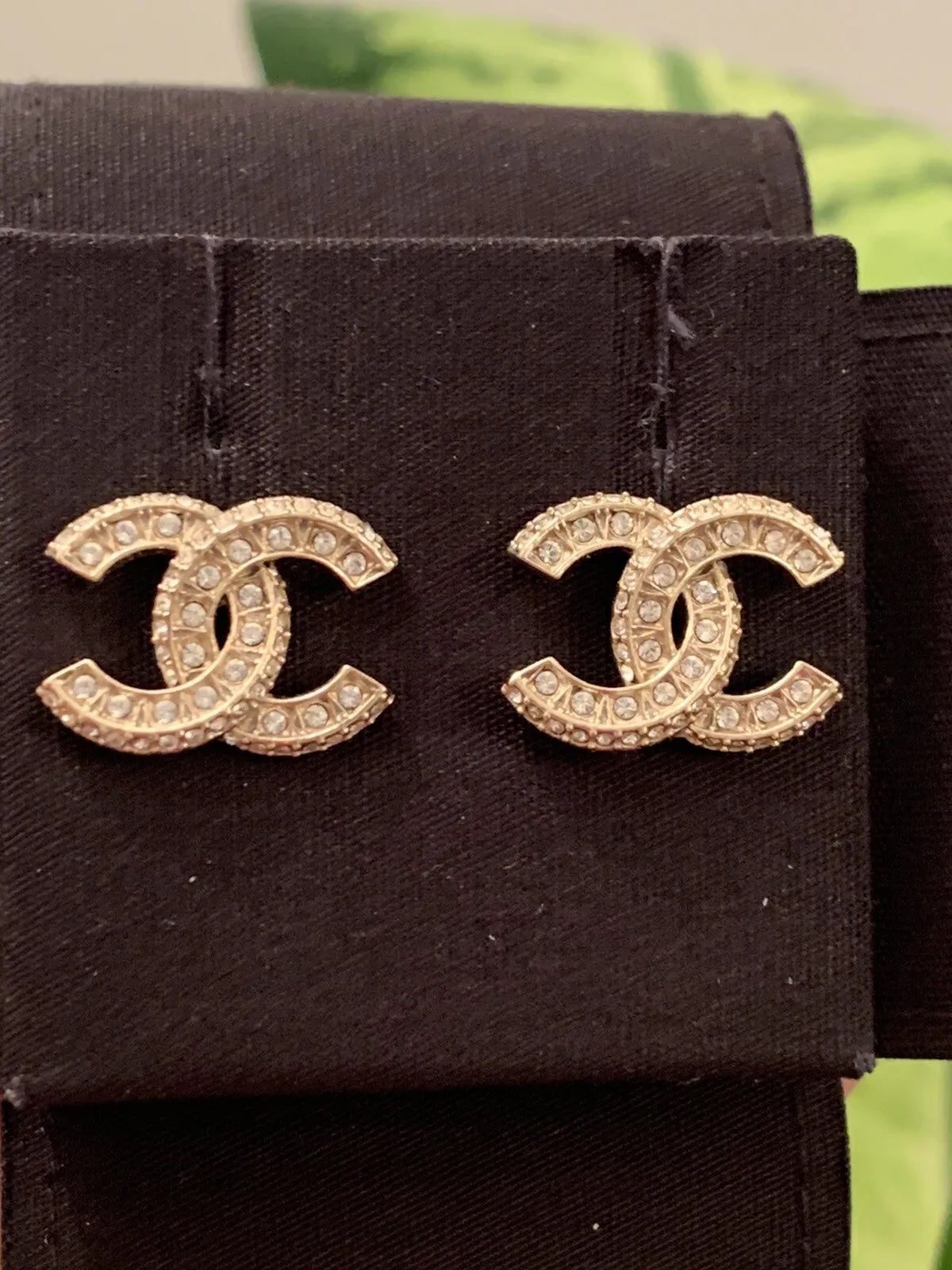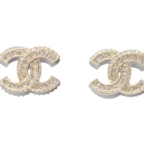 CHANEL Crystal CC Earrings in Light Gold. These earrings feature gold-tone Chanel CC logos embellished with clear crystals.